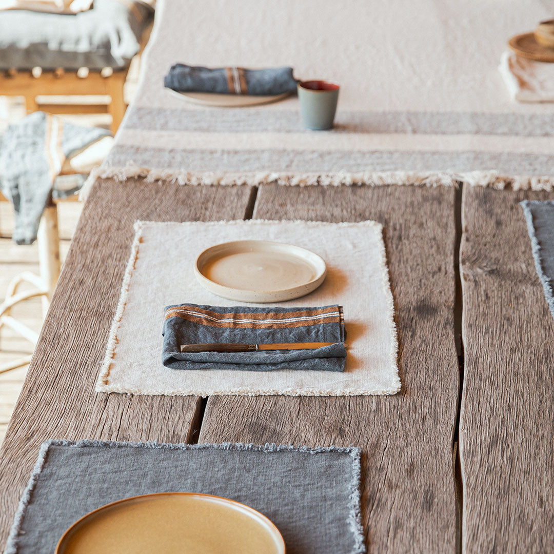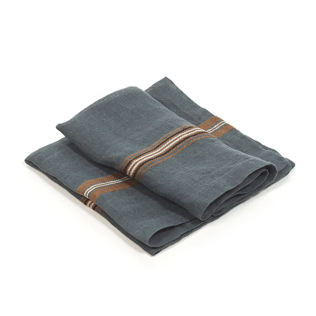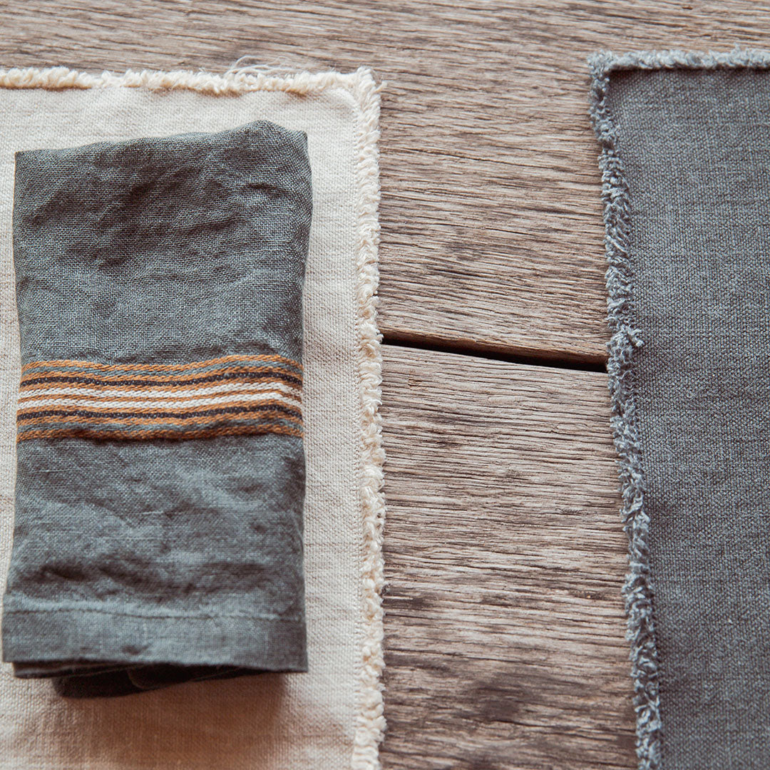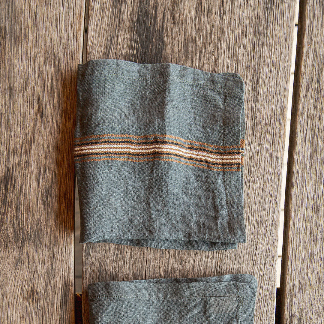 グレイッシュなブルーグリーンに、キャメルやオイスター色のラインが効いたLIBECOのナプキン「ケア」。洗いのかかったガーゼ生地は、使いはじめからふんわり柔らかな風合いです。いつもの食卓にセットするだけで、華やかなテーブルコーディネートになります。ふきんやお弁当包み、ハンカチとしてもおすすめです。