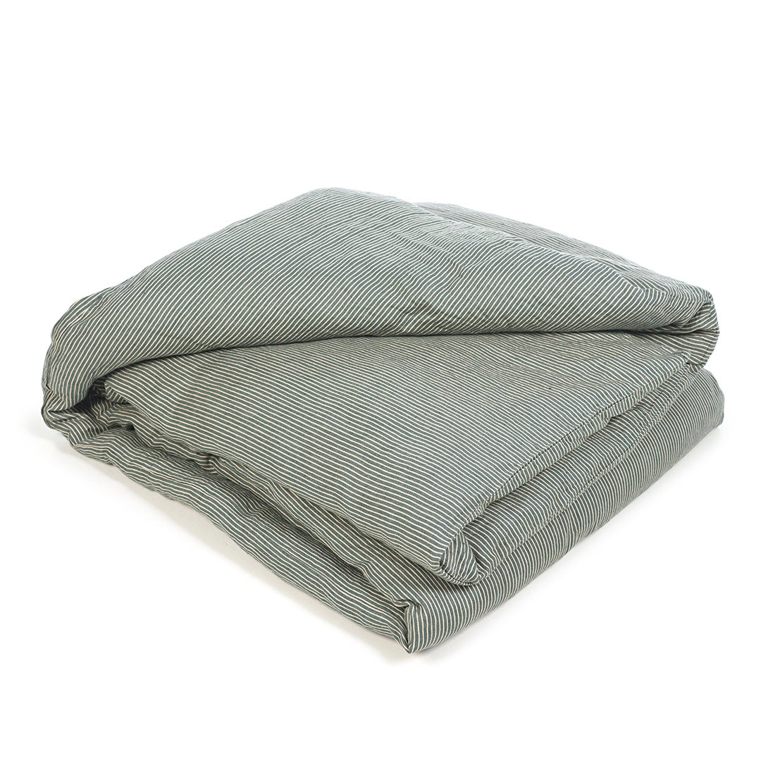 LIBECOのデュベカバー、セーラーズ。エーゲ海から色付けされた、深いブルーグリーンのストライプが爽やかなベッドルームを演出します。見た目にも涼やかに眠れそうなインテリアを楽しんで。