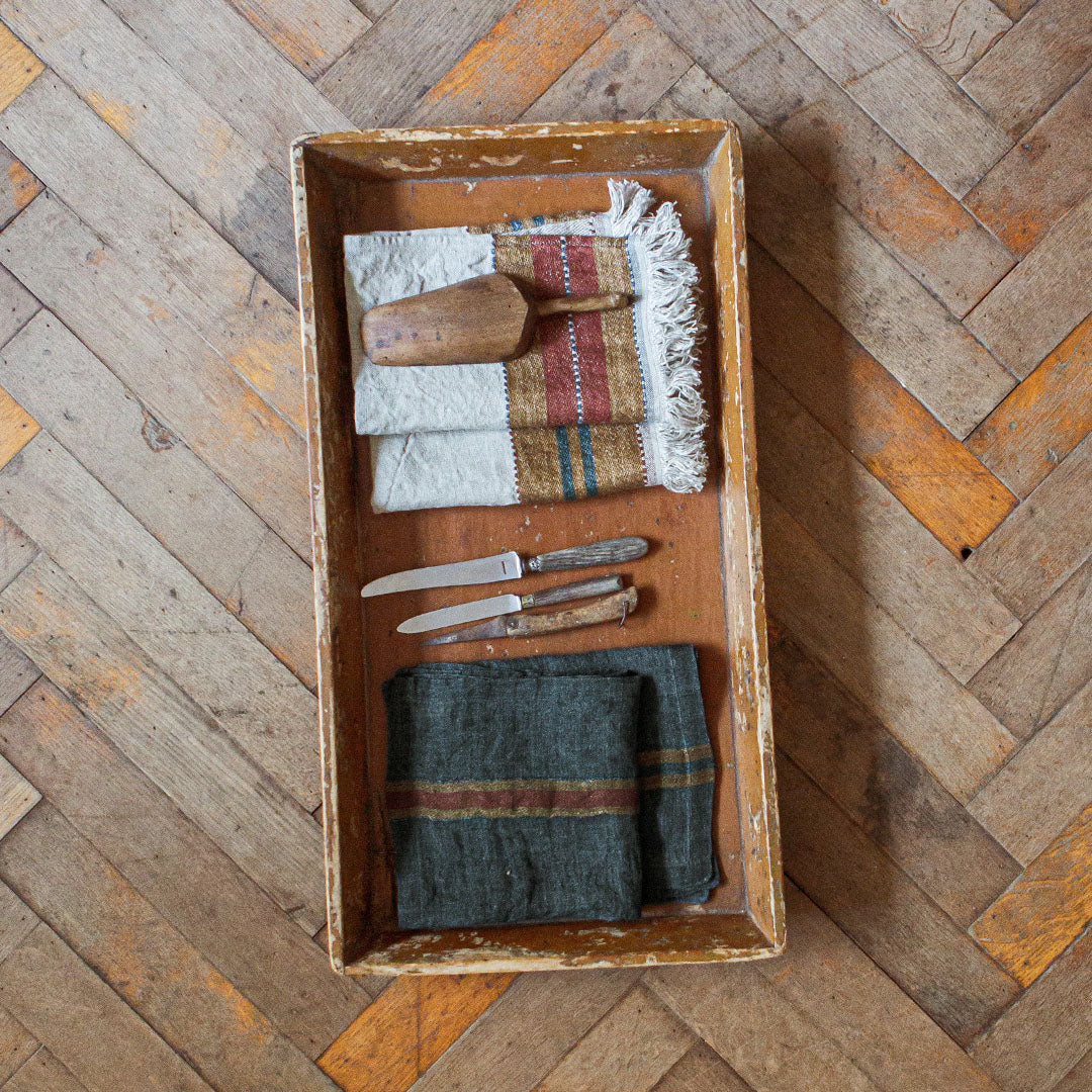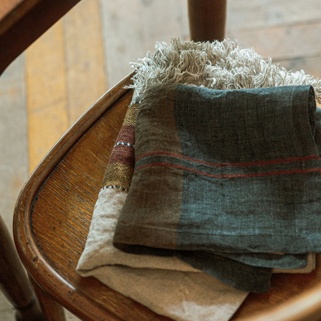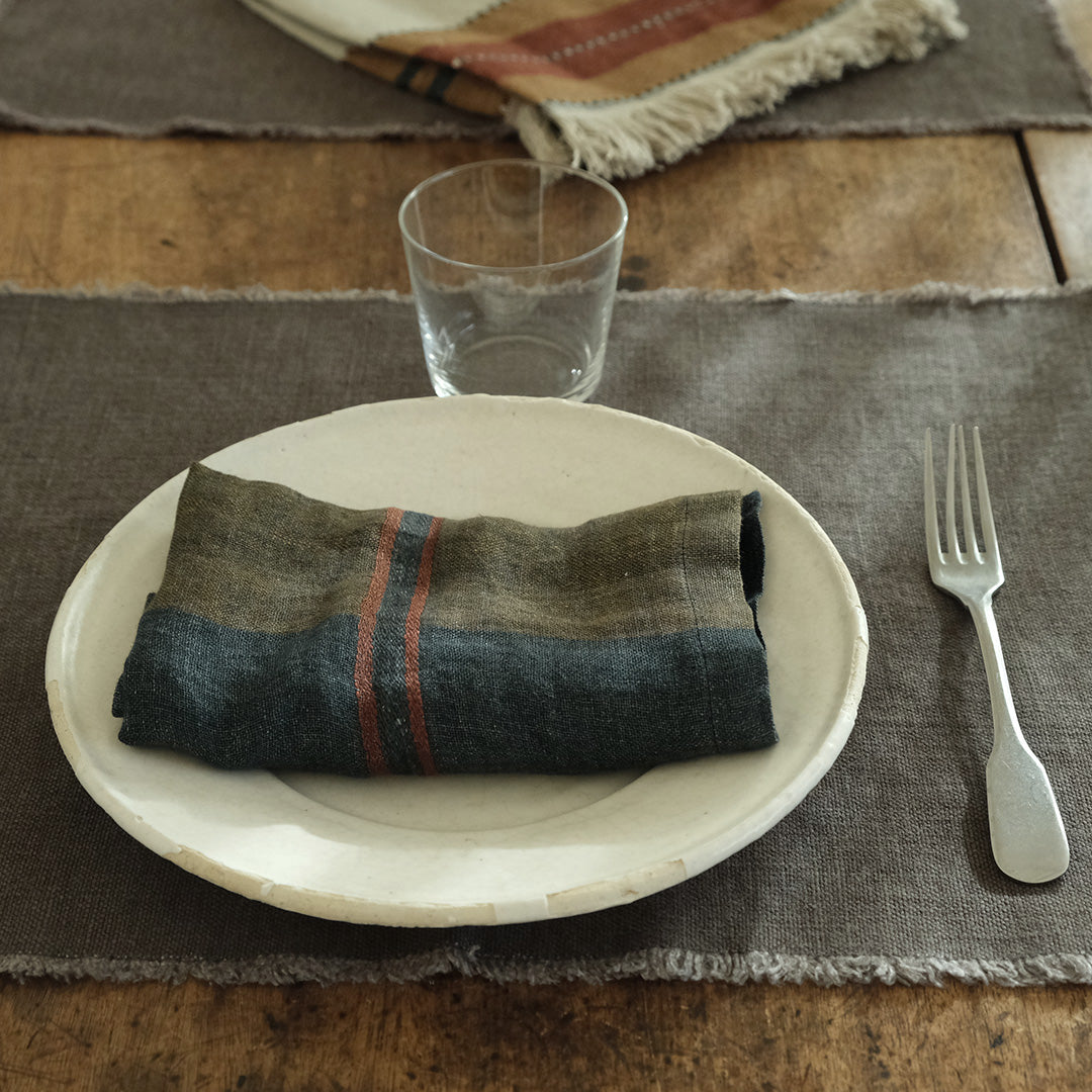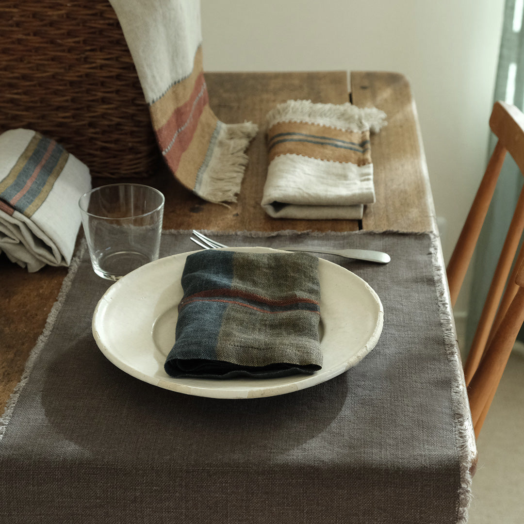 ダークなブルーグレーに、キャメルやバーガンディーのラインが効いたLIBECOのナプキン・ハムレットチェック。洗いのかかったガーゼ生地は、使いはじめからふんわり柔らかな風合いです。