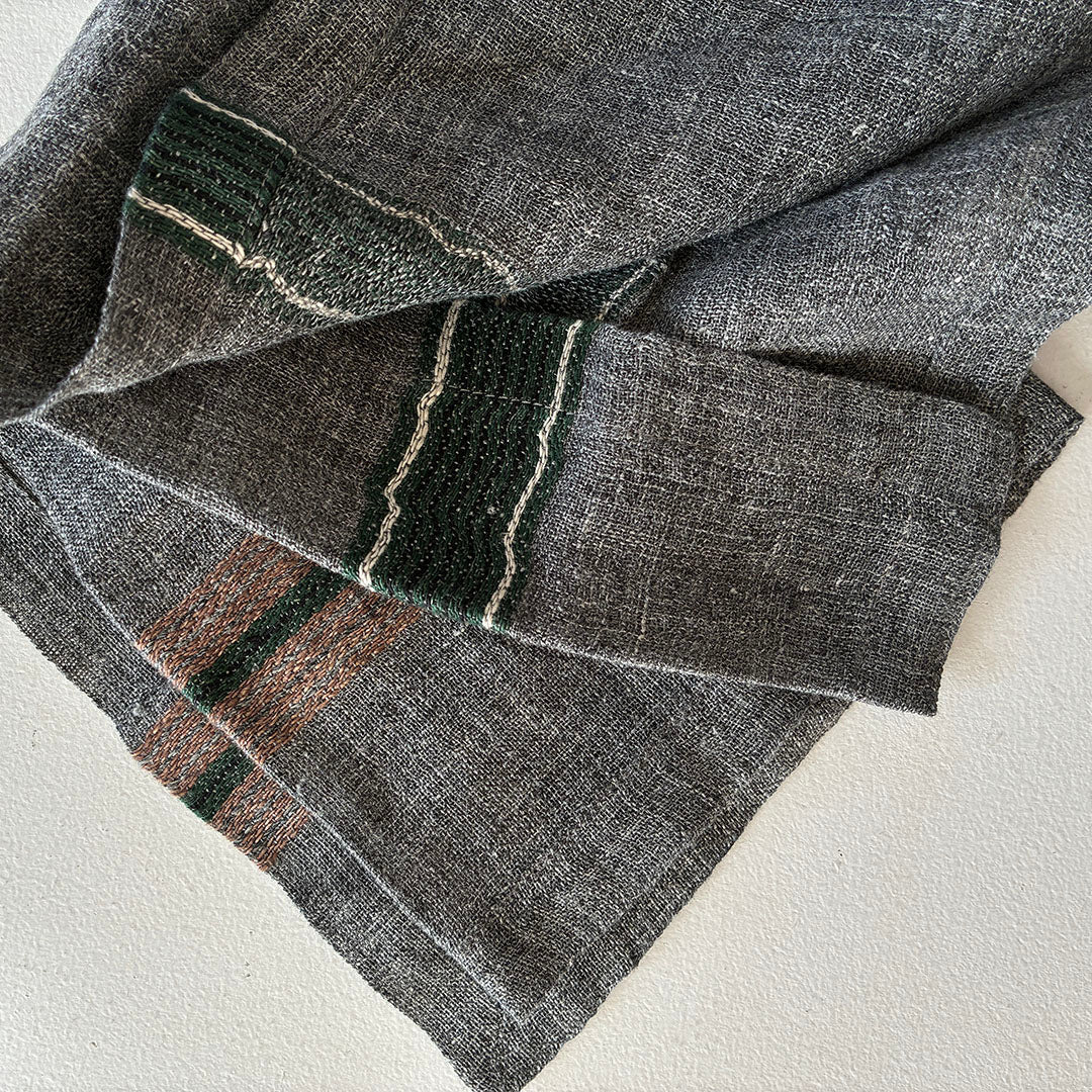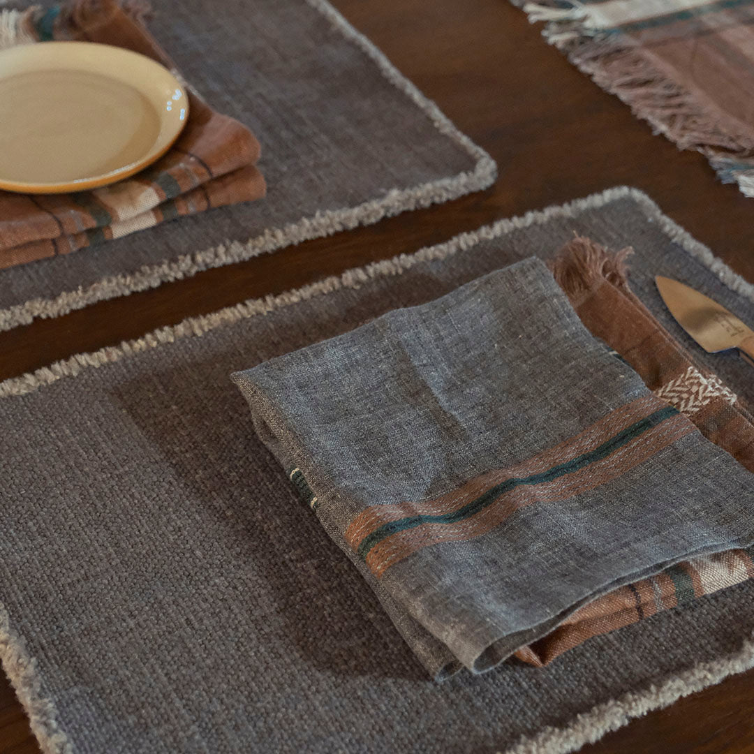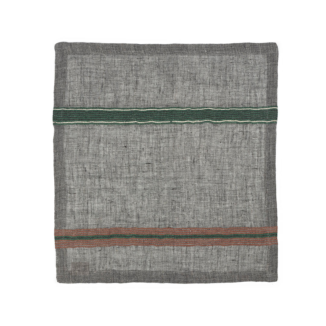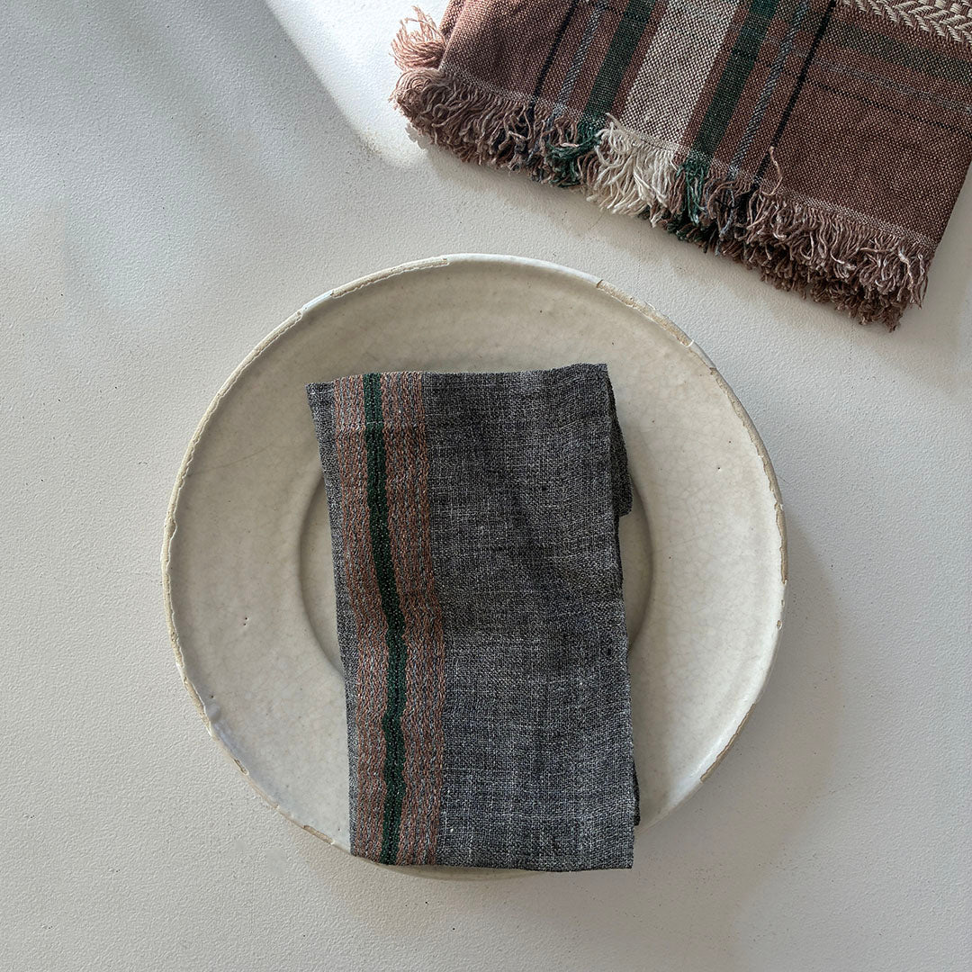 チャコールグレーに、ブラウン・グリーンのストライプが配されたLIBECOのナプキン「アーロ」。使いはじめから柔らかく、透け感のある軽やかな織が特徴でハンカチとしてもおすすめのひと品。