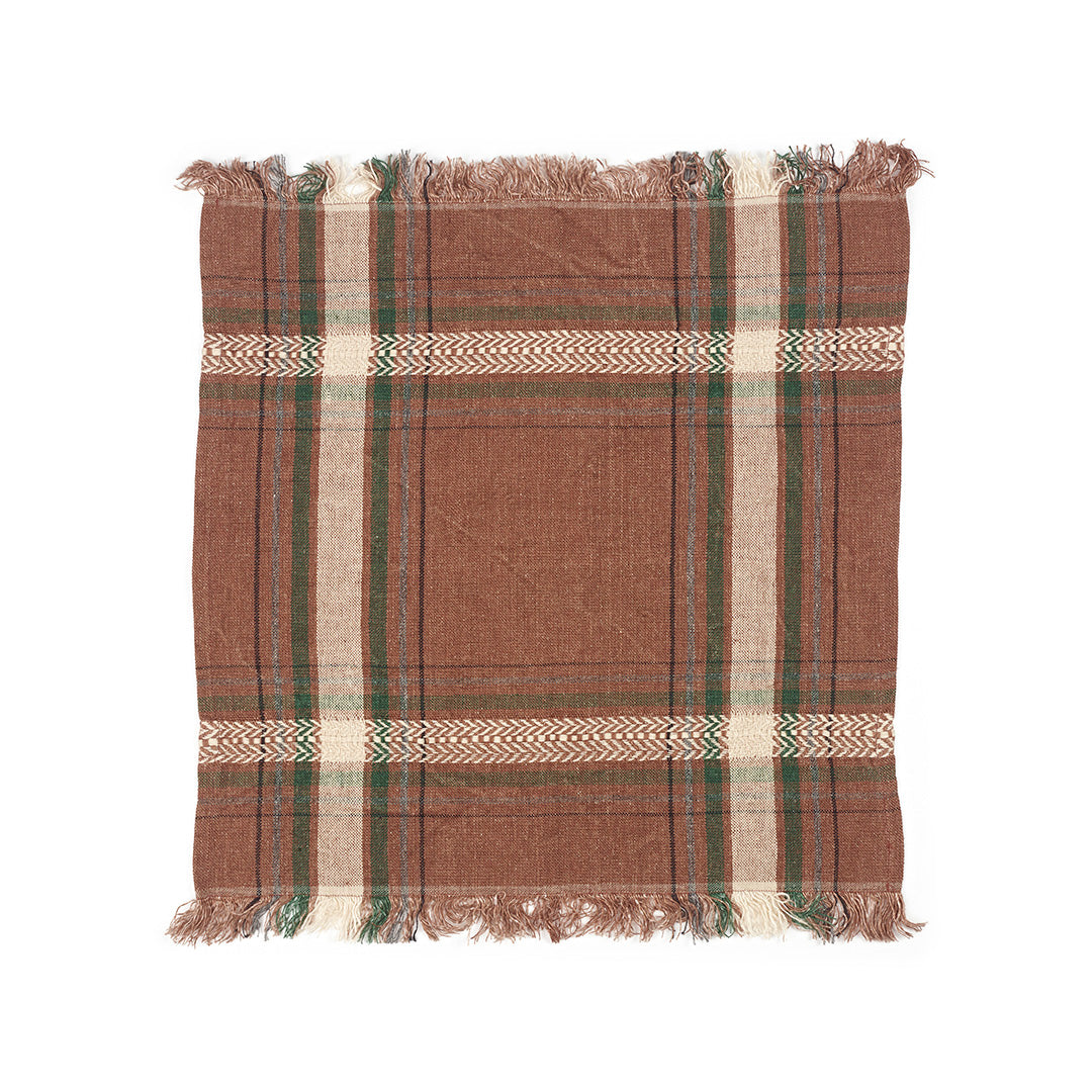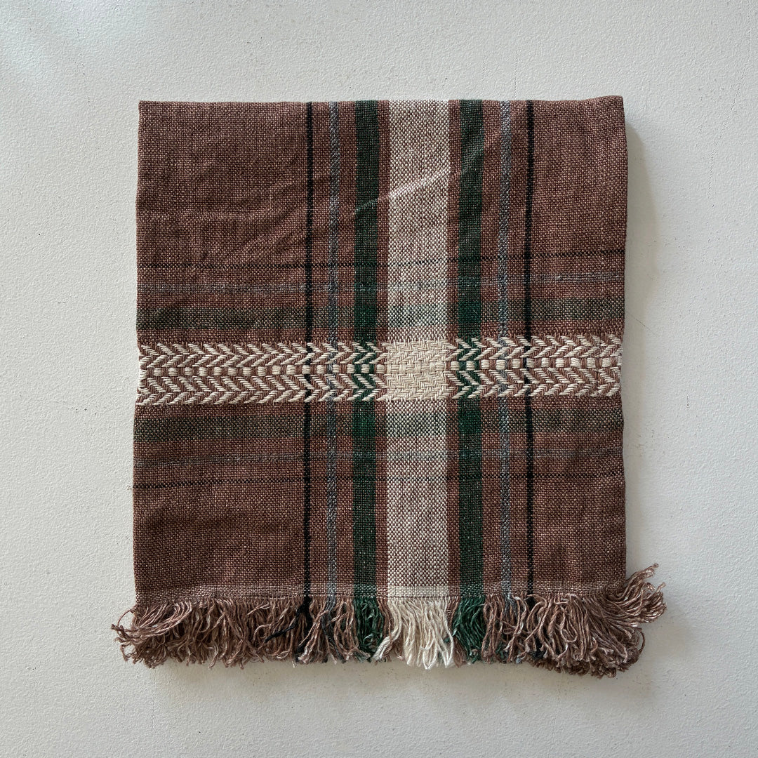 レーシンググリーン・チャコール・ブラック・オフホワイトのラインが、シエナブラウンに浮かぶオーソドックスなチェック織のリネンです。サイド(天地)にはヘリンボーン模様のストライプが施されています。