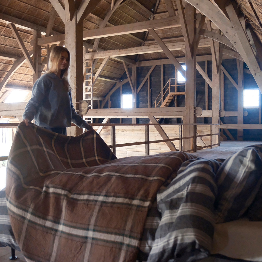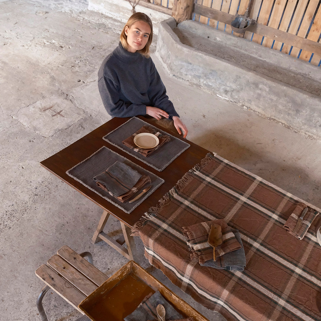 ローワンは当初生地として開発されましたが、調整を重ねるうちにデザイナーがその魅力に惹かれ、ホームリネンコレクションとしても展開されました。「これは時を越えて愛され、きっと心に長く残るチェックになる」という想いが込められています。