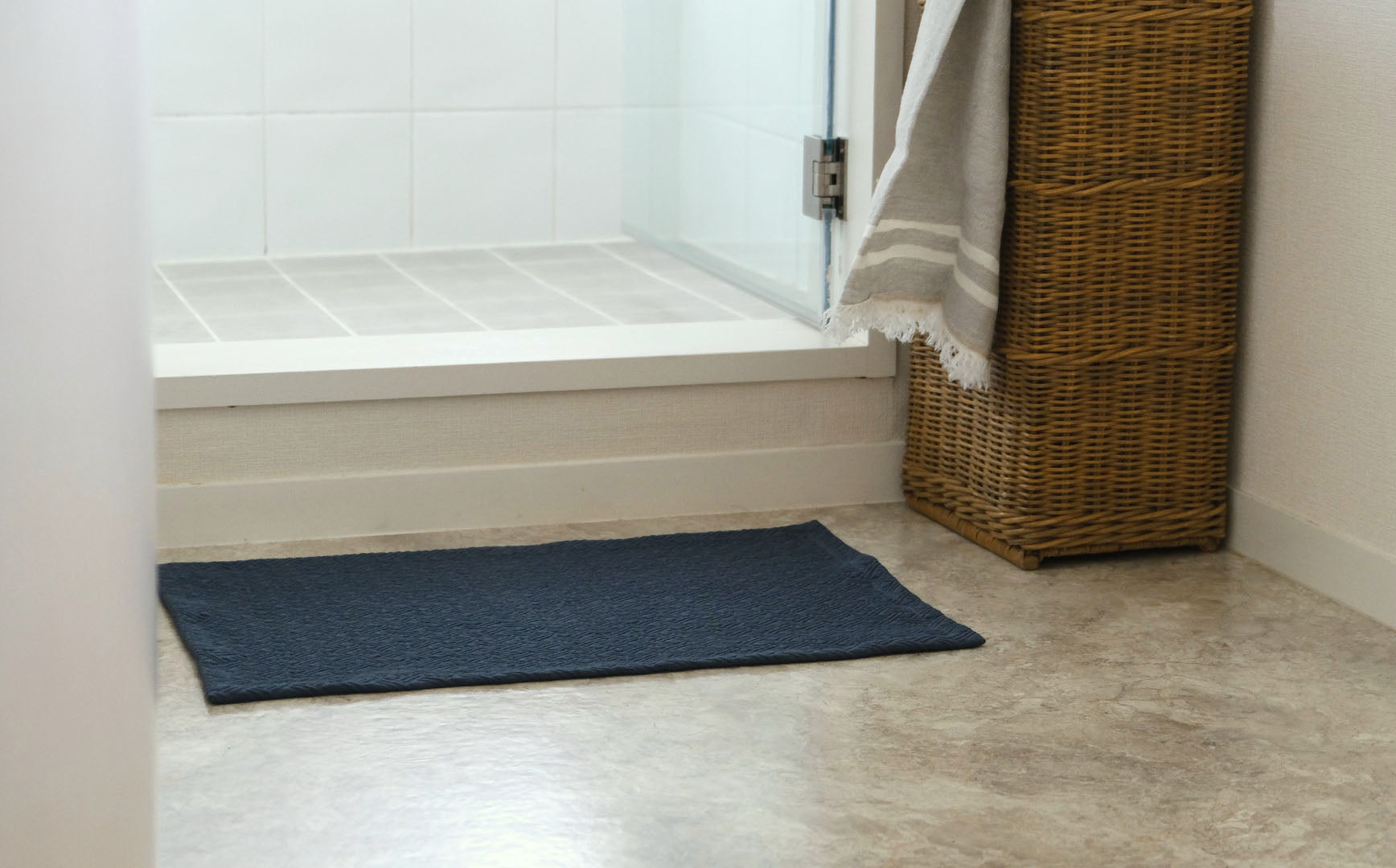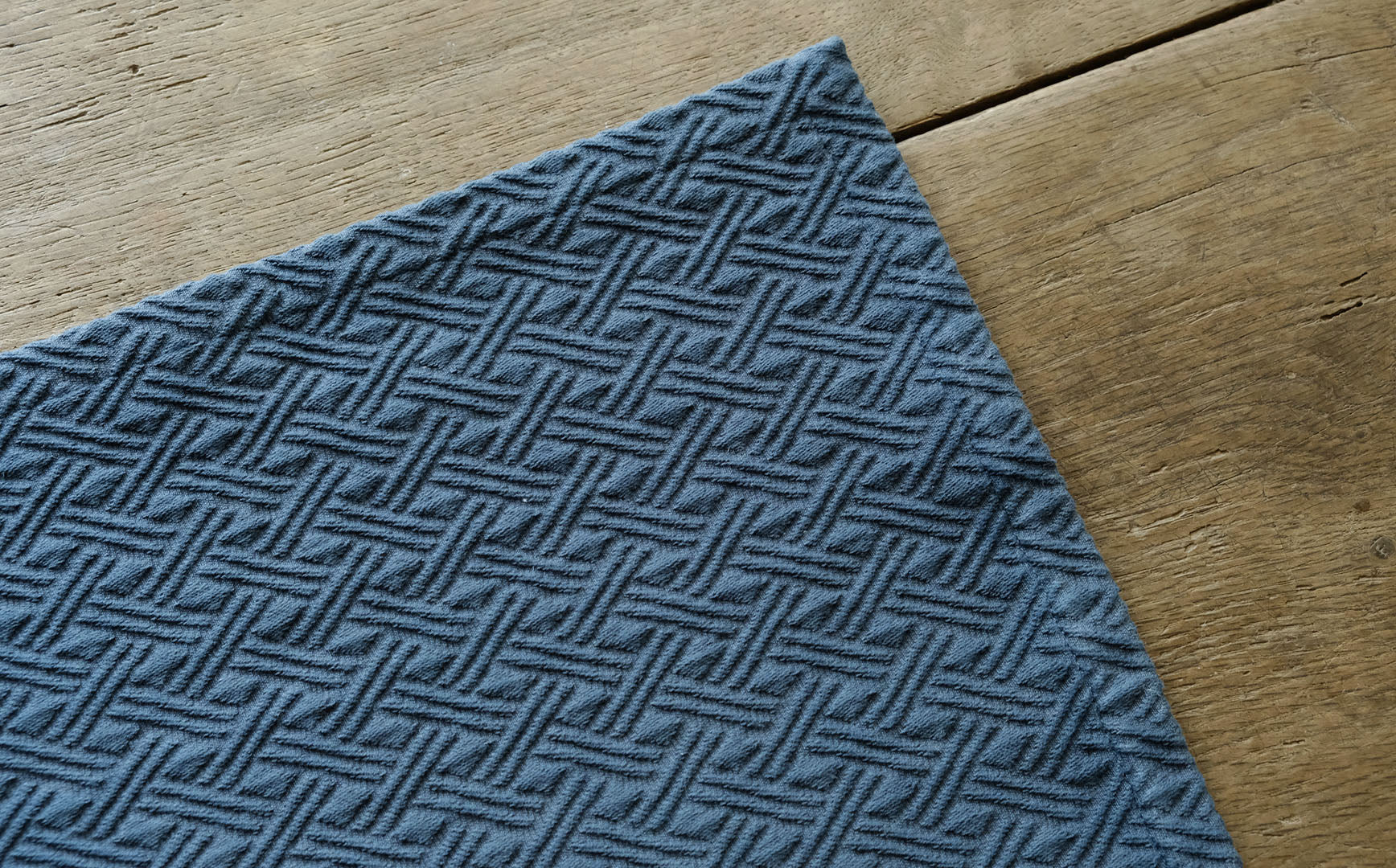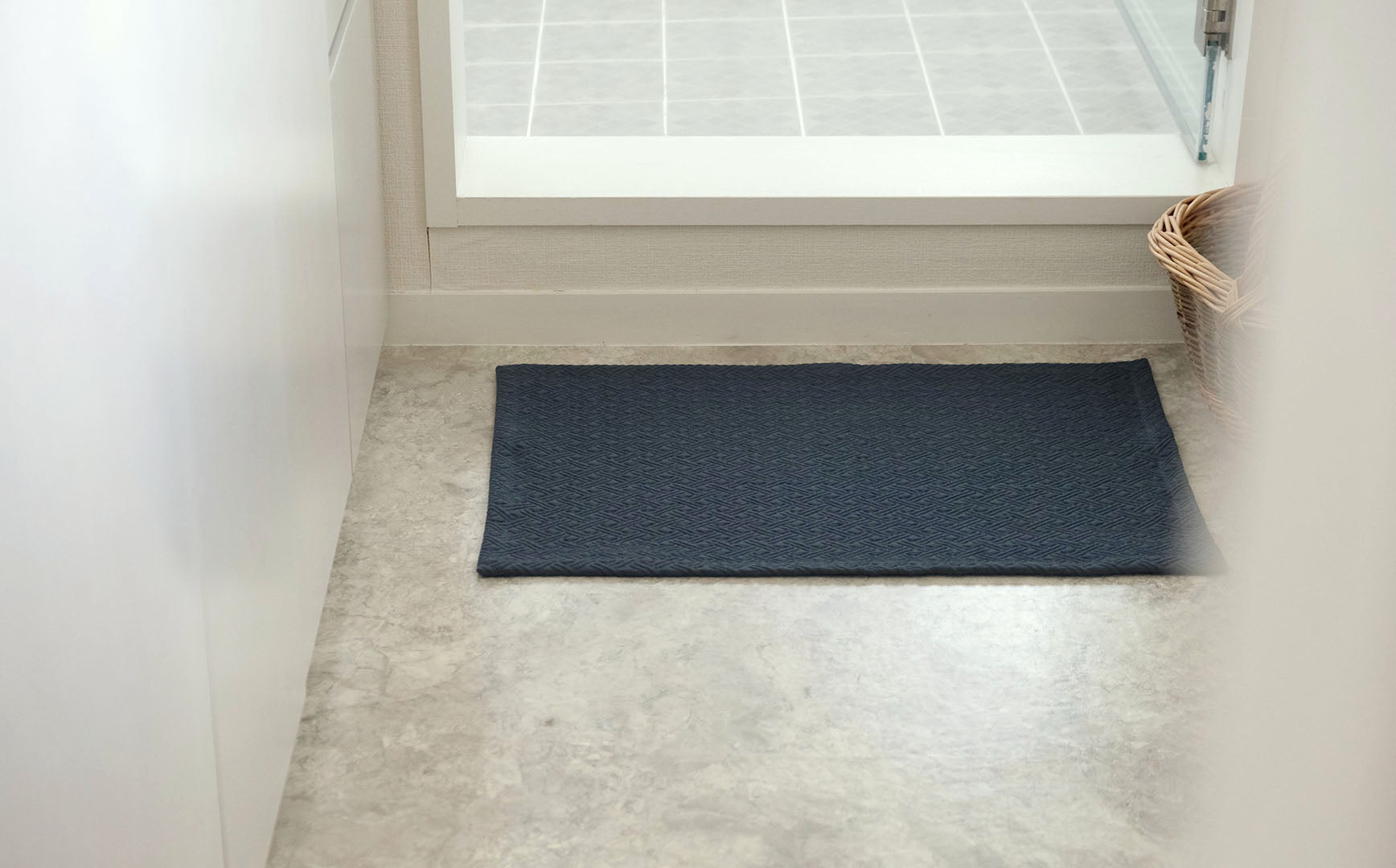 カラーは洗面所に馴染みやすいダークブルー。汚れが目立ちにくく、立体的なあたたかみのある織り柄によって水跡も気になりにくいカラーです。