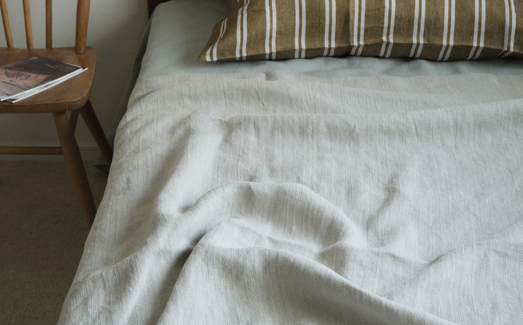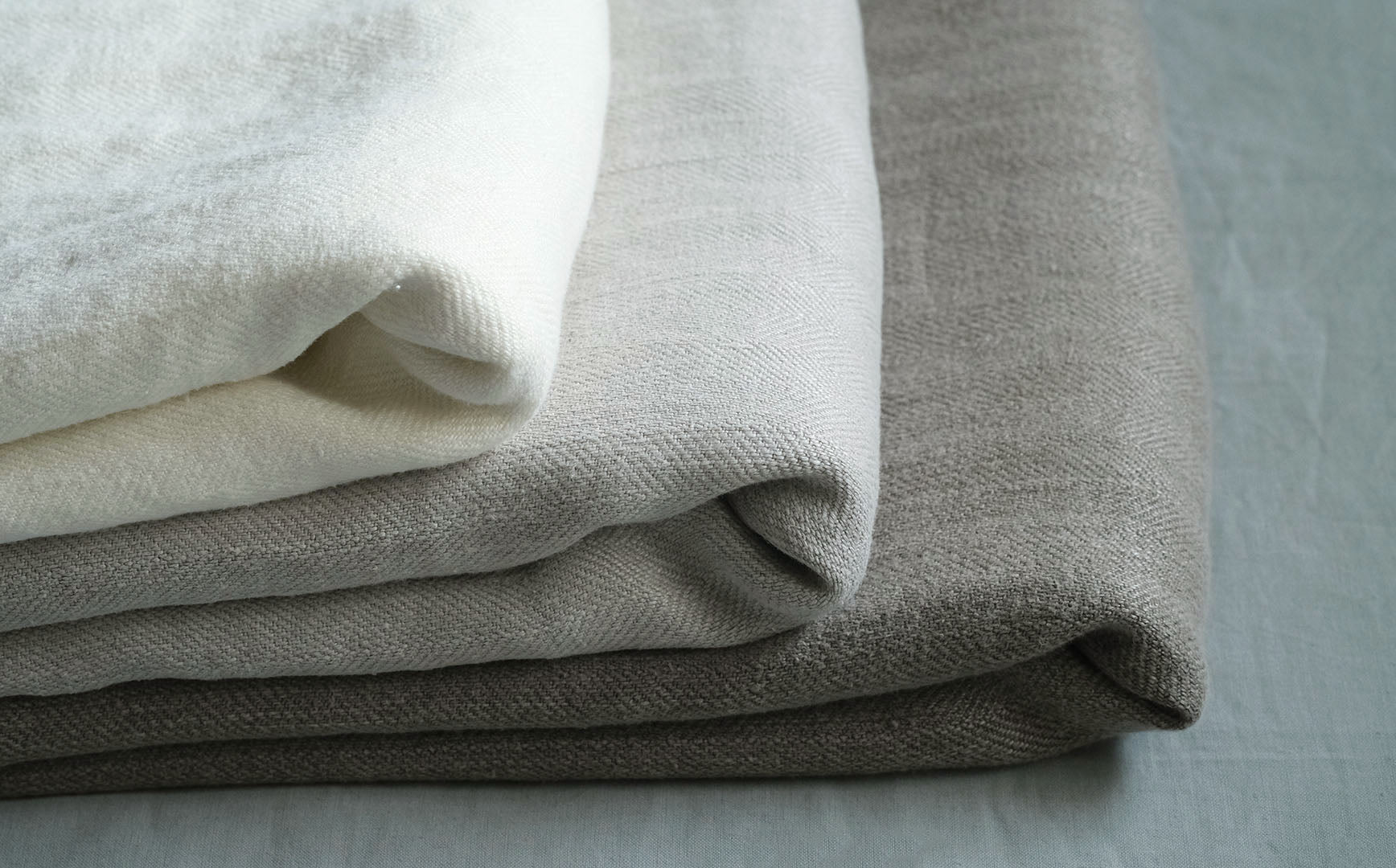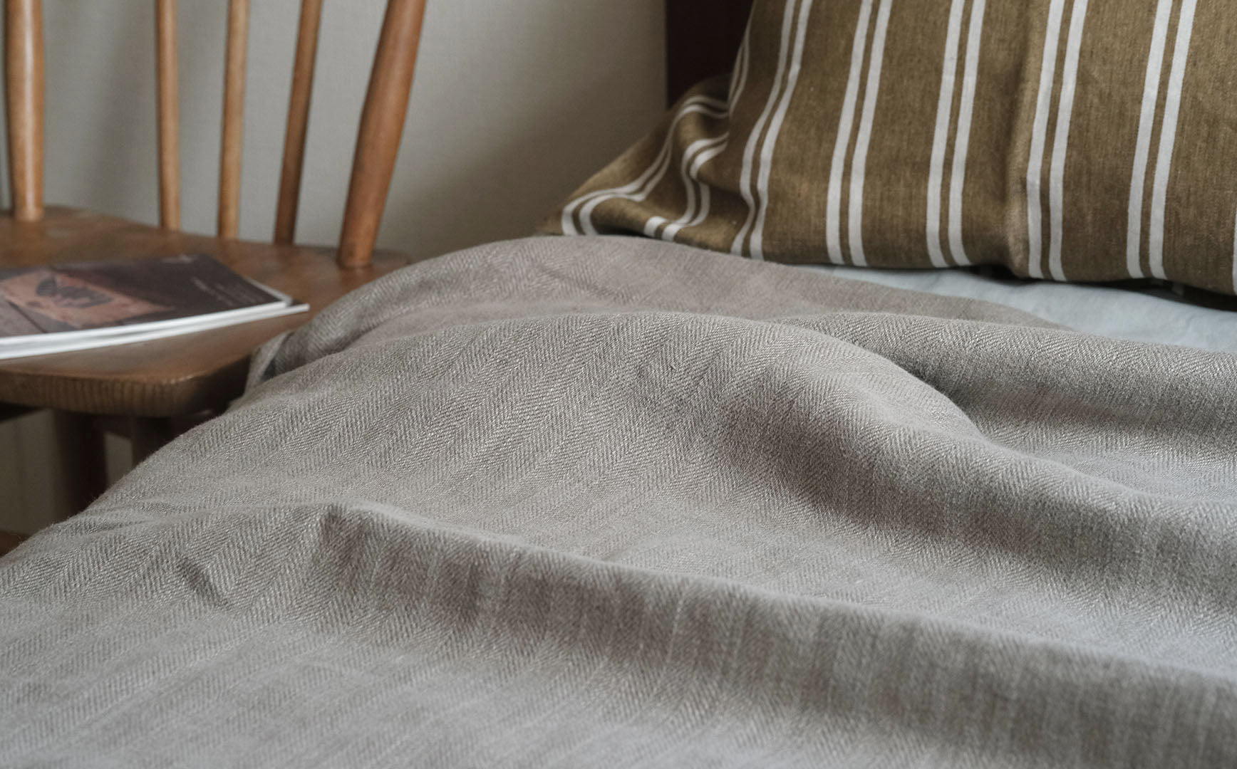 くったりとした肌触りに繊細な凹凸で表現されたヘリンボーン織に惹かれ、これはベッドリネンにぴったり、ブランケットにしたいと感じて選びました。