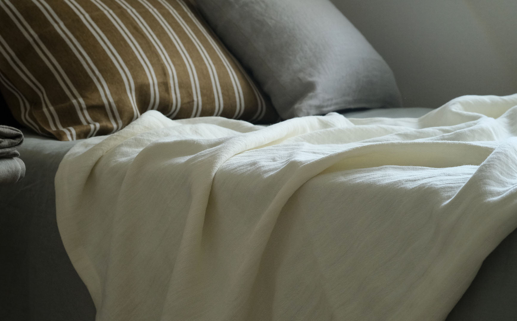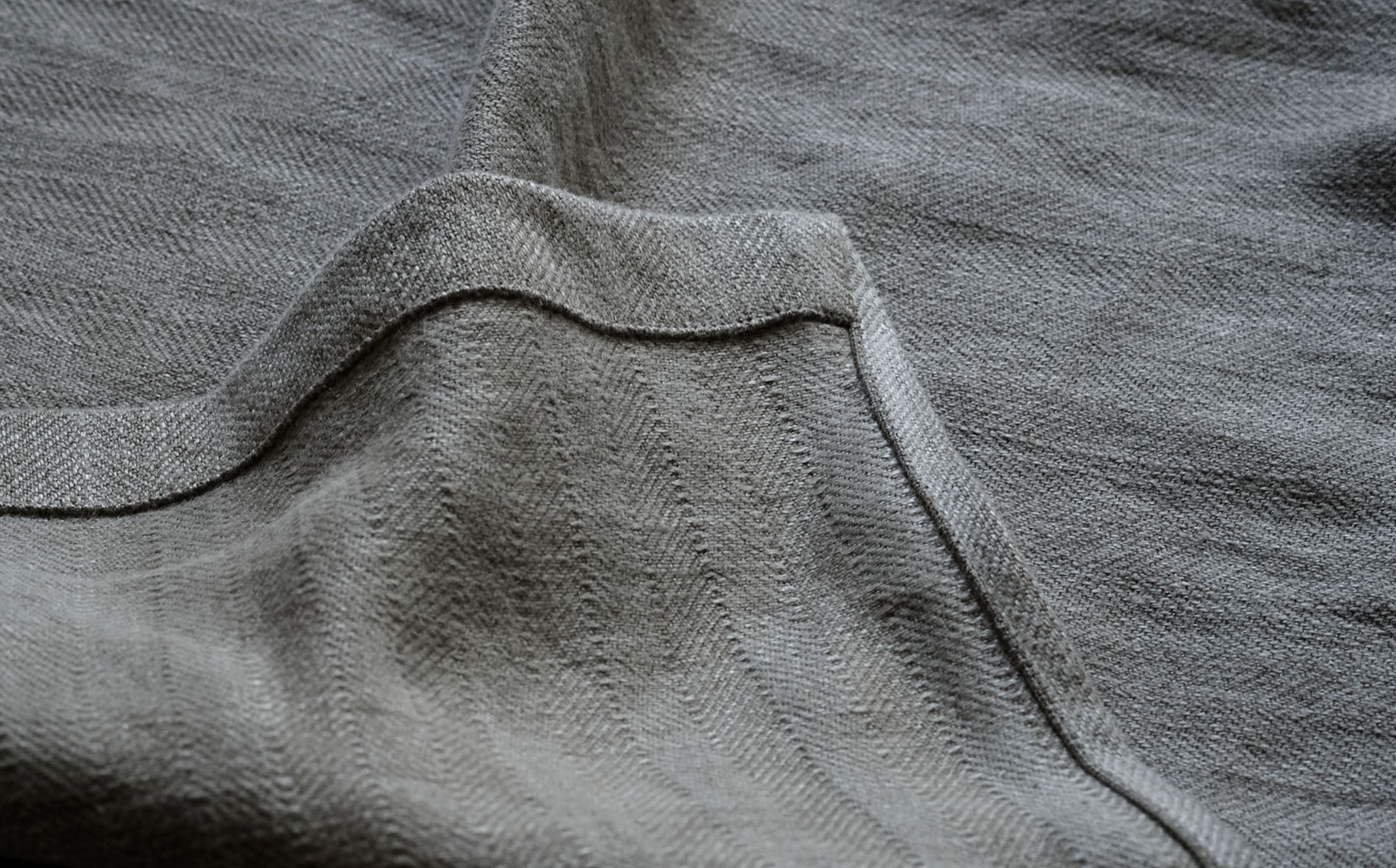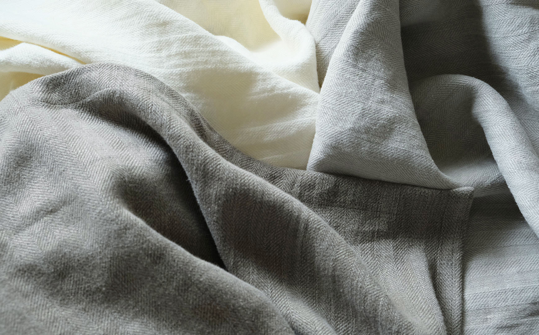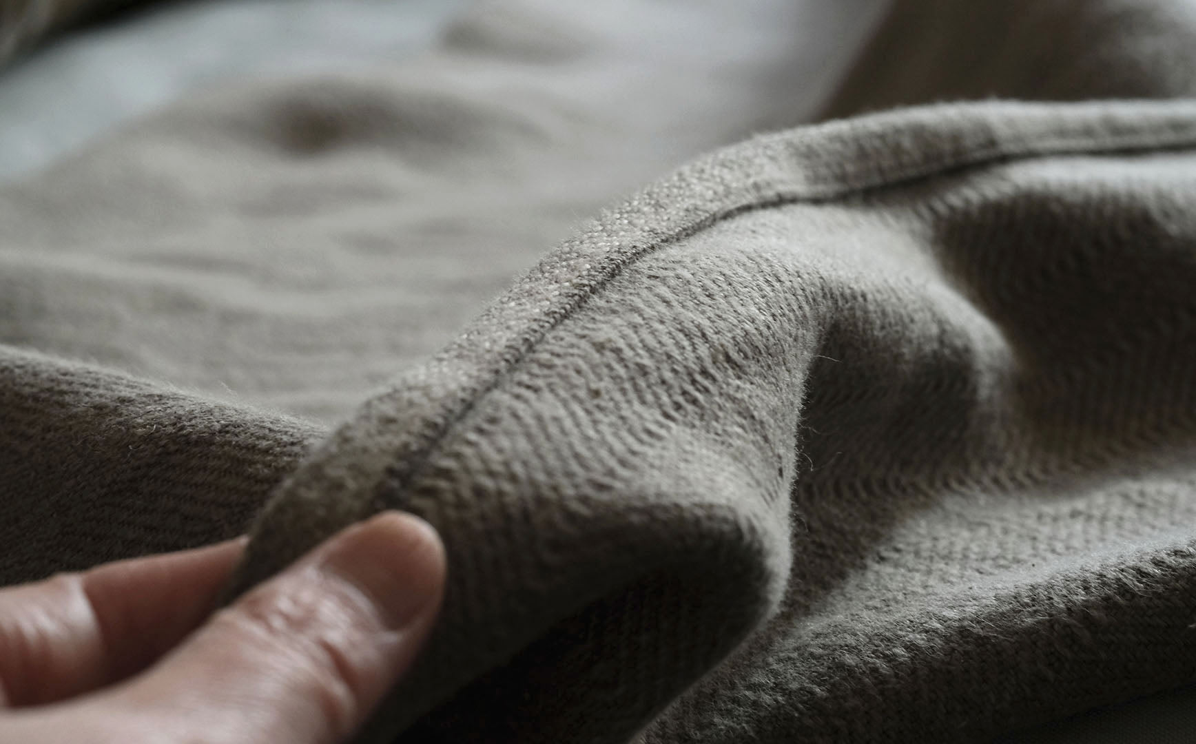 くったりとした肌触りに繊細な凹凸で表現されたヘリンボーン織に惹かれ、これはベッドリネンにぴったり、ブランケットにしたいと感じて選びました。
