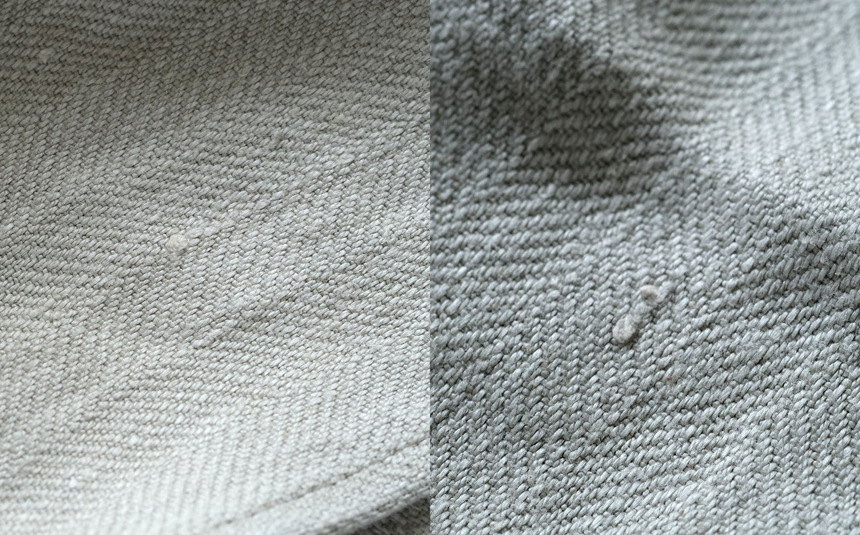 ※上記写真のように、生地の表面にネップや太い節がみられます。無理にひっぱらず、そのままご使用ください。