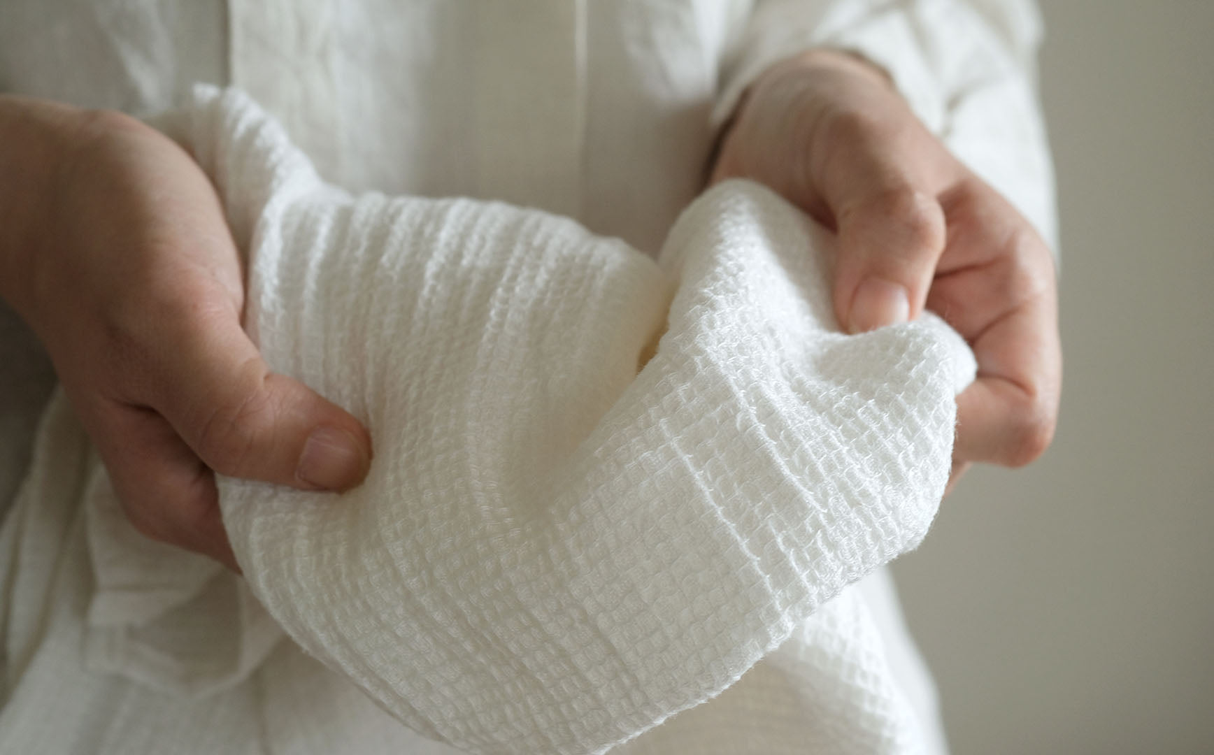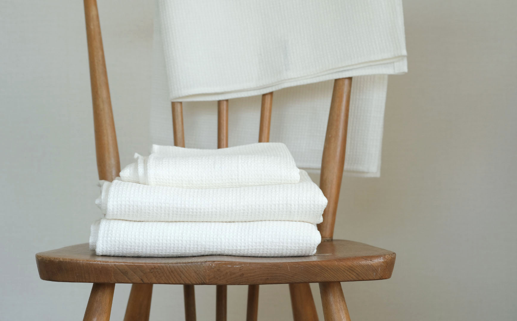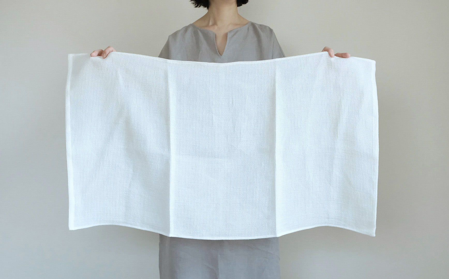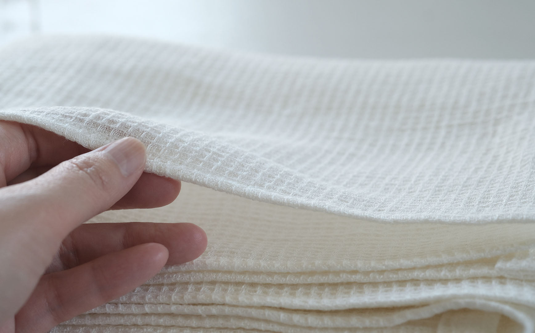 国内で織られたワッフル生地で、さっぱりとした使い心地のタオルをつくりました。「肌あたりがいいこと」「しっかり吸水してくれること」「洗いやすく、乾きやすいこと」。私たちがタオルに求める3つの条件をかなえたタオルです。