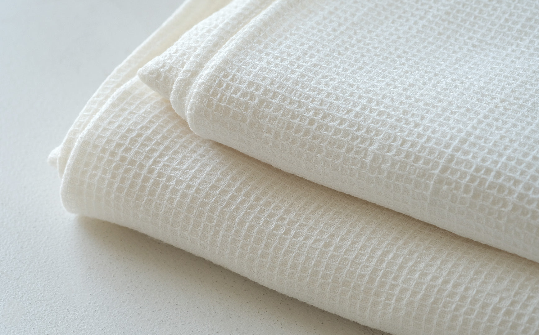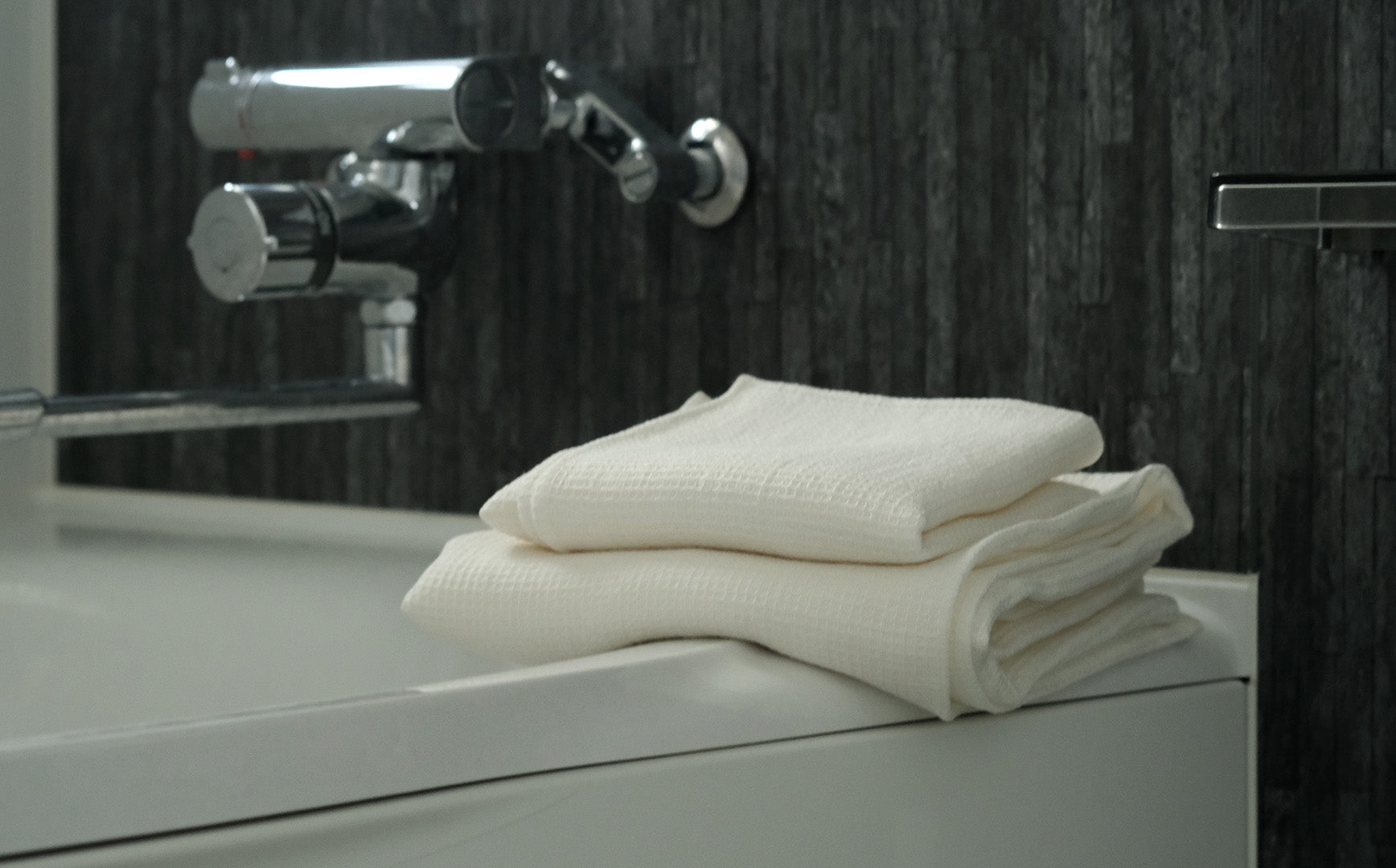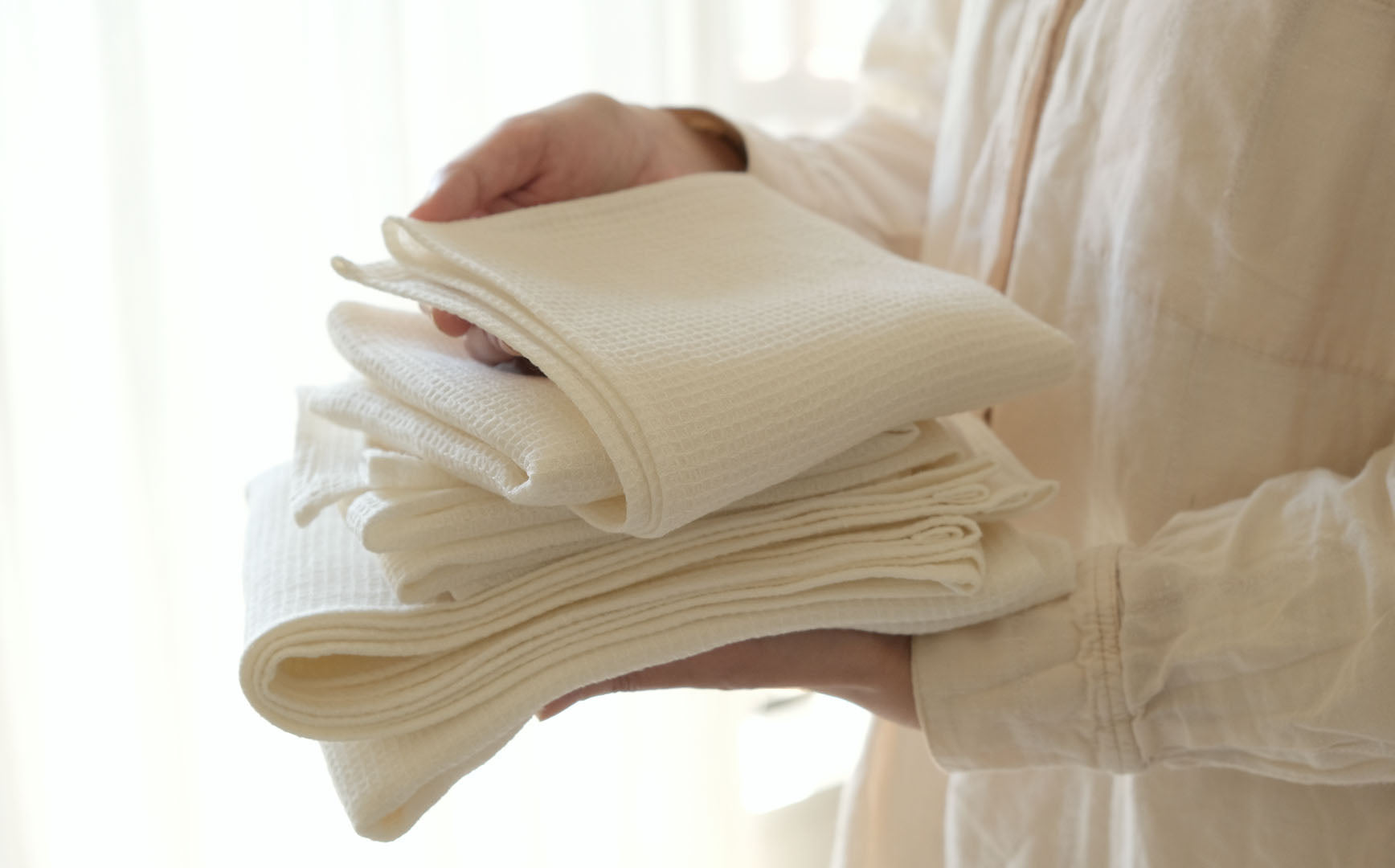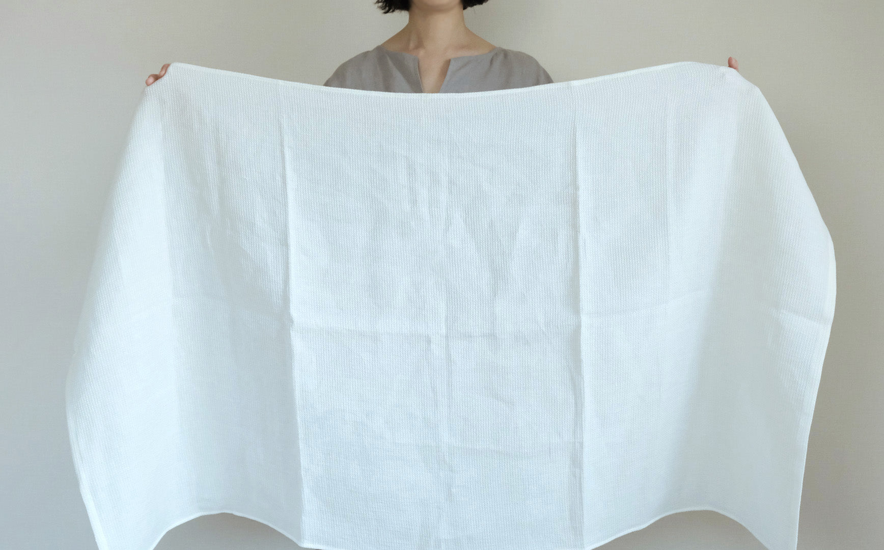 国内で織られたワッフル生地で、さっぱりとした使い心地のタオルをつくりました。「肌あたりがいいこと」「しっかり吸水してくれること」「洗いやすく、乾きやすいこと」。私たちがタオルに求める3つの条件をかなえたタオルです。