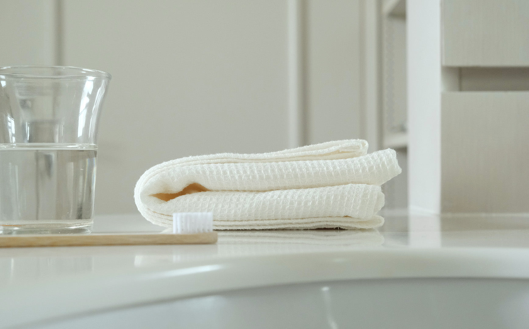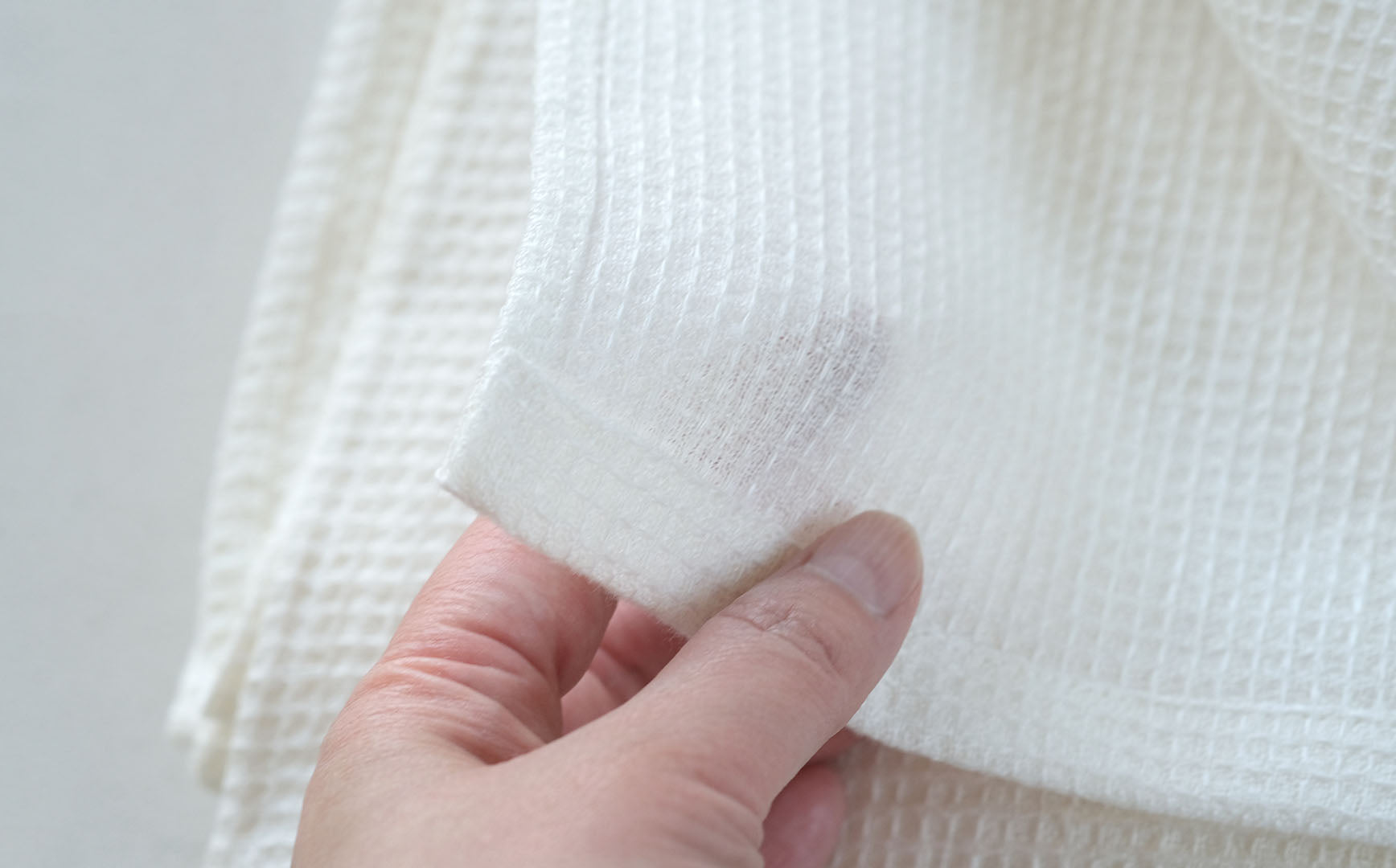 生地は国内で織られたワッフル生地を採用しました。薄手の細かめのワッフル織で、さっぱりとした使用感で気持ちよく使えます。水気をしっかり吸ってすぐ乾いてくれるので、タオルが乾かないストレスとはもうお別れ。