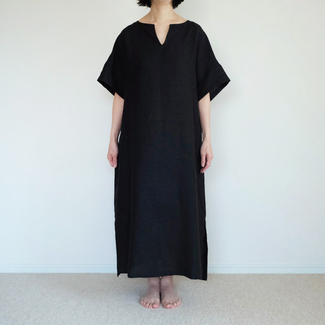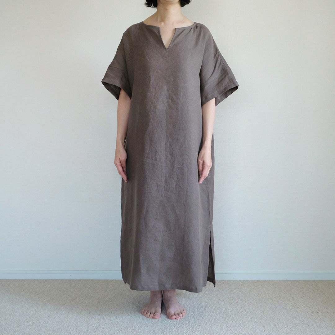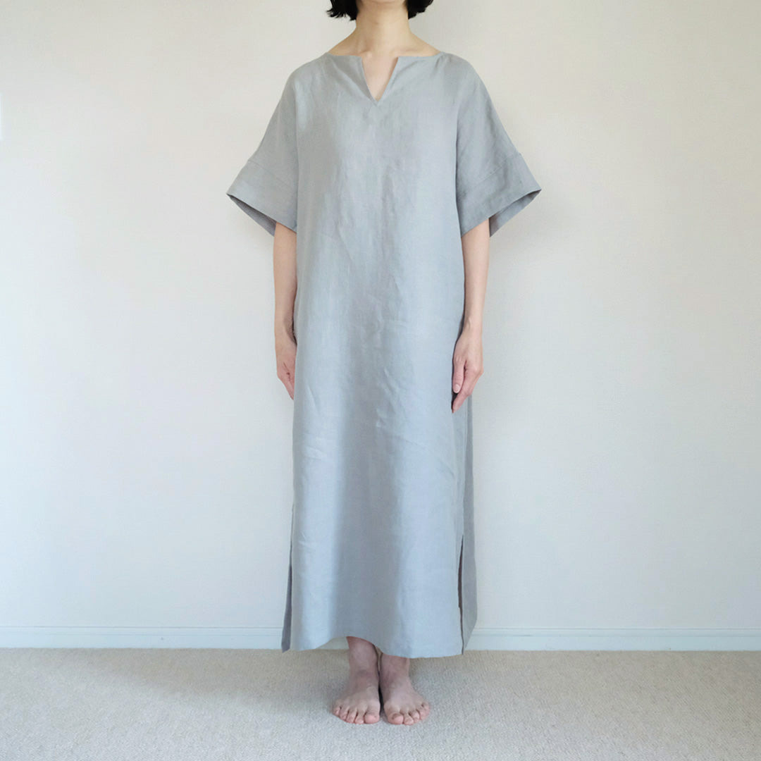 夏の時季、開放感たっぷりのカフタンワンピース。今回、外出着としての用途やさまざまな背の高さを考慮して、着丈を使い勝手のいい長さに伸ばしました。