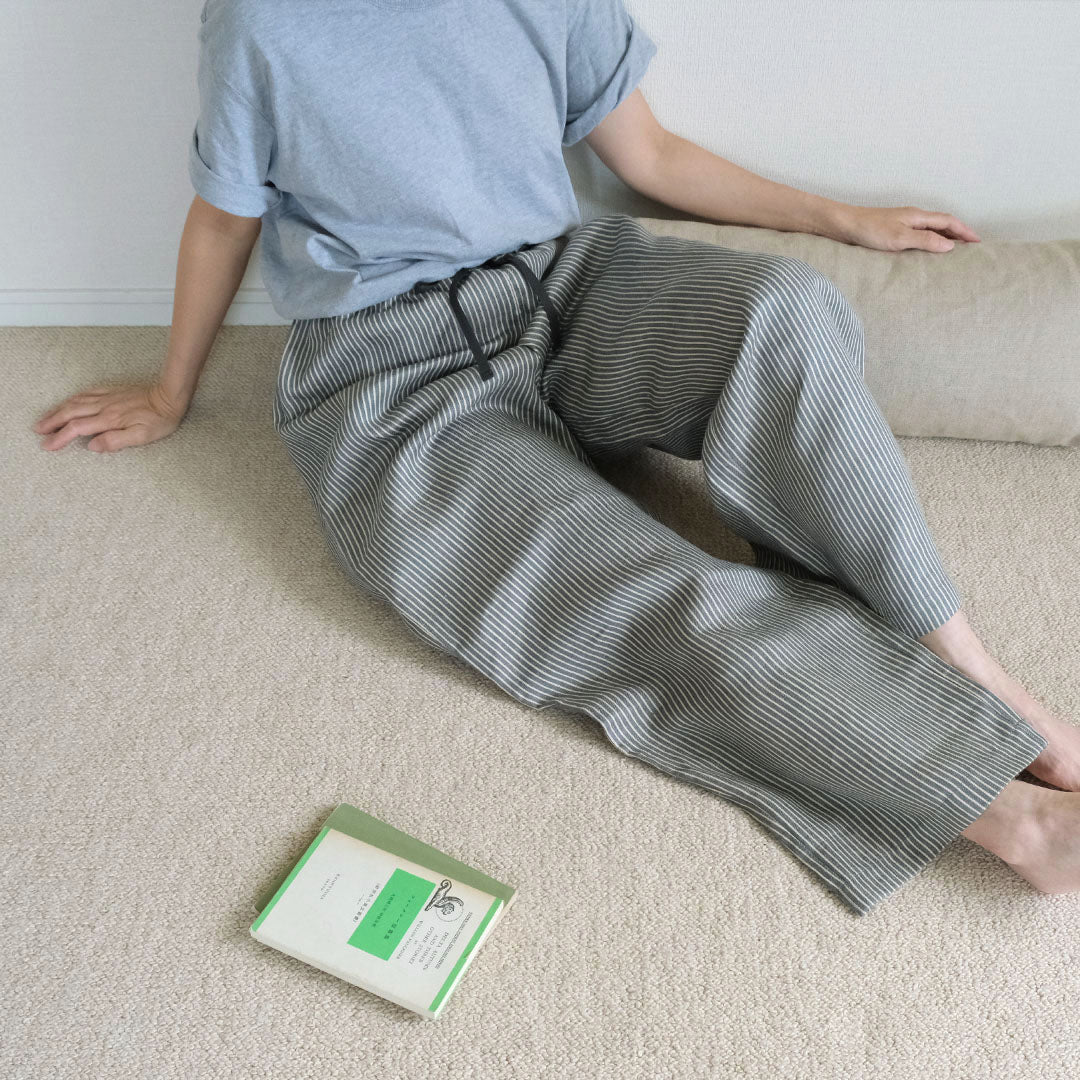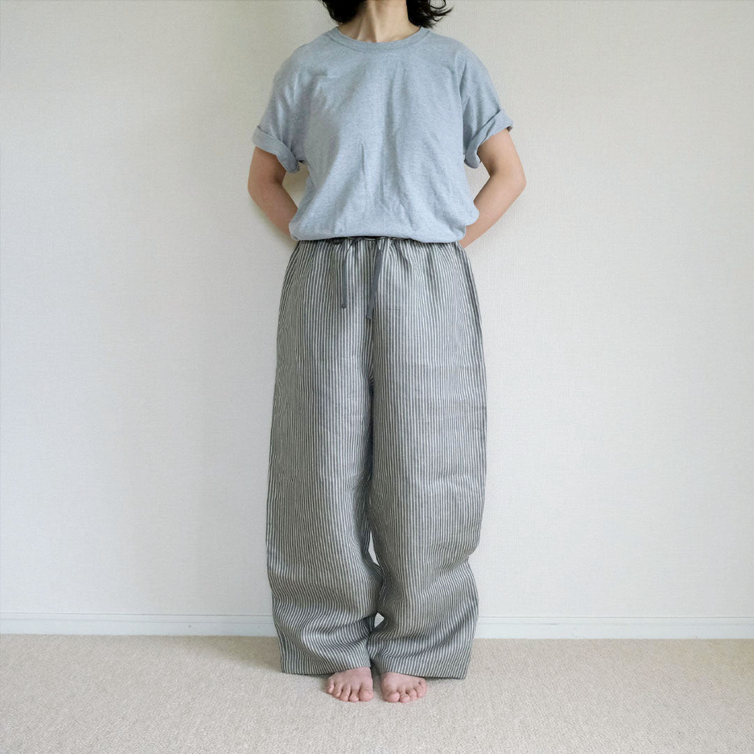 グレイッシュなブルーグリーンに魅せられて、家での時間も外出もご機嫌でいられるリネンパンツをつくりました。吸放湿性の高いリネンは身体の汗をしっかり吸ってくれるので、夏場だけでなく一年中快適に着られます。
