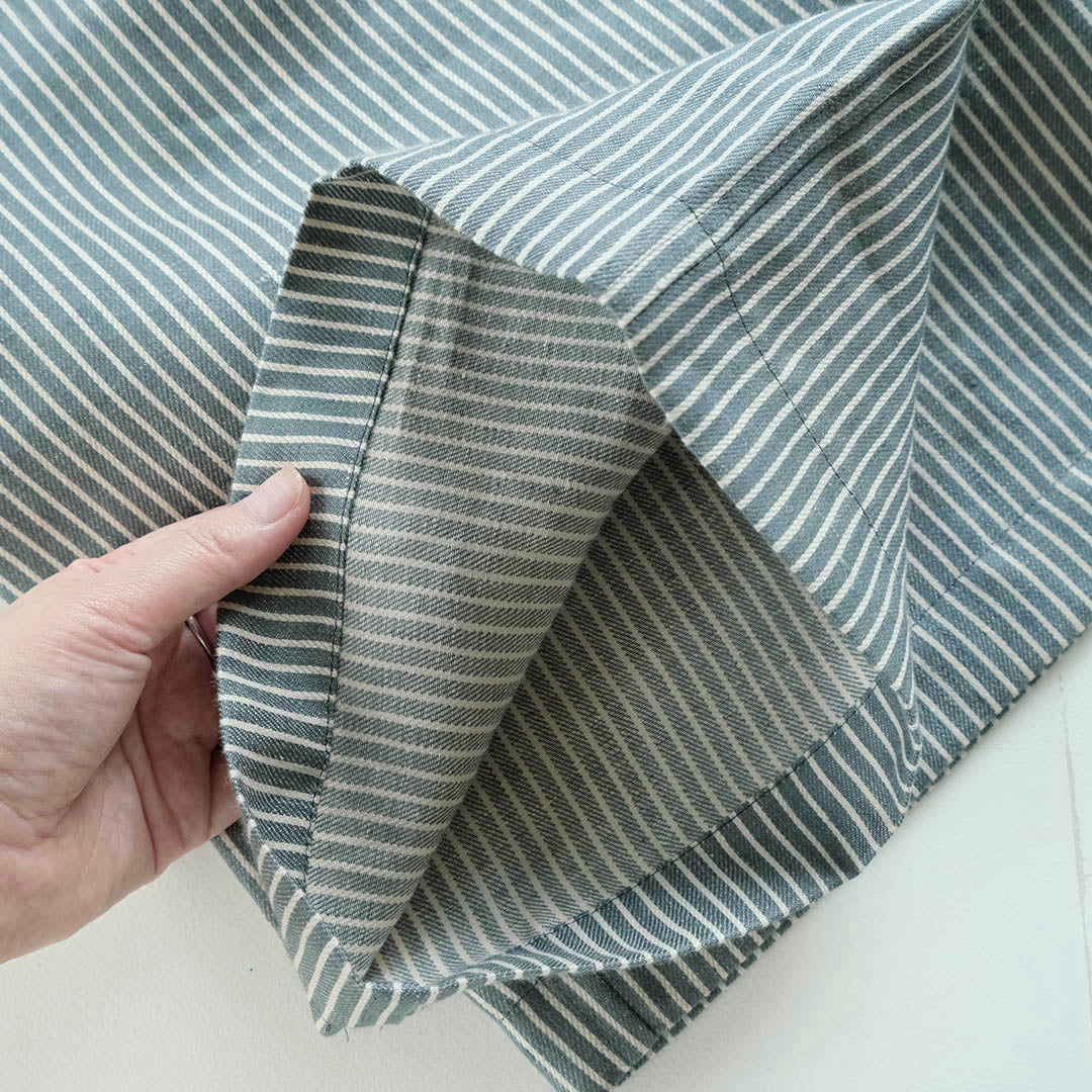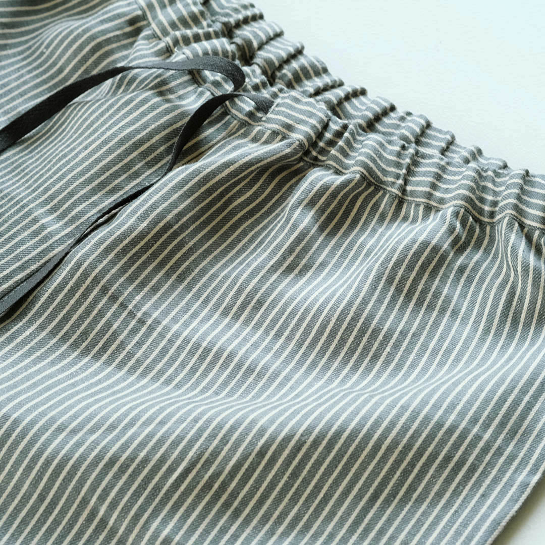 汗ばむ季節、身に付けたいのは素材が呼吸するように涼しいリネン。肌離れがよく、身体を解放させてくれるリネンに爽やかさをプラスして、気づいたら手にとっている、そんなリネンパンツをめざしてつくりました。選んだのはLIBECOの生地セーラーズ。エーゲ海から色付けされた深いブルーグリーンという淡くやさしい色。ありそうでなかったこの洗練されたストライプに魅了されて選びました。
