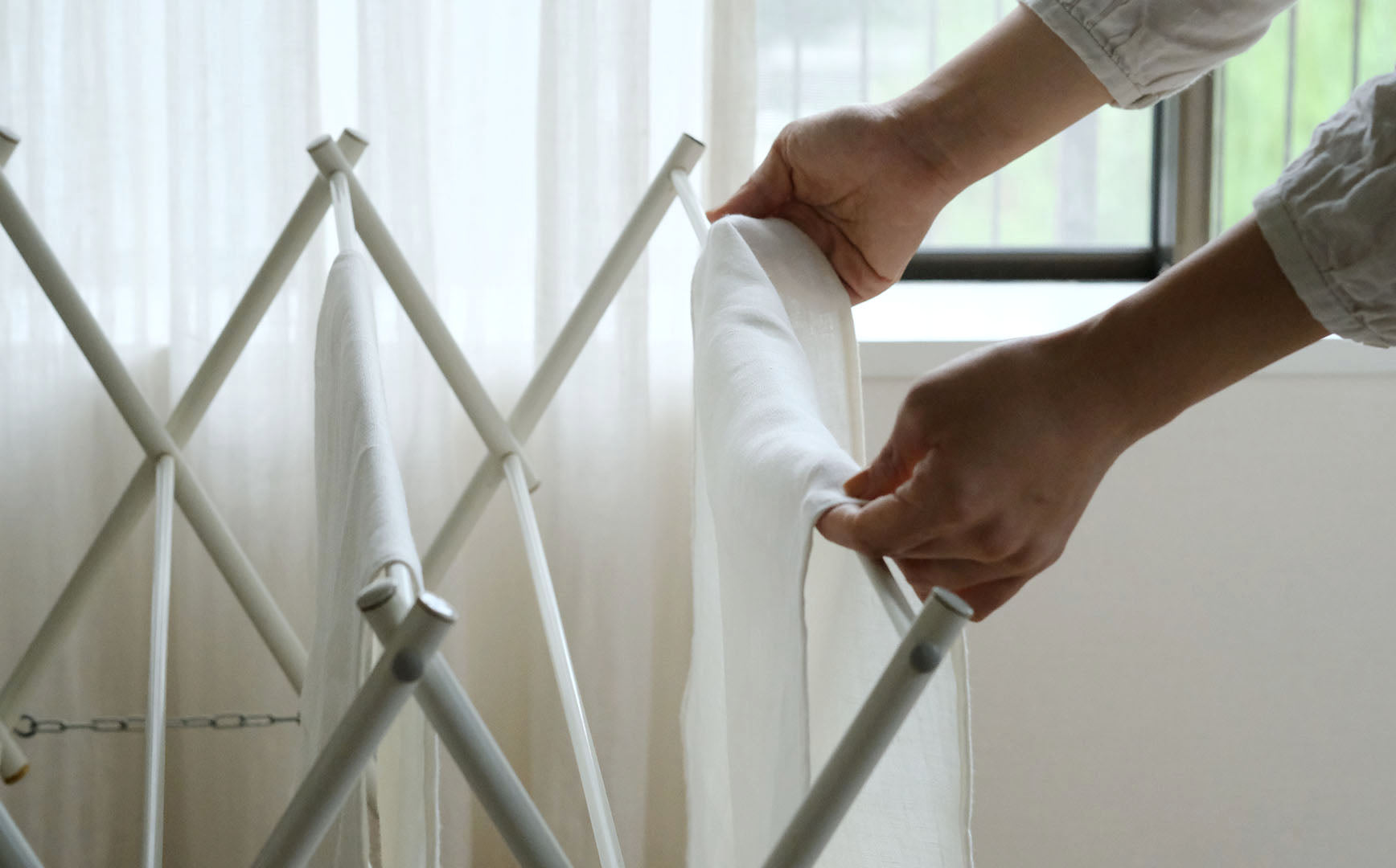 ▲乾かなくて困ることがありません。室内での自然乾燥でもさらっと気持ちよく使えます