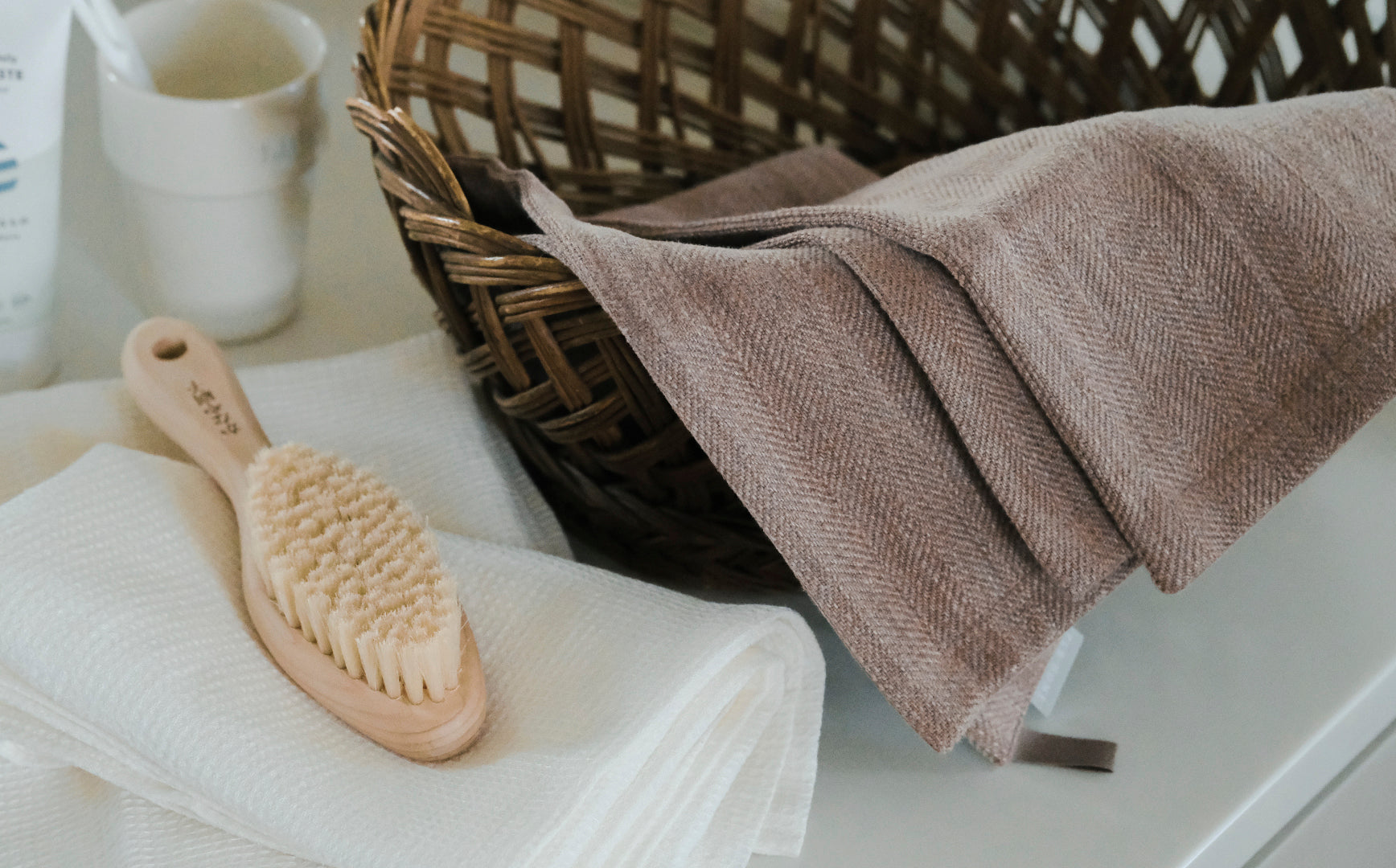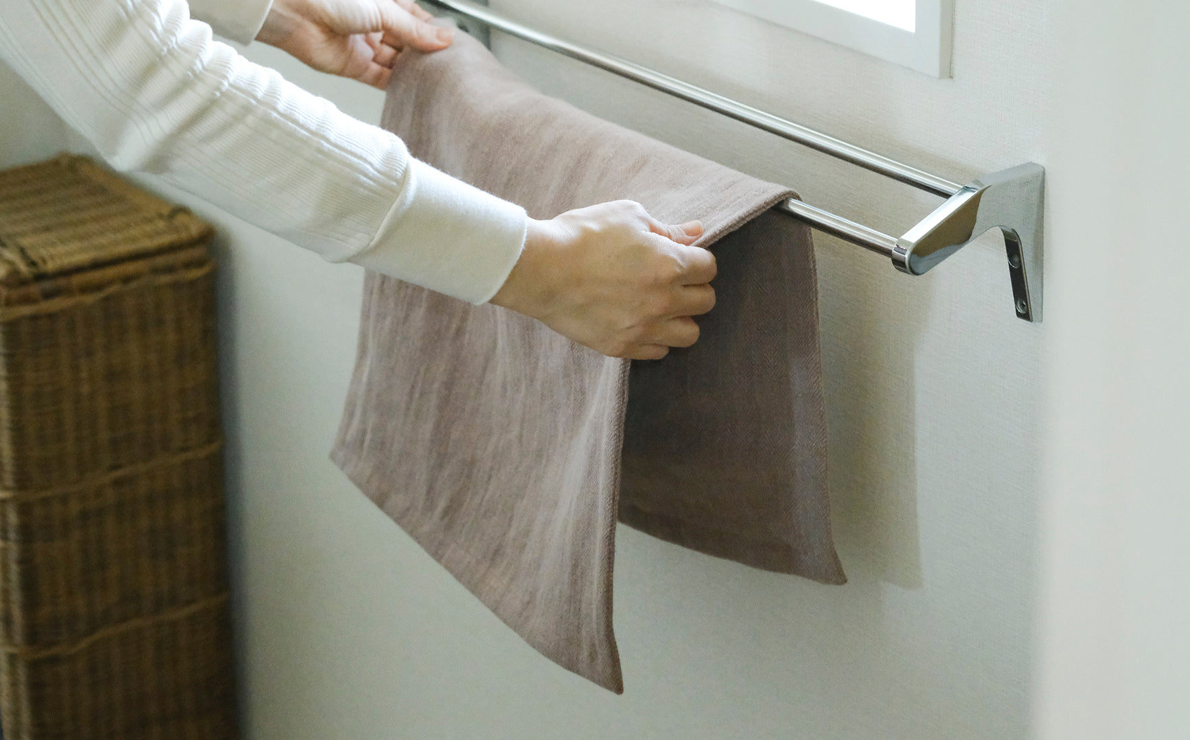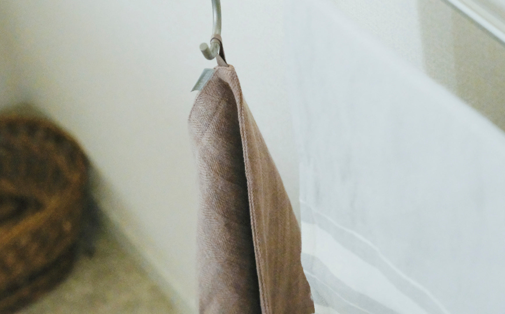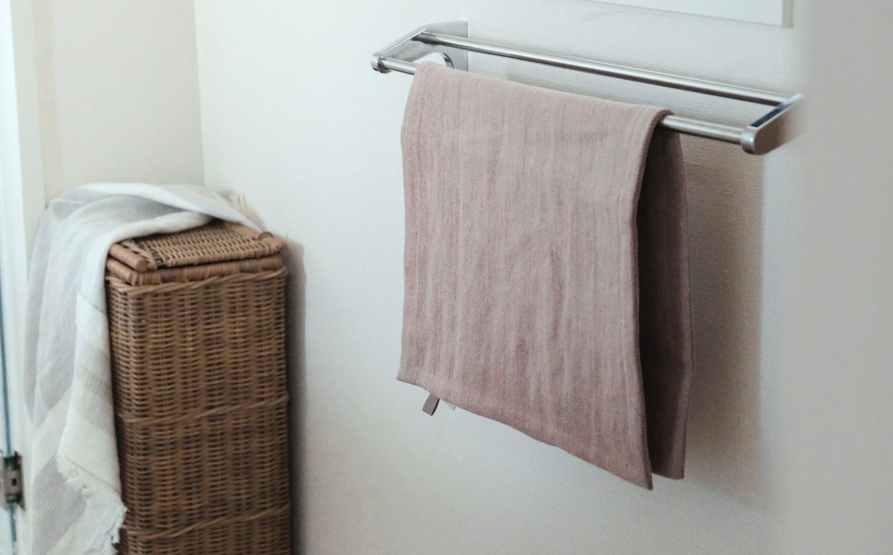 気軽に洗えるリネンは、デイリー使いのアイテムにぴったりな素材。バスタイム後の水けも素早く吸収して乾いてくれます。