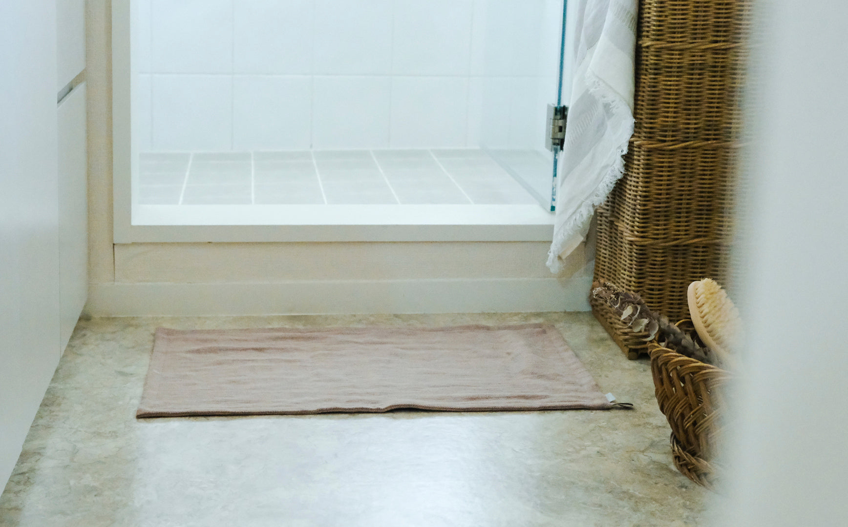 素足にやさしい踏み心地、リネンの速乾性。ウォッシュヘリンボーンのバスラグ