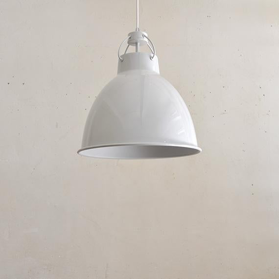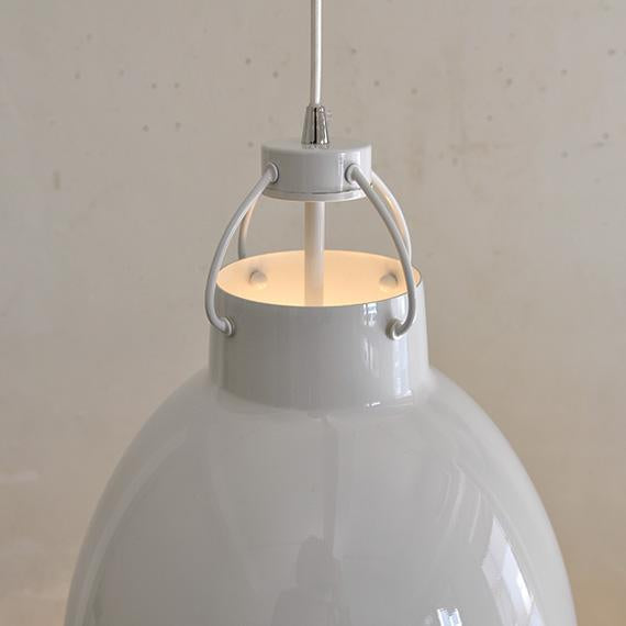 インダストリアルデザインを踏襲したフォルムとフェミニンなホライトカラーのバランスが絶妙なペンダントランプDELIVING WHITE。光沢のある表側とは異なり、裏側は反射を抑えるためにつや消しホワイトで仕上げてあります。上部の開放部から漏れる光がクラシカルな形をより一層引き立たせます。