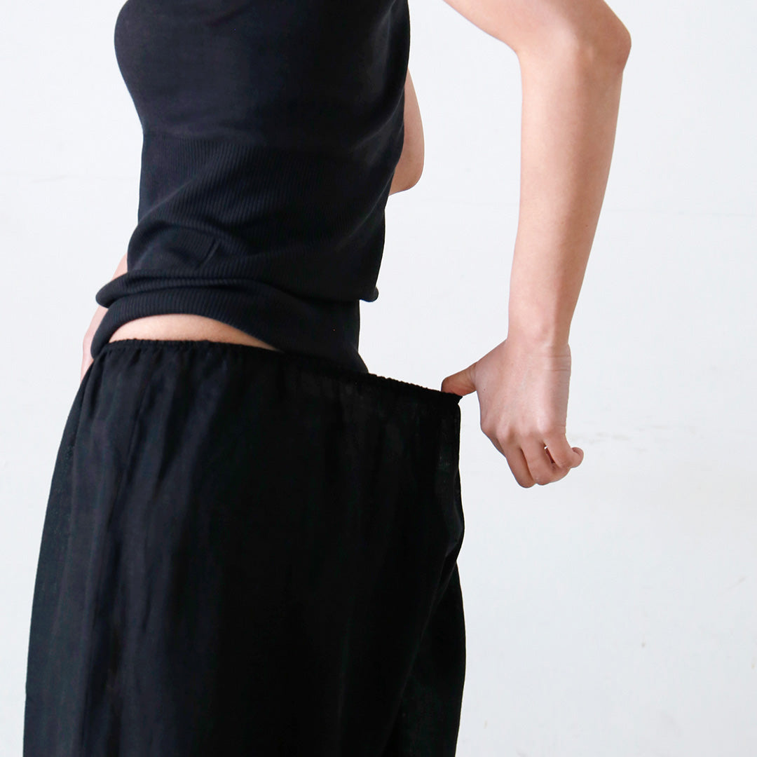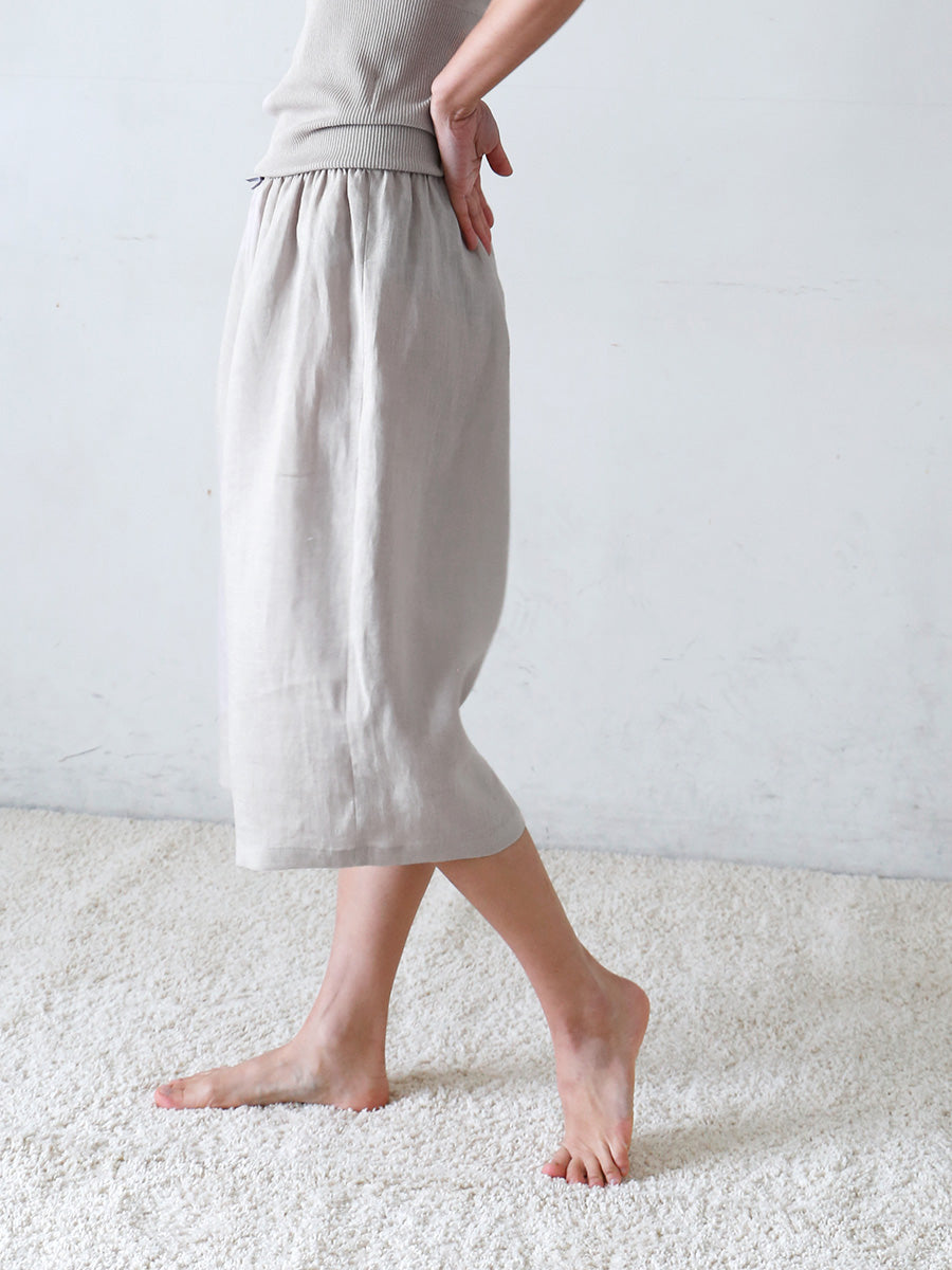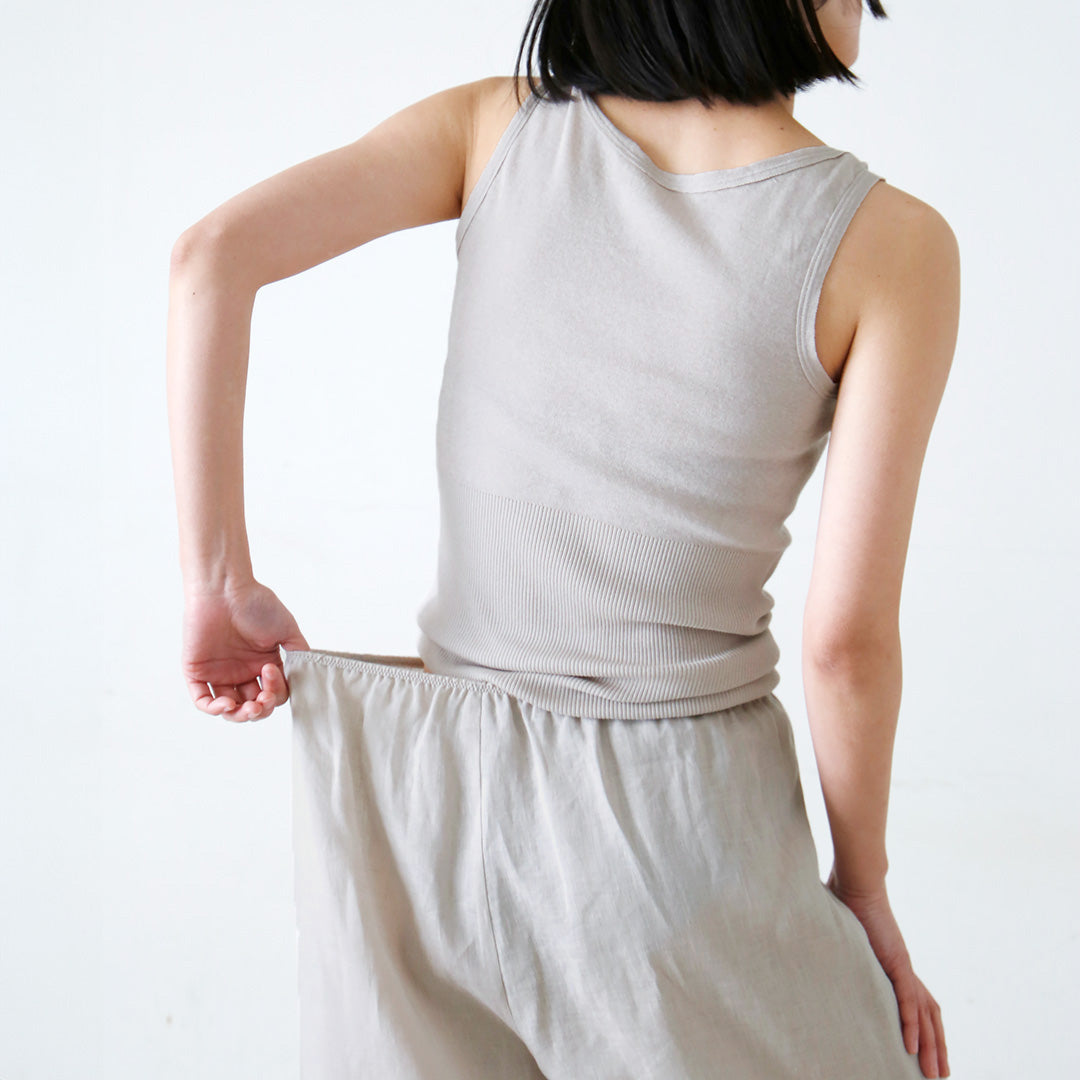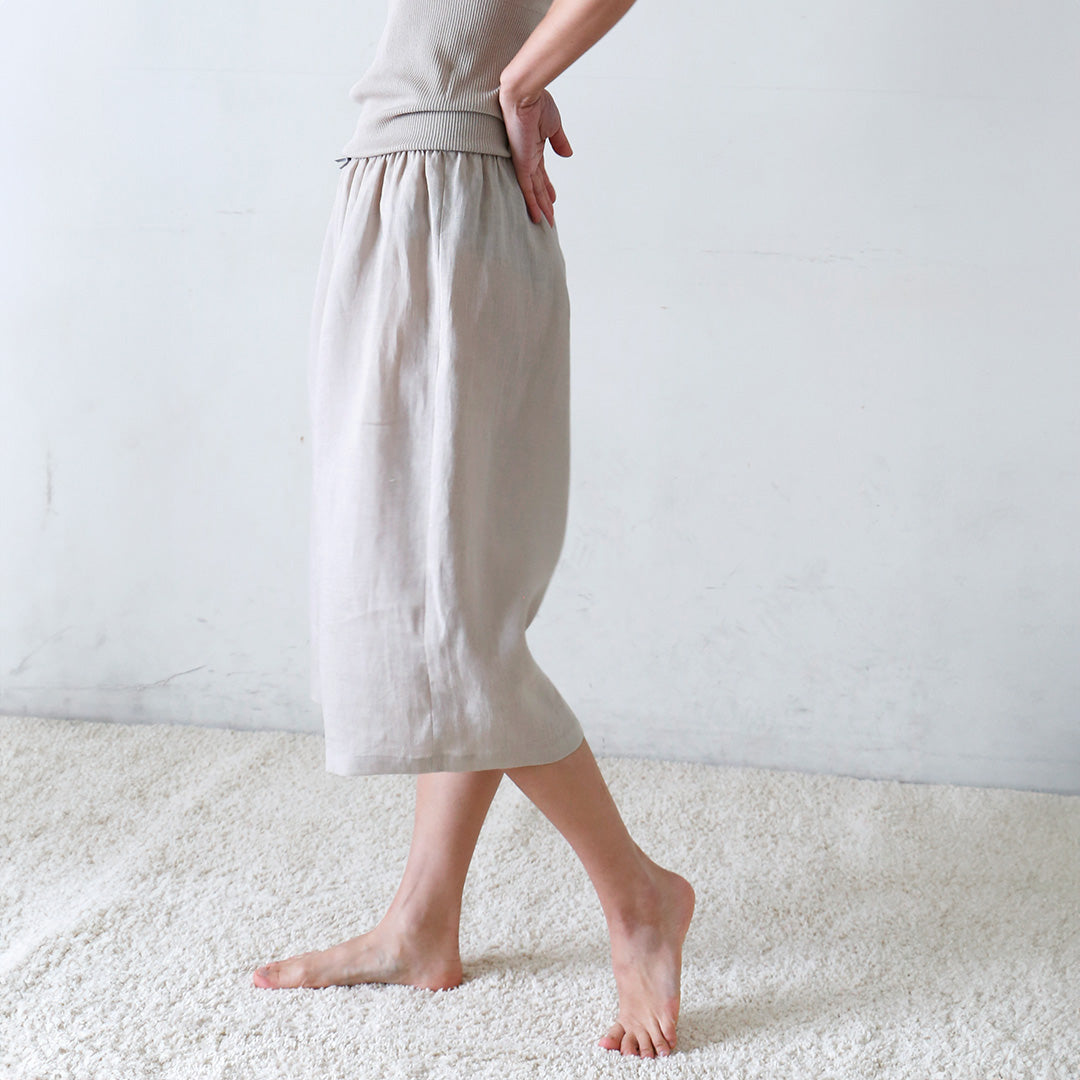 リネンならではの清涼感はもちろん、着るほどにガーゼのようなやさしい肌あたりに変化するのが特徴。汗ばむ季節には履くほうが涼しいと思うほど素肌に心地よい素材です。