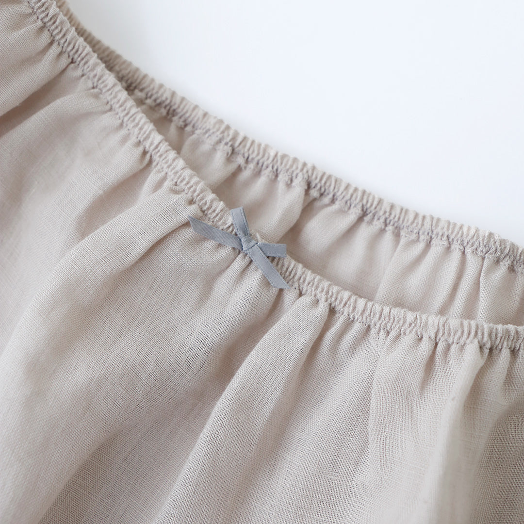 ベルギーリネンのリーディングカンパニー「LIBECO / リベコ」社のつくる生地を使用しています。リネンならではの清涼感はもちろん、着るほどにガーゼのようなやさしい肌あたりに変化するのが特徴。汗ばむ季節には履くほうが涼しいと思うほど素肌に心地よい素材です。