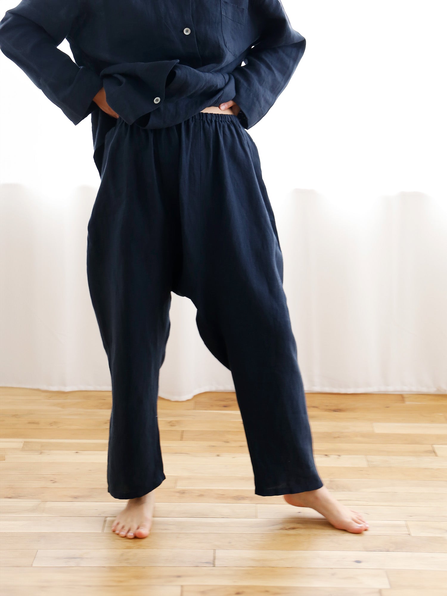 股上が深く、大きくまちをとってヒップまわりはゆったり。サルエルタイプのデザインです。睡眠中の身体の動きを妨げません。ウエストゴムもソフトで締め付けがありません。ポケットはついていません。