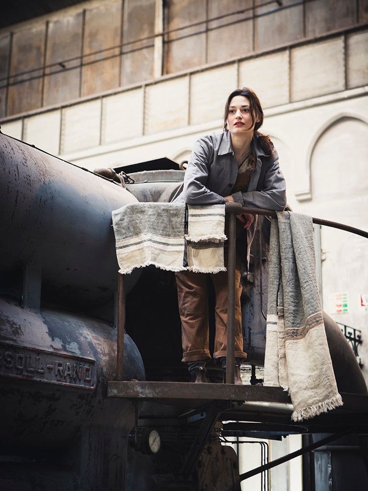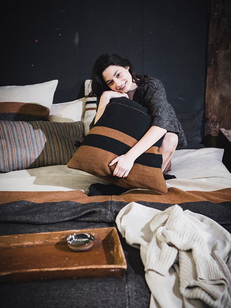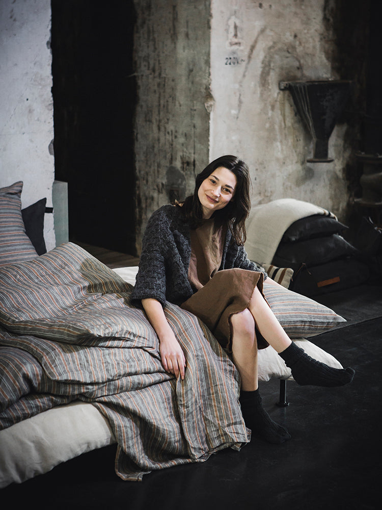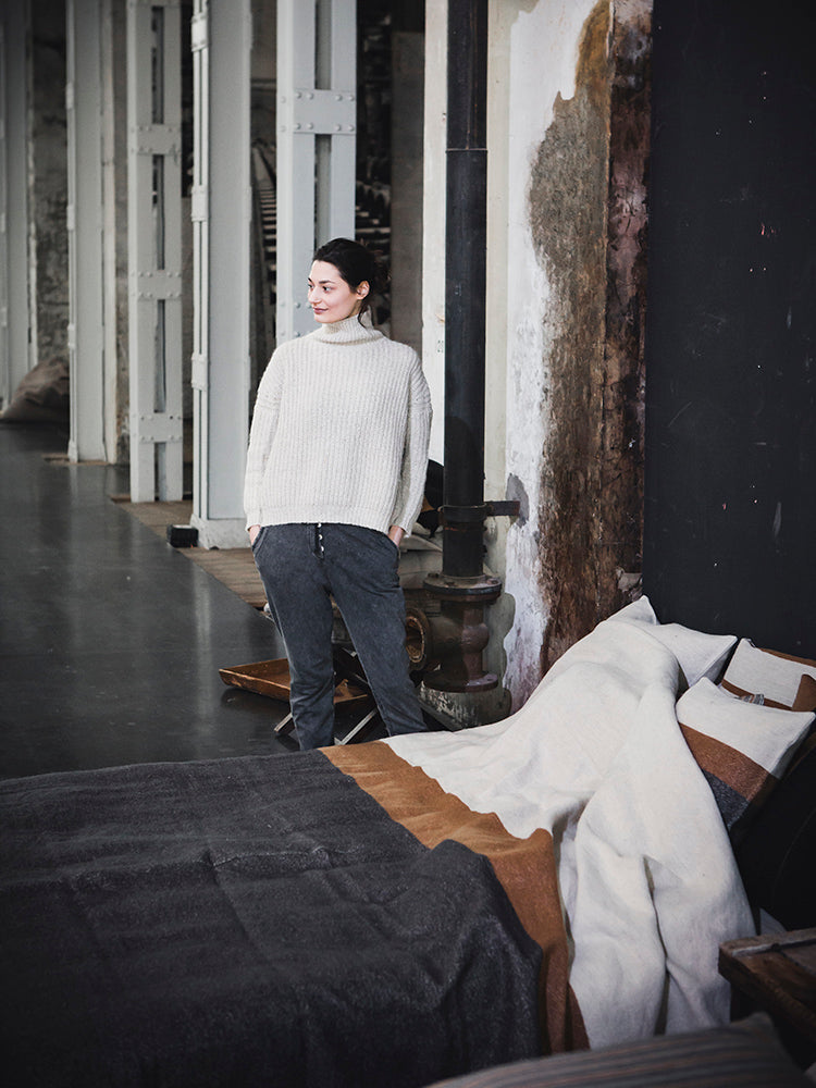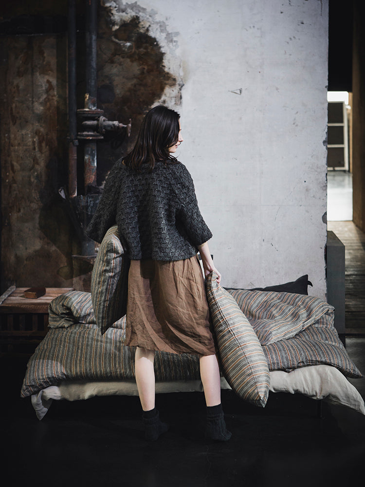 ベルギー最大の製鉄所のコンクリート床、高い天井や大きな窓、そしてリネンやウールの家具などインダストリアルな雰囲気の内装に影響をうけてつくられました。ブラックとブラウンを基調としたマニッシュなテキスタイルは、重厚さとナチュラルさがほどよくミックスされています。