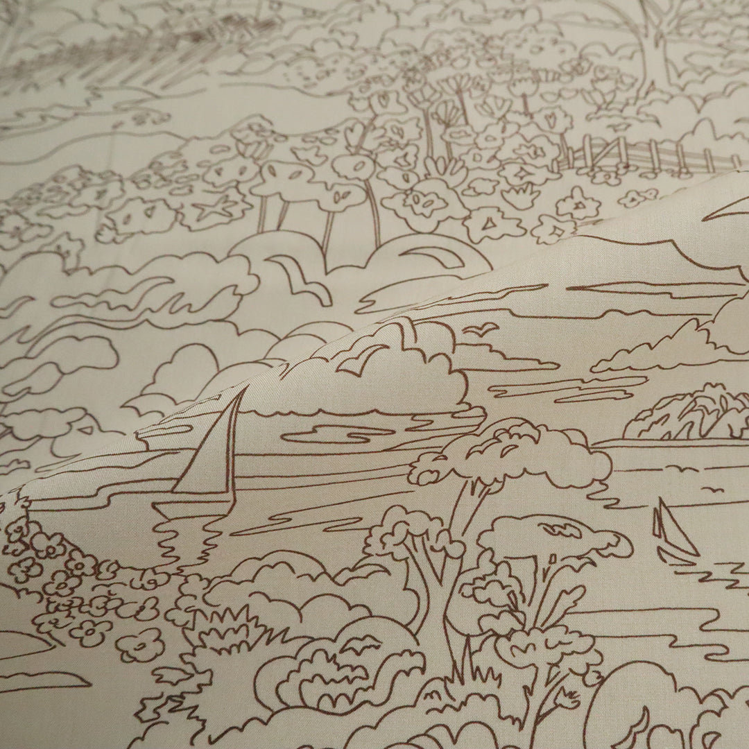 この魅力的なパターンは、イギリスの海岸の穏やかな風景への懐かしさを呼び起こします。静かな入り江や帆船、丘を歩く風景などが、シンプルでありながら優雅な線画で美しく描かれ、洗練されたモノクロの色調がその魅力を引き立てています。
