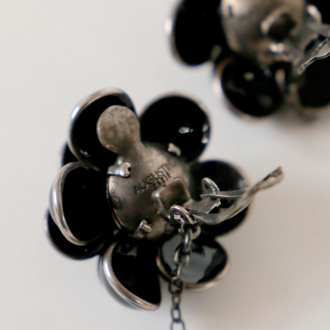 立体感のある大ぶりなカメリアの花をモチーフにしています。揺れるしずく型のガラスがアクセント。