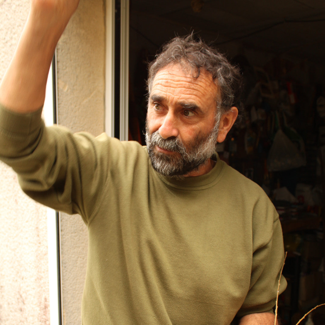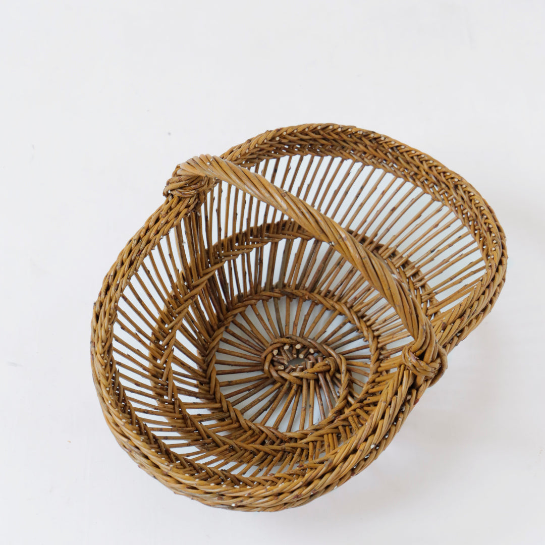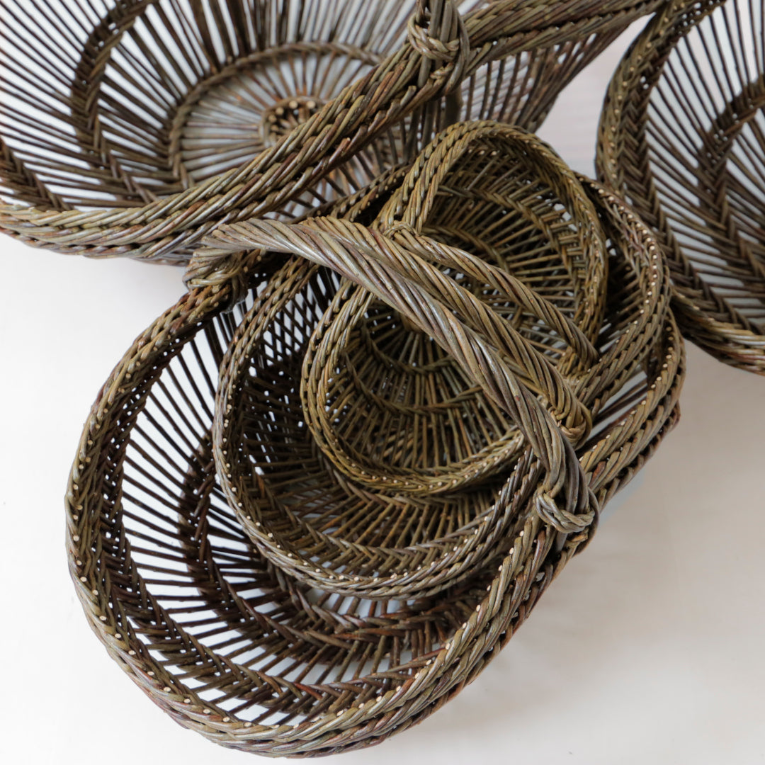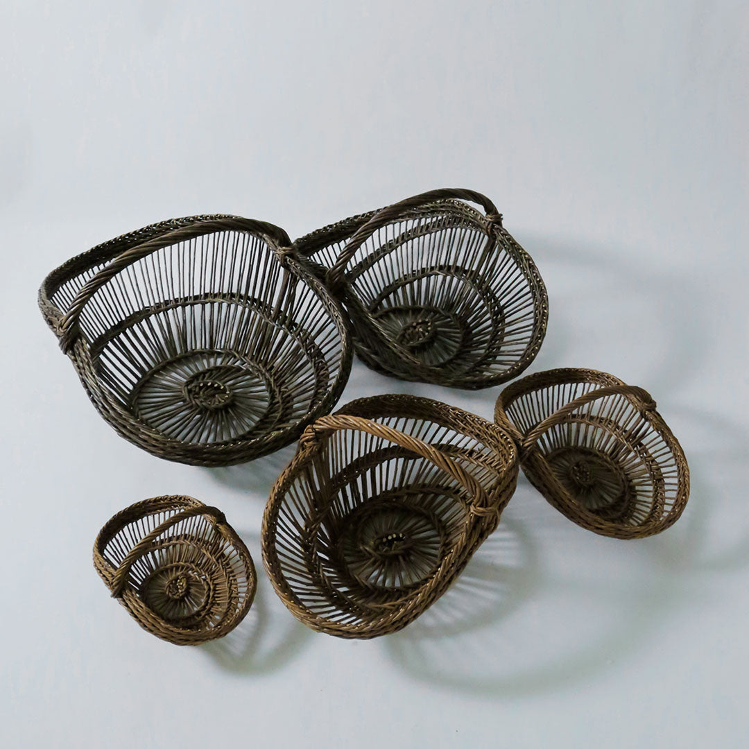 カゴの中心部から職人の感覚だけをたよりにぐるぐると編んでいきます。持ち手をつけ、重石を置いて底を作り乾かしながら形成していくと独特なフォルムに仕上がります。 立体的な渦巻模様はどこから見ても弧を描き、その美しさに強く心を惹かれます。