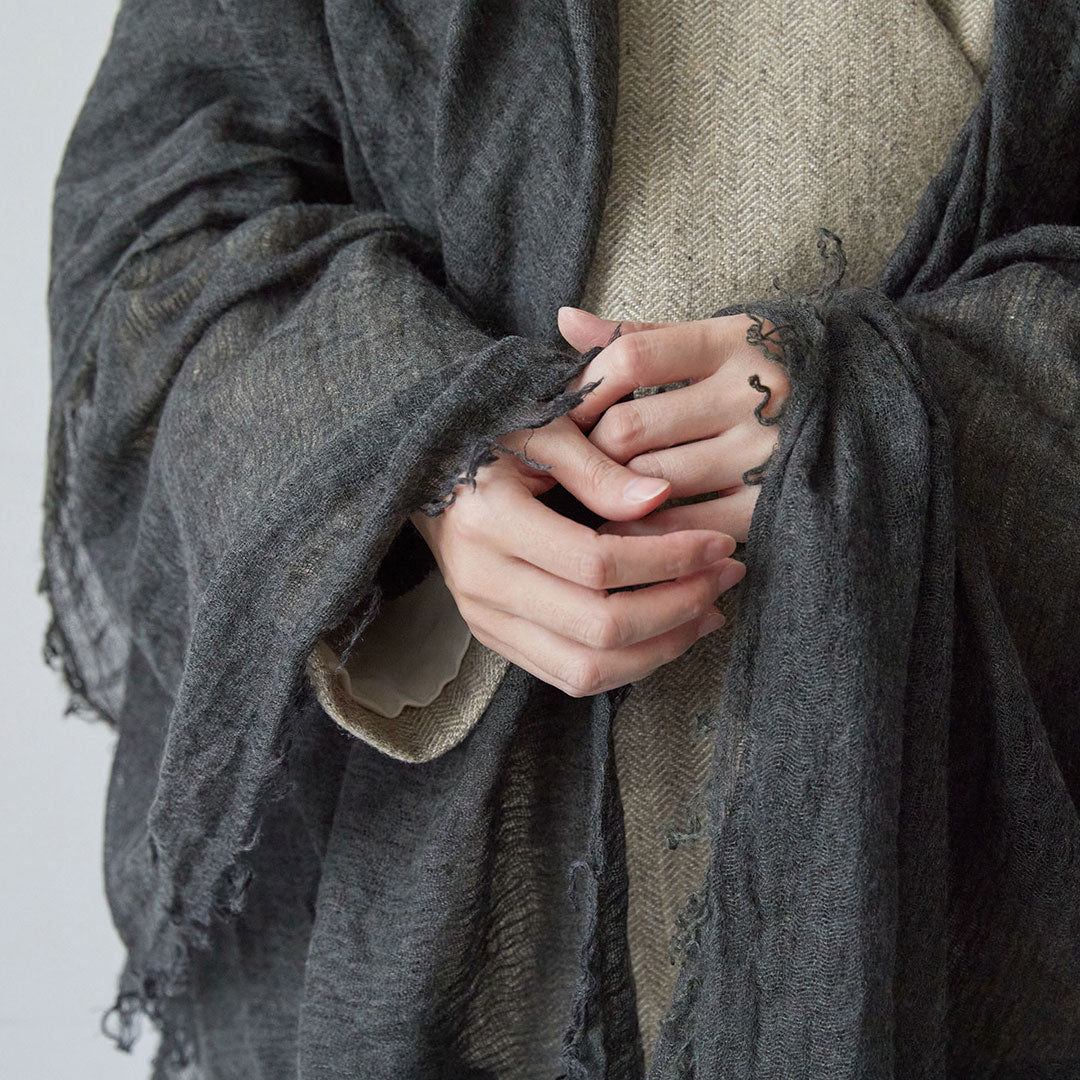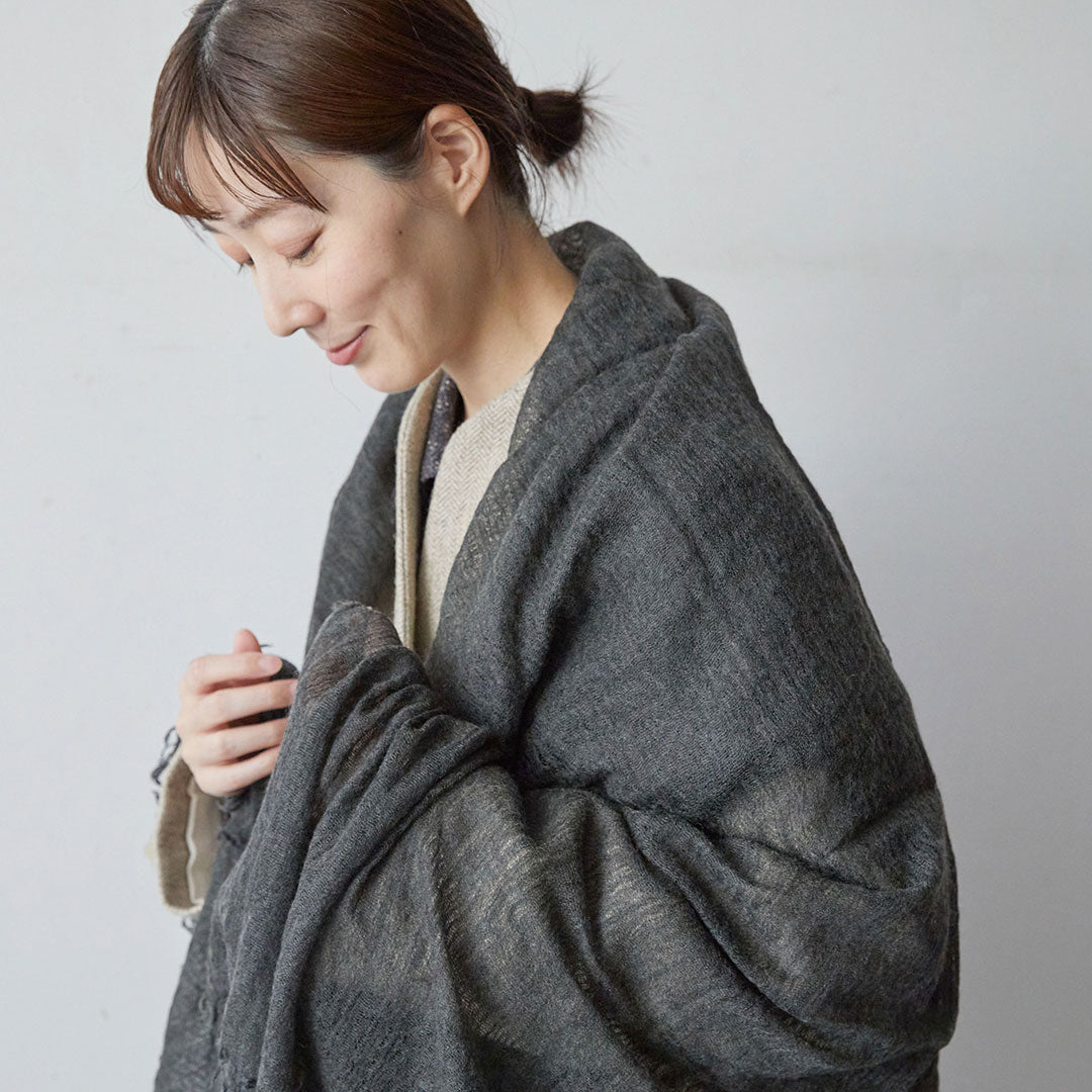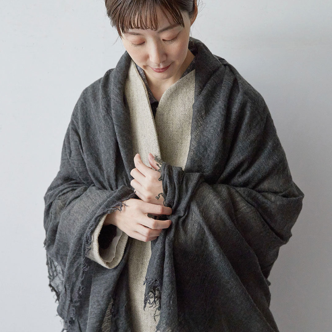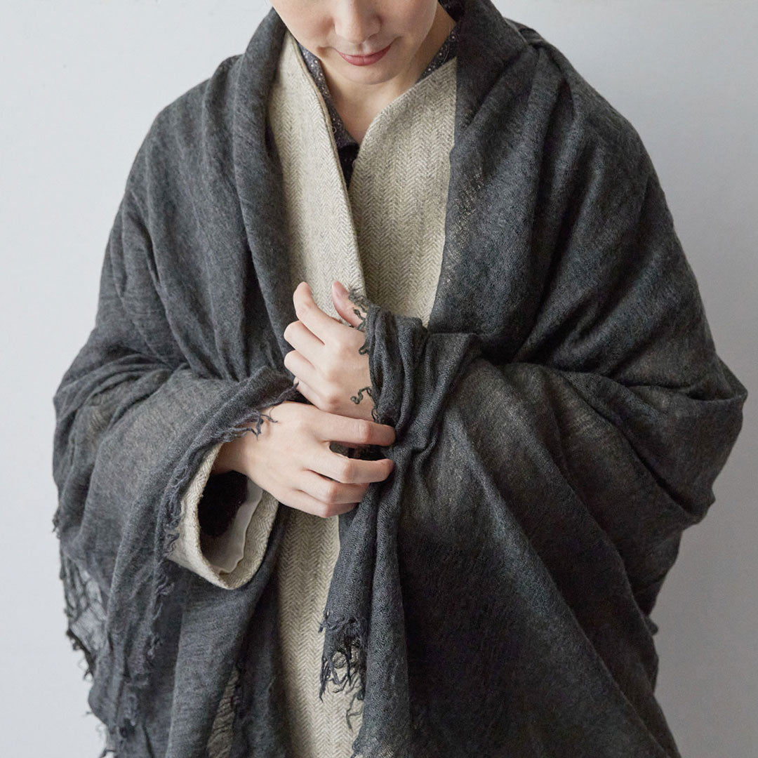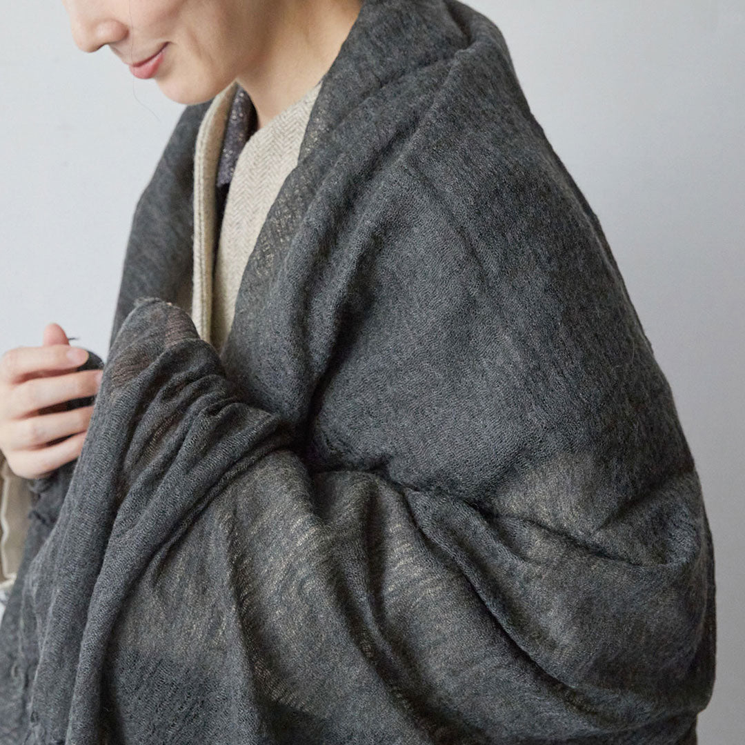 透けるほど薄いカシミヤシルクは、なめらかで優しい肌触り。とても軽いのにたっぷりと空気を含んでいるので、冬の寒さからもきちんと守ってくれる暖かさ。 コート代わりにもなる大判サイズが頼もしい1枚です。