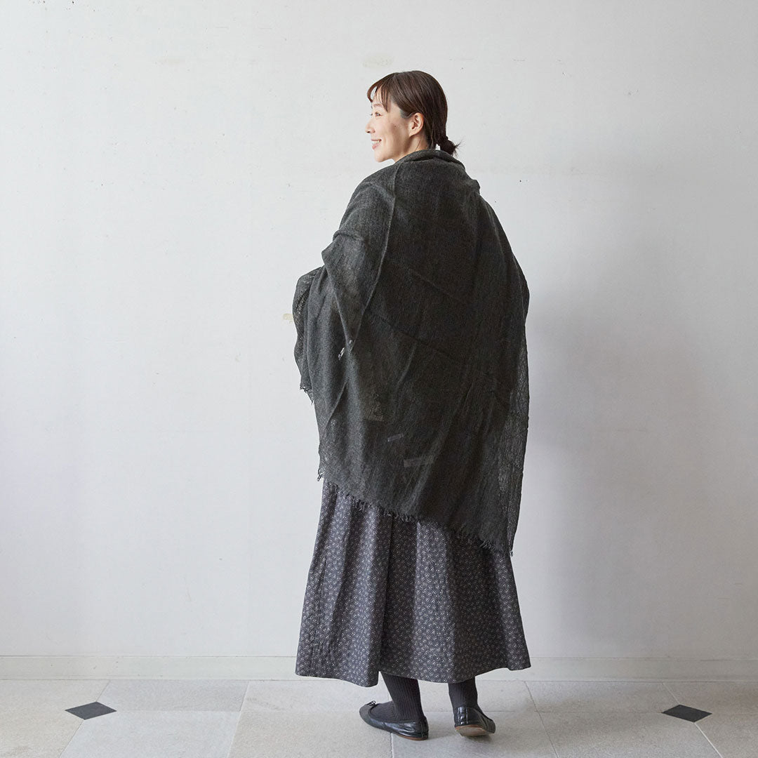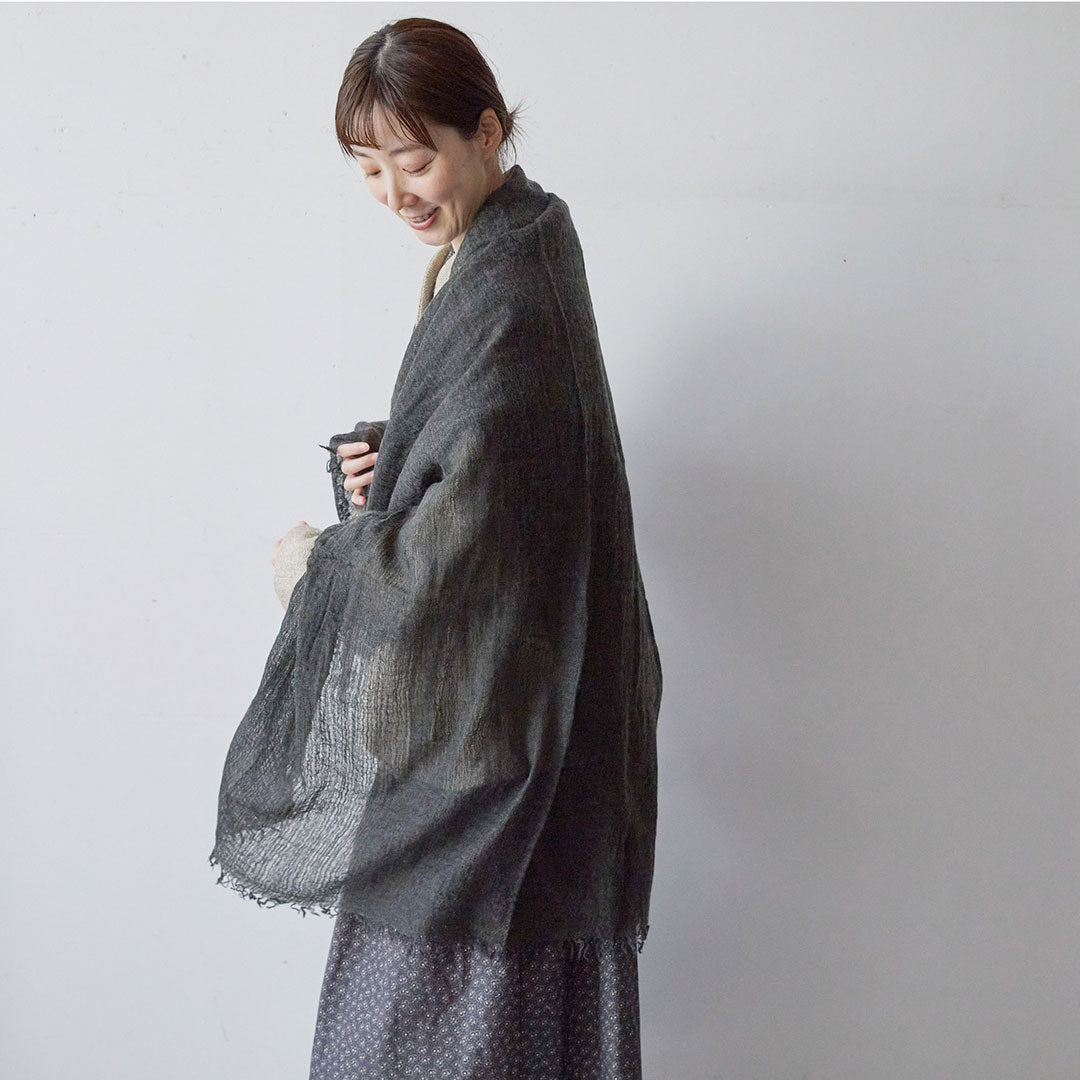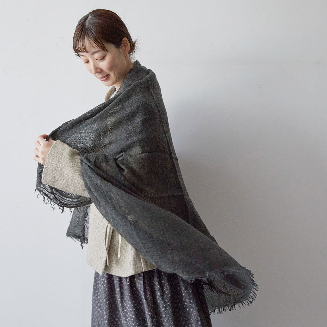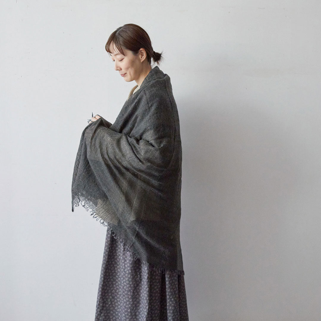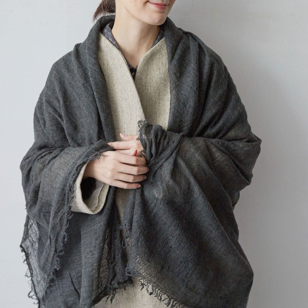 透けるほど薄いカシミヤシルクは、なめらかで優しい肌触り。とても軽いのにたっぷりと空気を含んでいるので、冬の寒さからもきちんと守ってくれる暖かさ。 コート代わりにもなる大判サイズが頼もしい1枚です。
