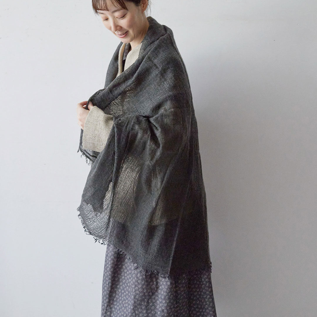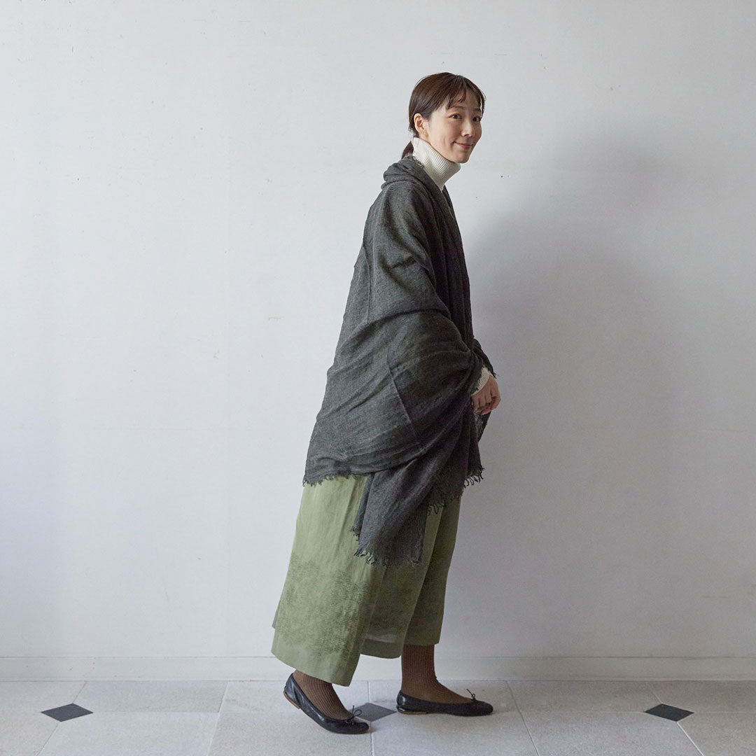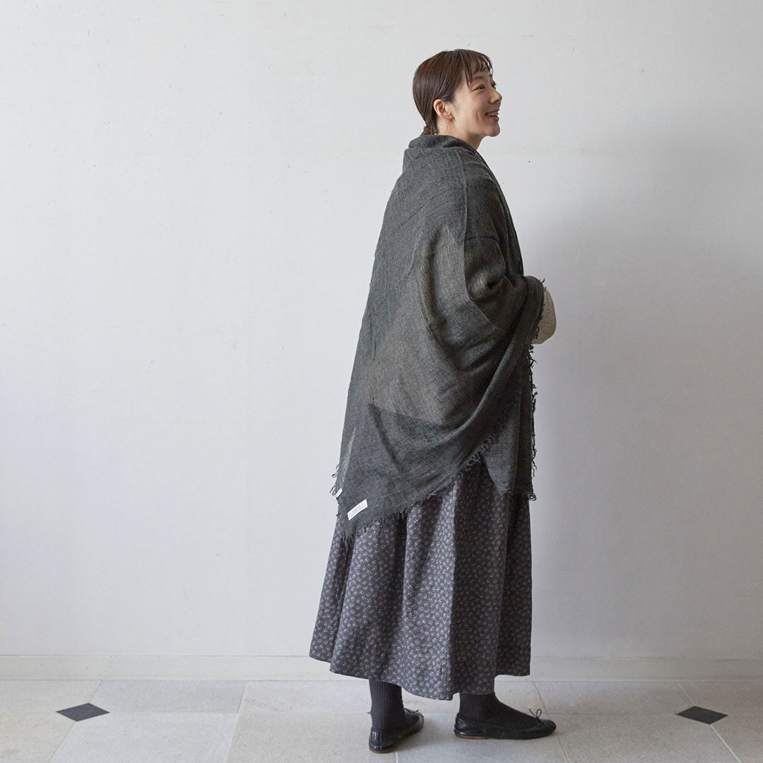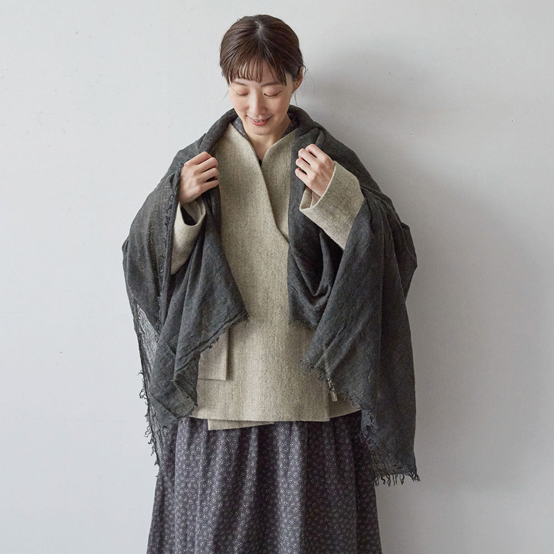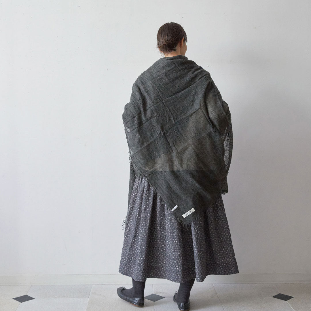 透けるほど薄いカシミヤシルクは、なめらかで優しい肌触り。とても軽いのにたっぷりと空気を含んでいるので、冬の寒さからもきちんと守ってくれる暖かさ。 コート代わりにもなる大判サイズが頼もしい1枚です。