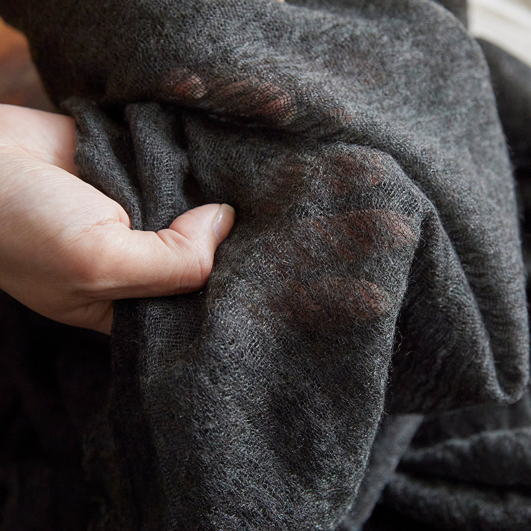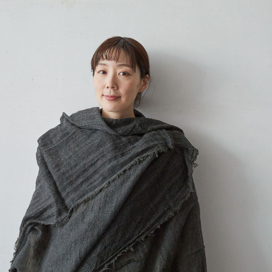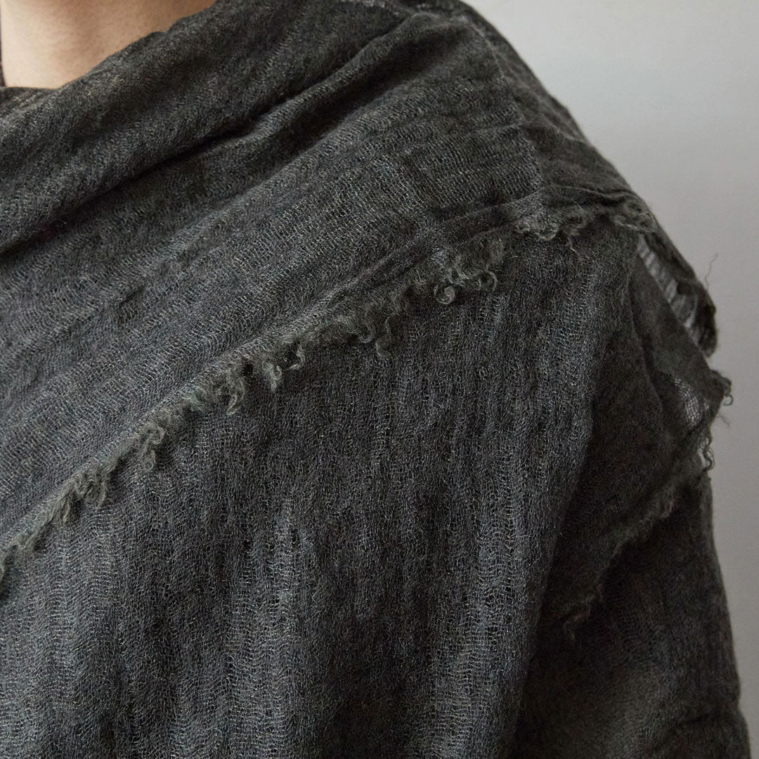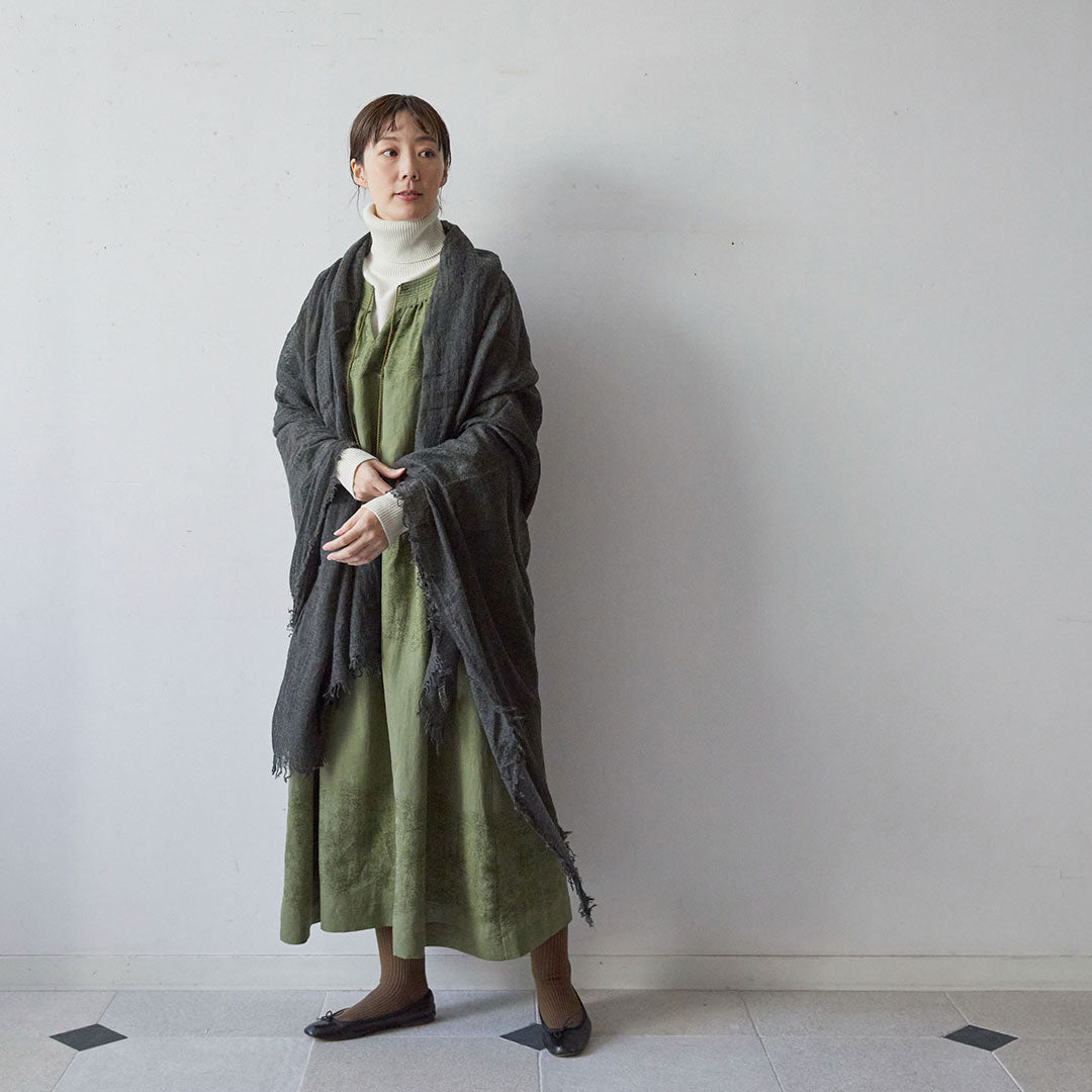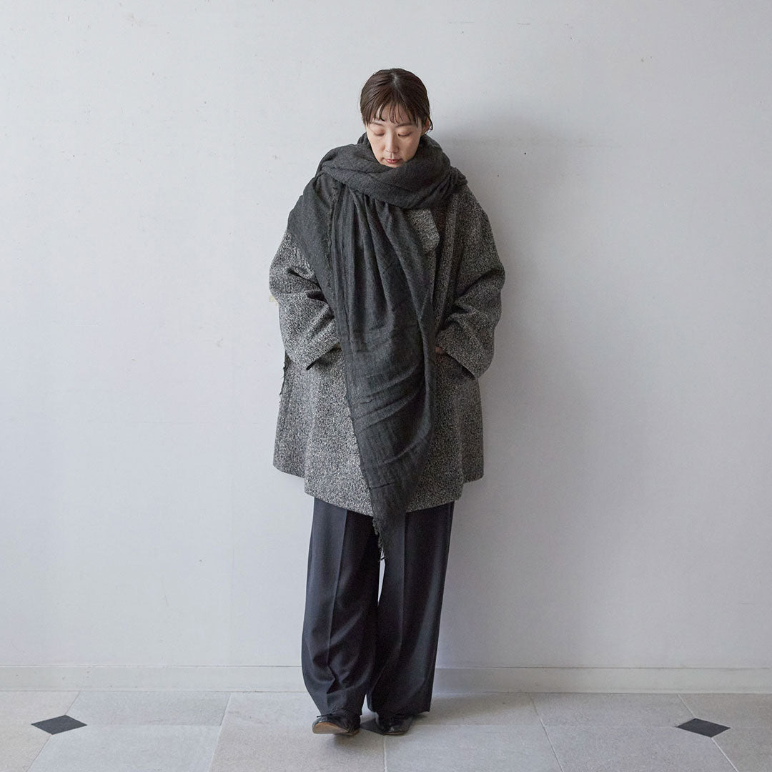 透けるほど薄いカシミヤシルクは、なめらかで優しい肌触り。とても軽いのにたっぷりと空気を含んでいるので、冬の寒さからもきちんと守ってくれる暖かさ。 コート代わりにもなる大判サイズが頼もしい1枚です。