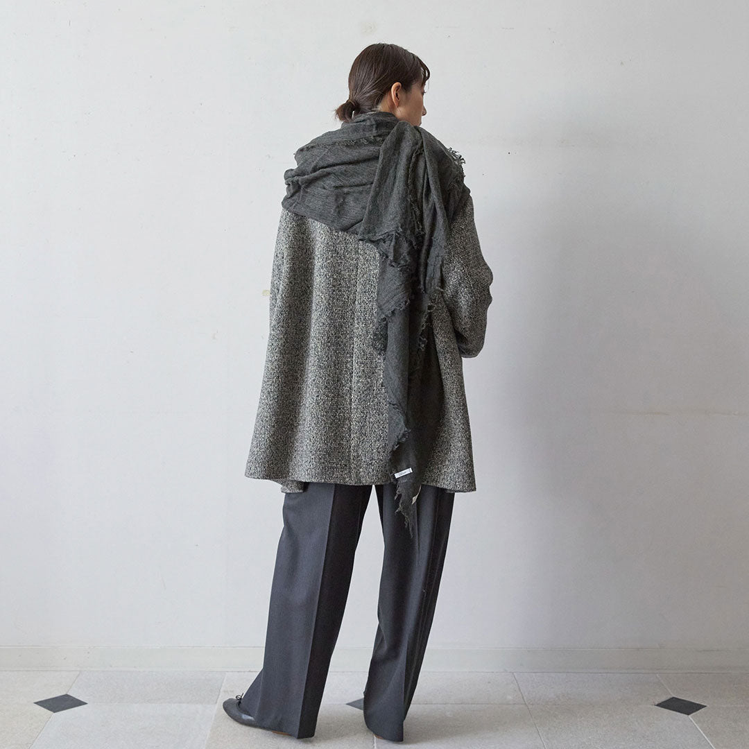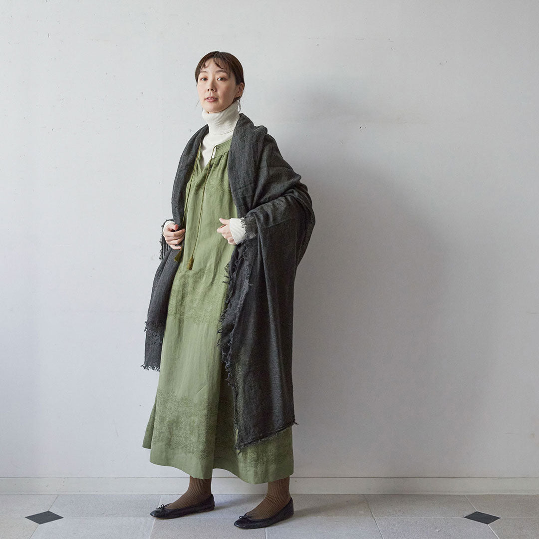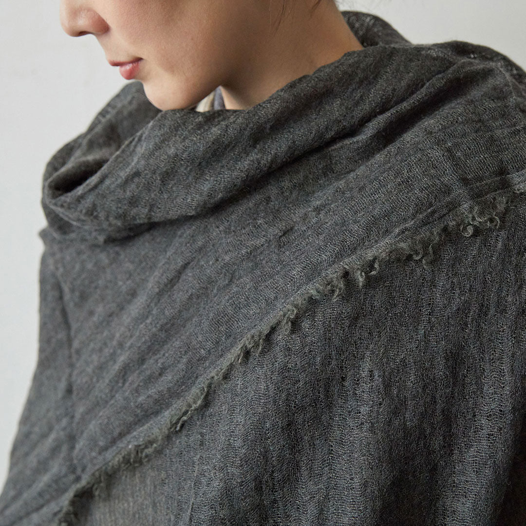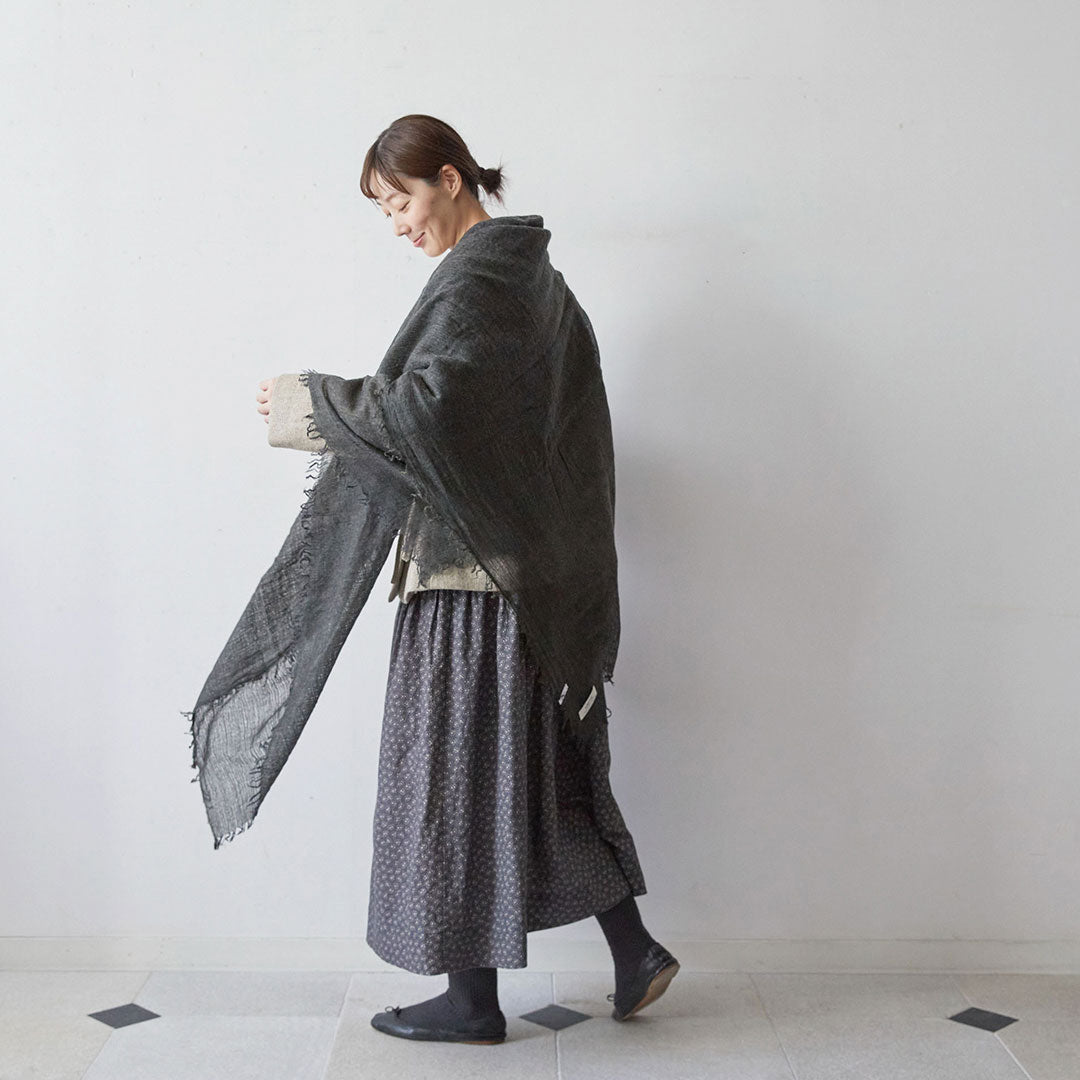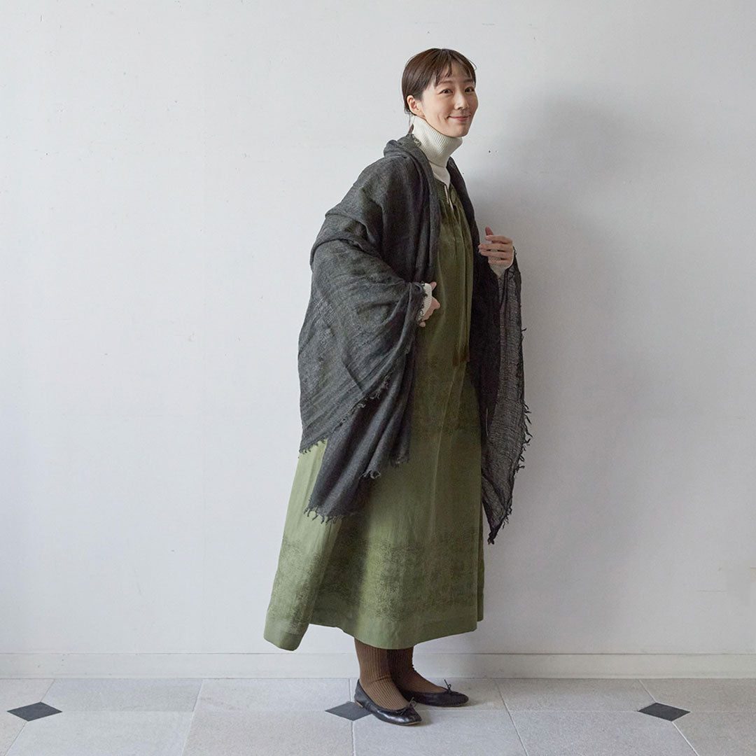 透けるほど薄いカシミヤシルクは、なめらかで優しい肌触り。とても軽いのにたっぷりと空気を含んでいるので、冬の寒さからもきちんと守ってくれる暖かさ。 コート代わりにもなる大判サイズが頼もしい1枚です。