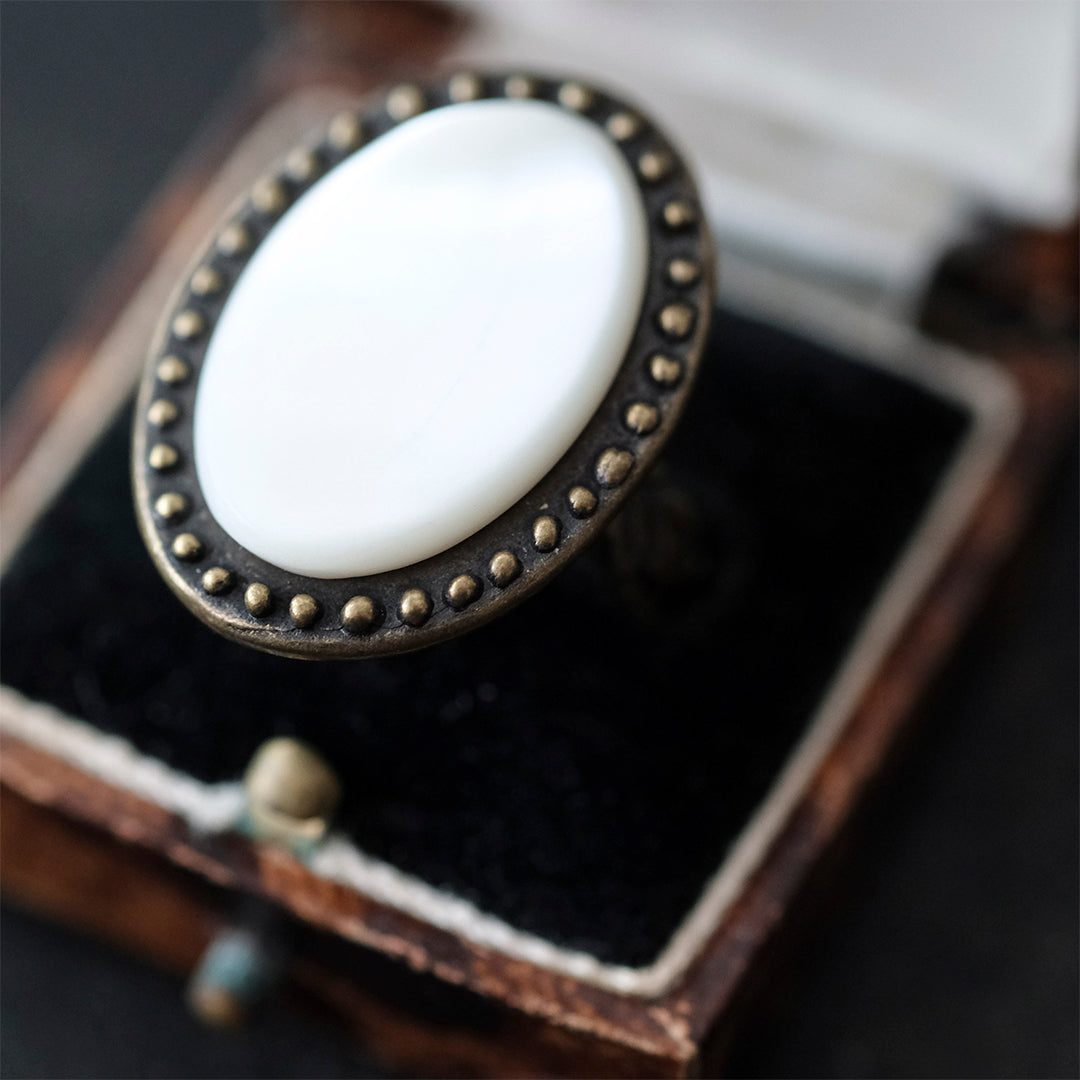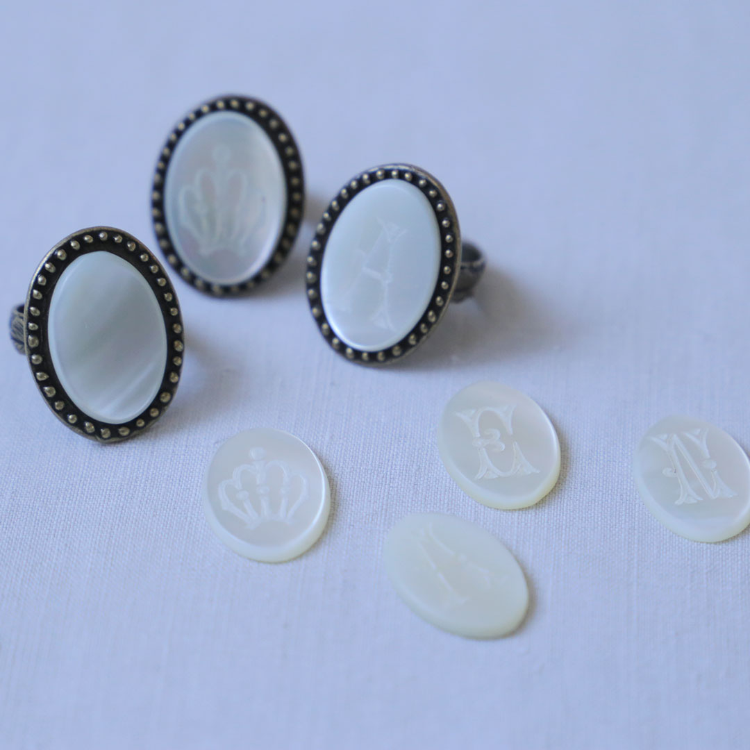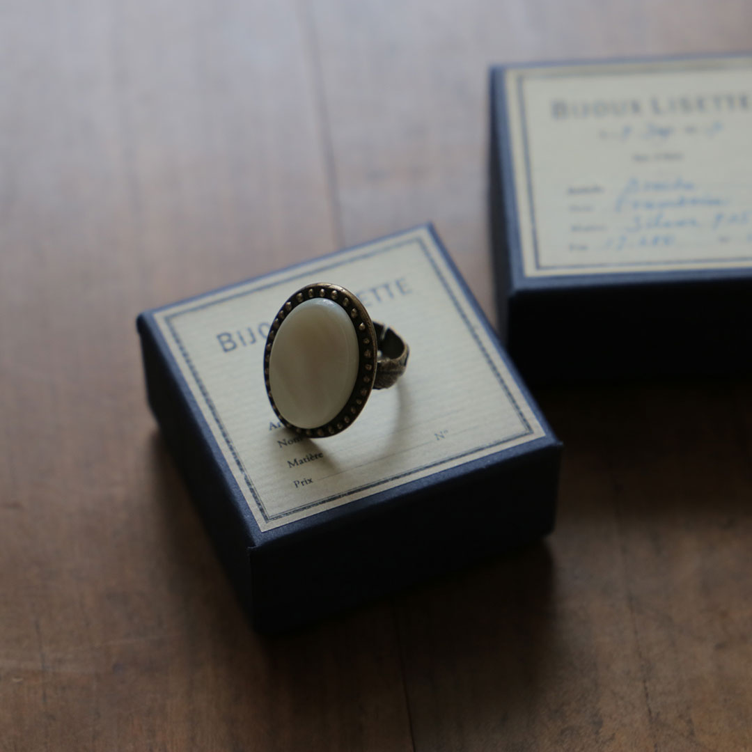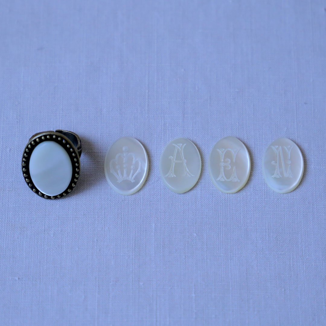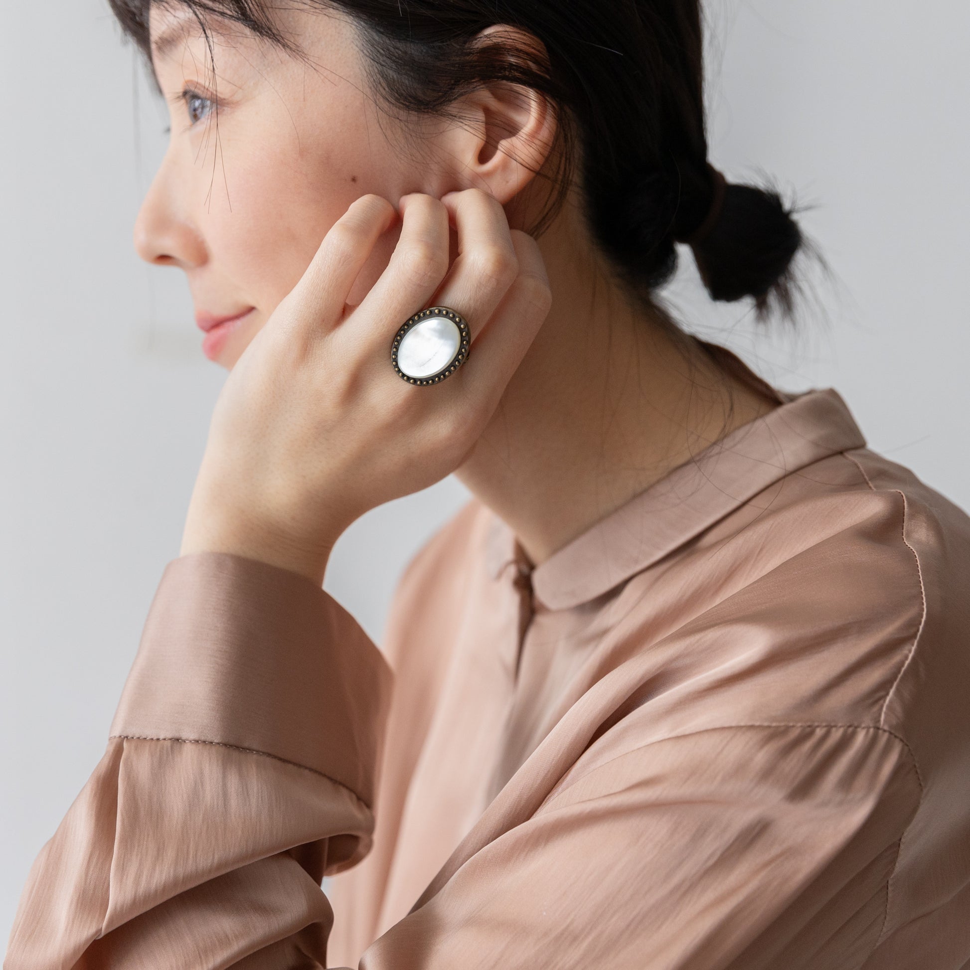 リゼッタでは洋服と同じように、アクセサリーも永く大切にしたいと思ってもらえるようなものづくりをしています。貝の柔らかな光沢が美しい大ぶりのリング「バーグ・オヴァル」。ご希望の方には貝の部分に、王冠、A~Zのアルファベットの中からお好みのものをひとつ彫刻いたします。