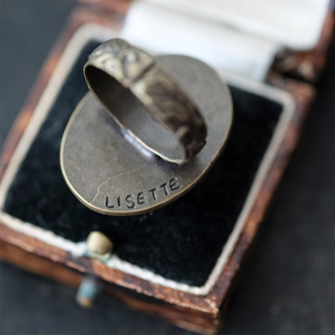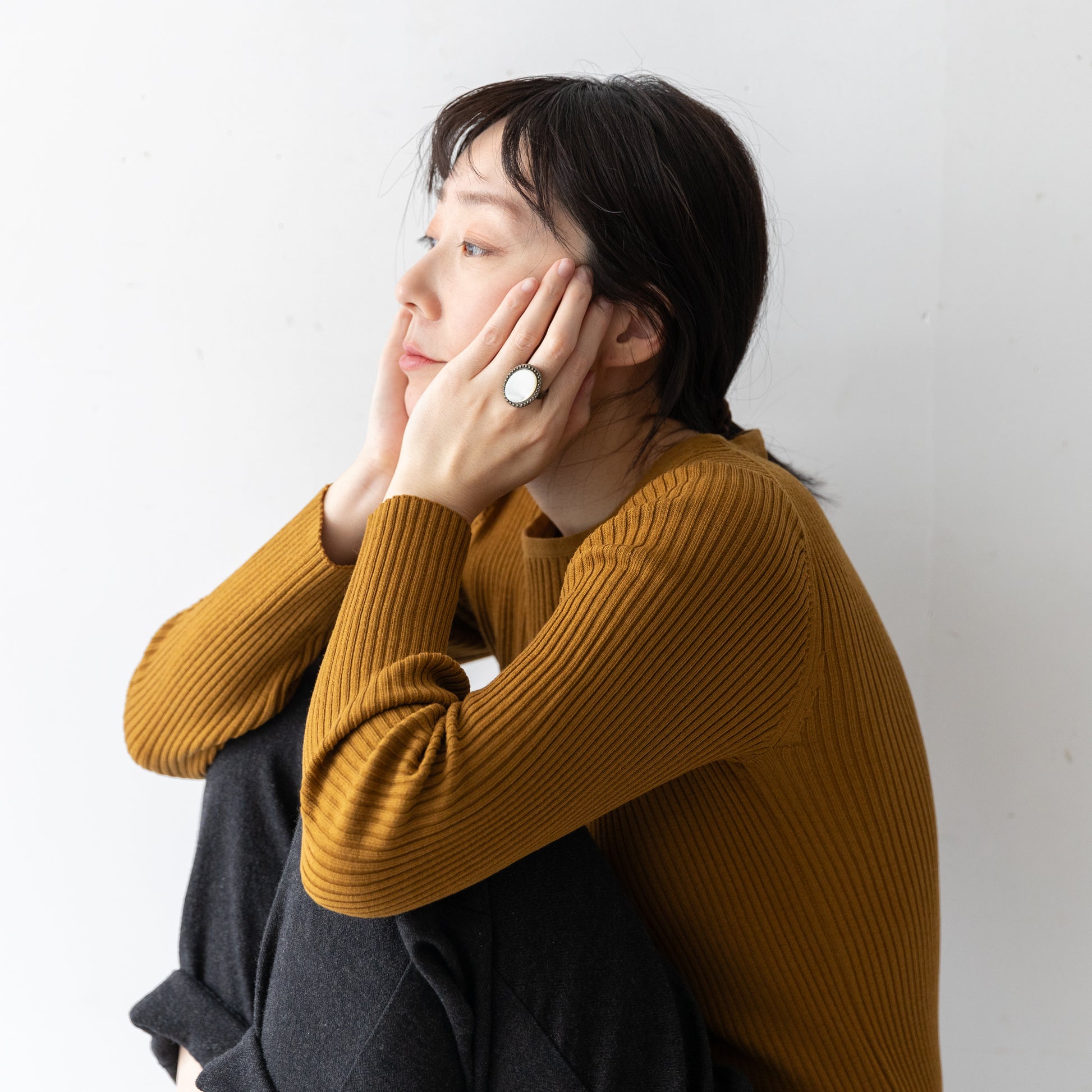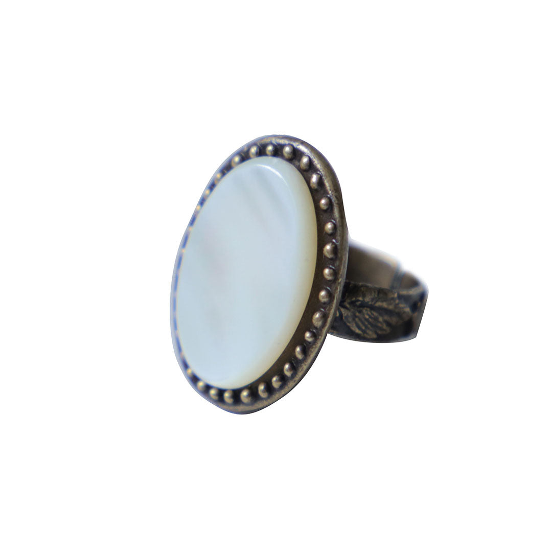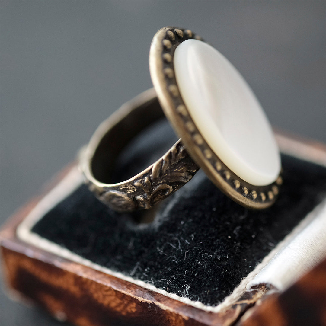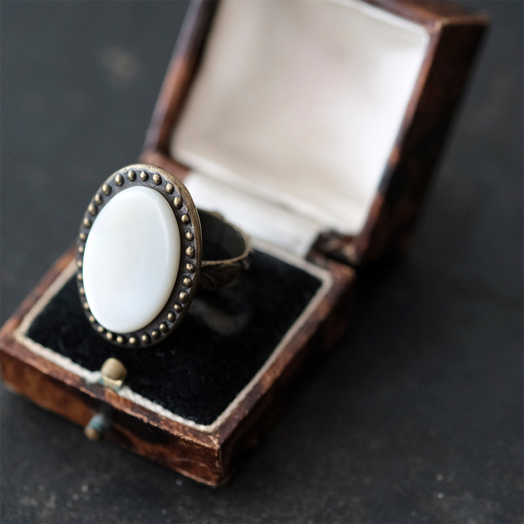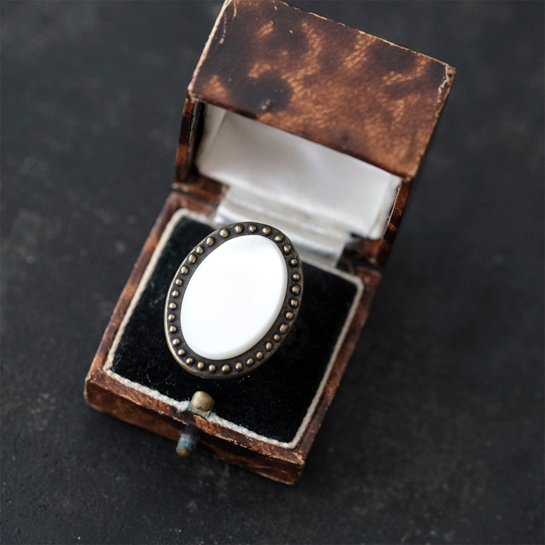 リゼッタでは洋服と同じように、アクセサリーも永く大切にしたいと思ってもらえるようなものづくりをしています。貝の柔らかな光沢が美しい大ぶりのリング「バーグ・オヴァル」。ご希望の方には貝の部分に、王冠、A~Zのアルファベットの中からお好みのものをひとつ彫刻いたします。