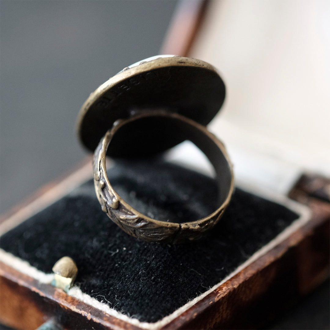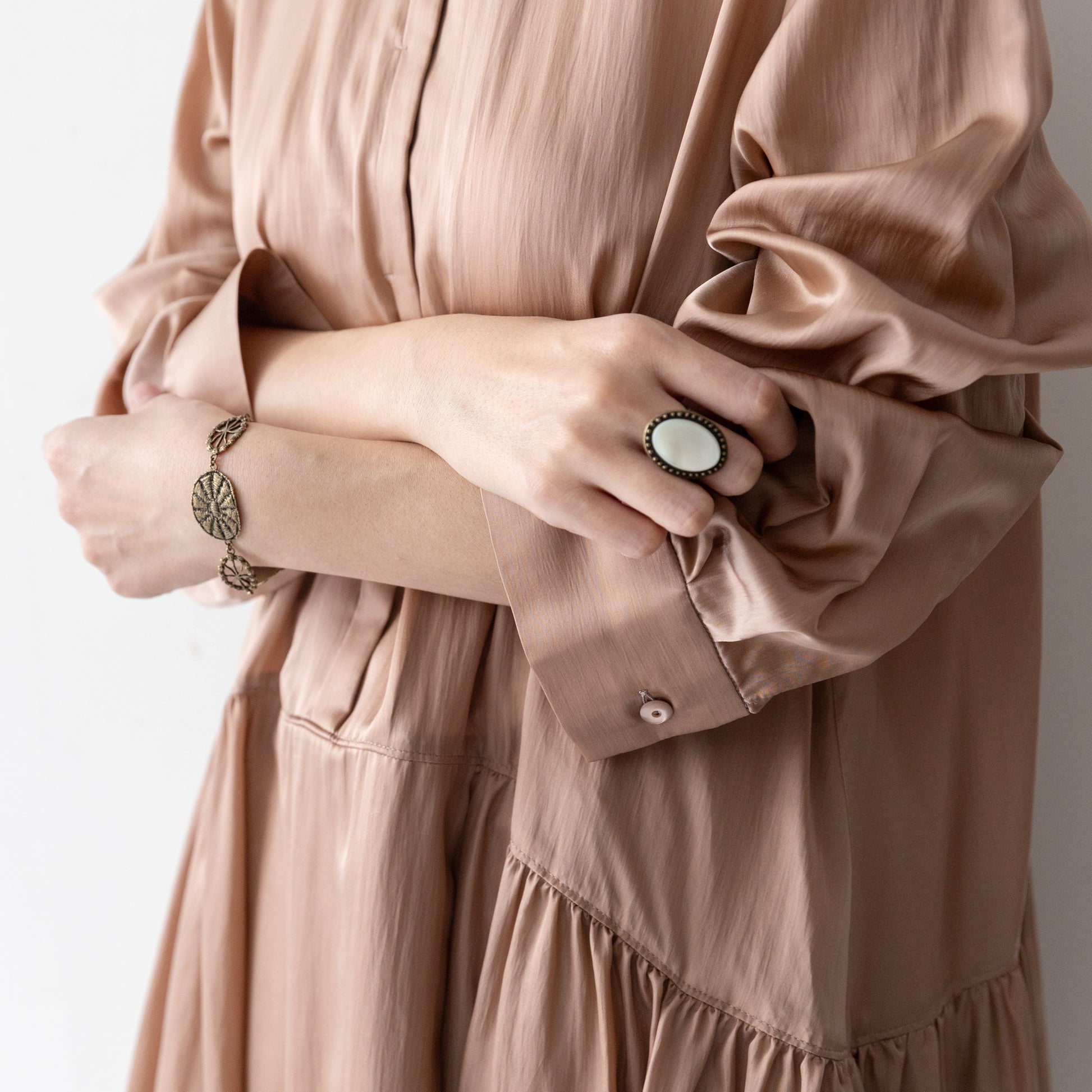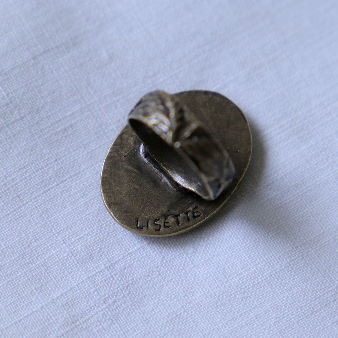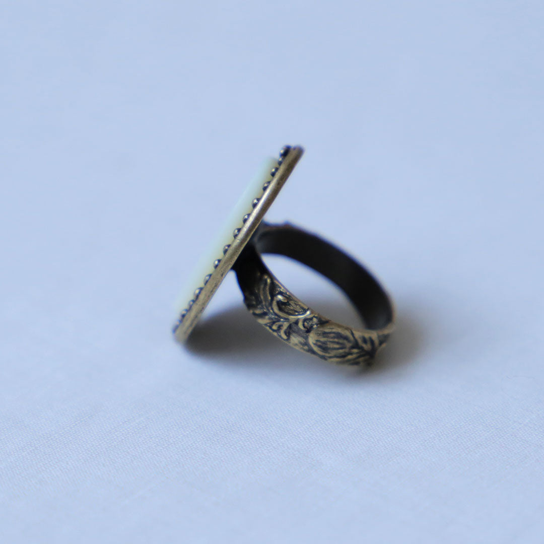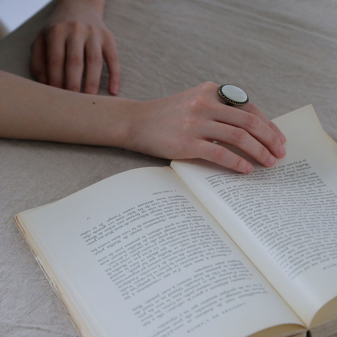 リゼッタでは洋服と同じように、アクセサリーも永く大切にしたいと思ってもらえるようなものづくりをしています。貝の柔らかな光沢が美しい大ぶりのリング「バーグ・オヴァル」。ご希望の方には貝の部分に、王冠、A~Zのアルファベットの中からお好みのものをひとつ彫刻いたします。