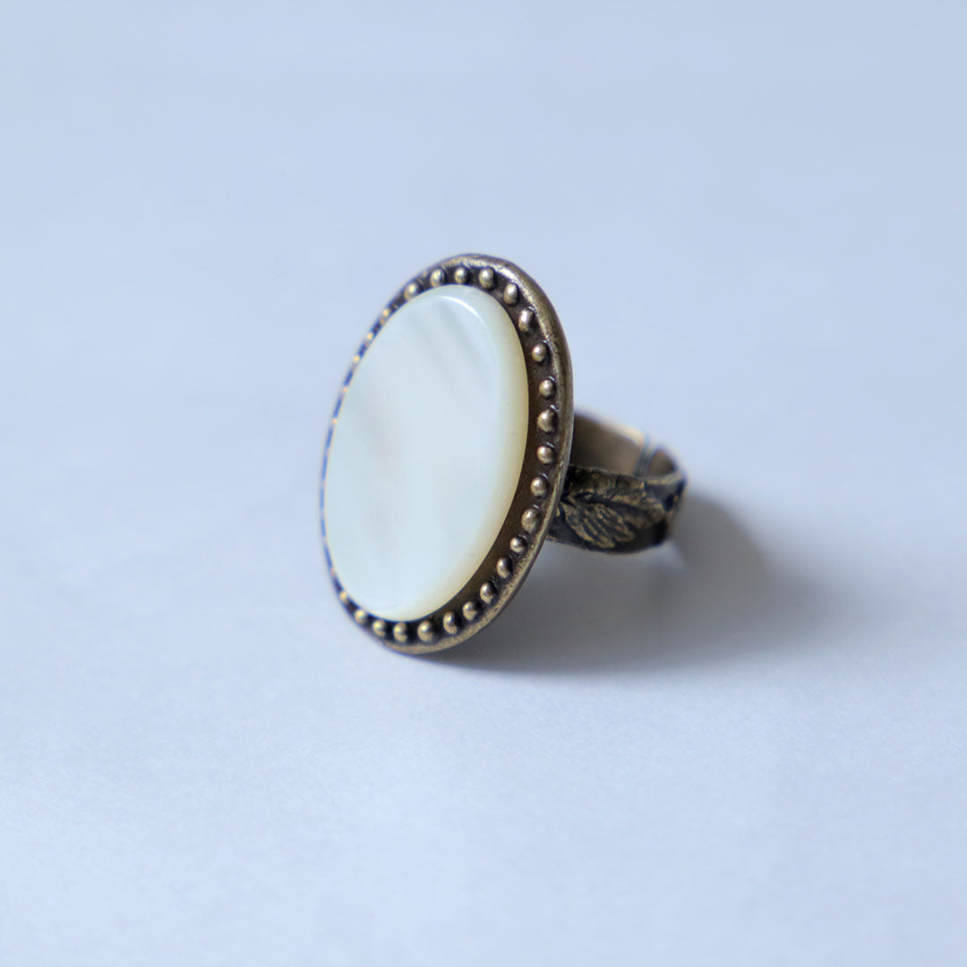 貝の優しい色味と、あたたかみのある真鍮を組み合わせたリング。自分の手元を見ると穏やかな気持ちになります。