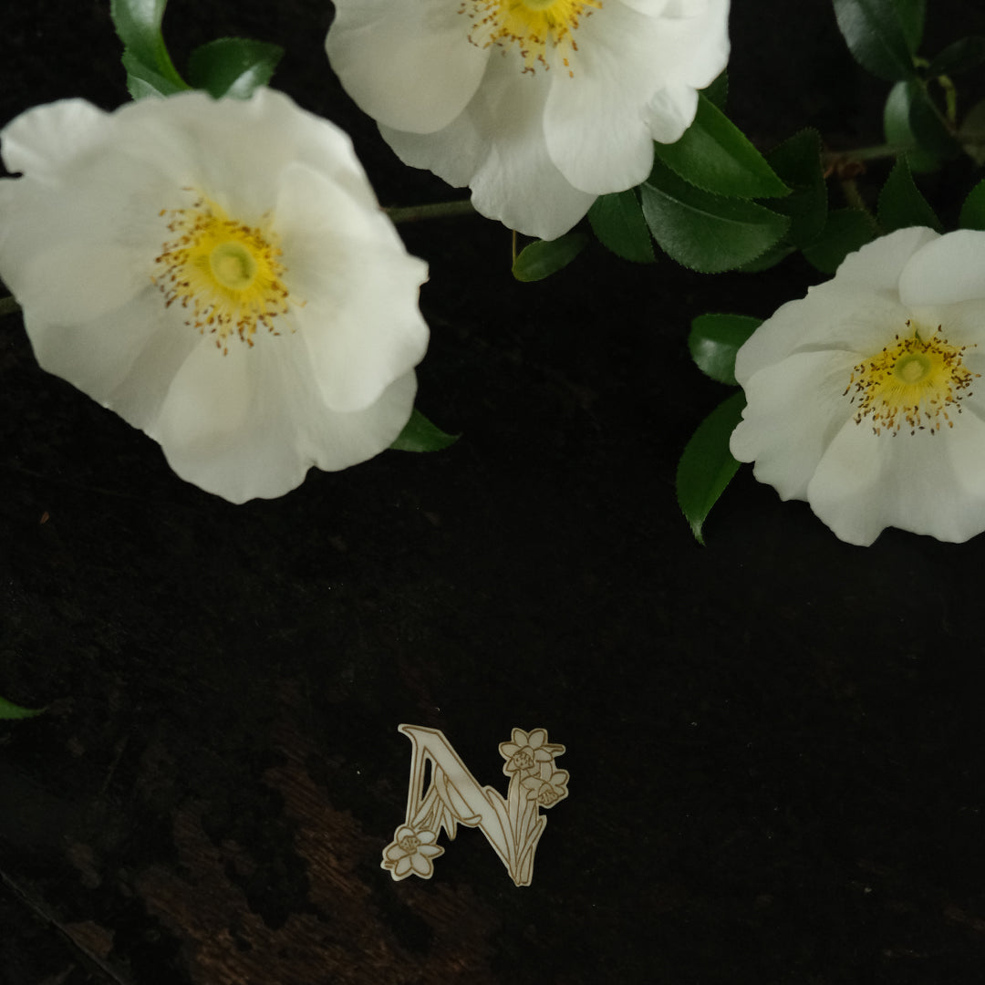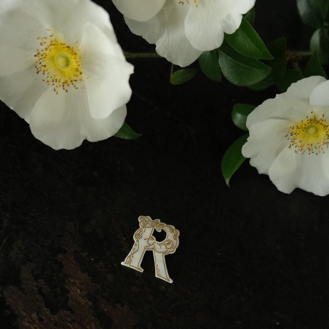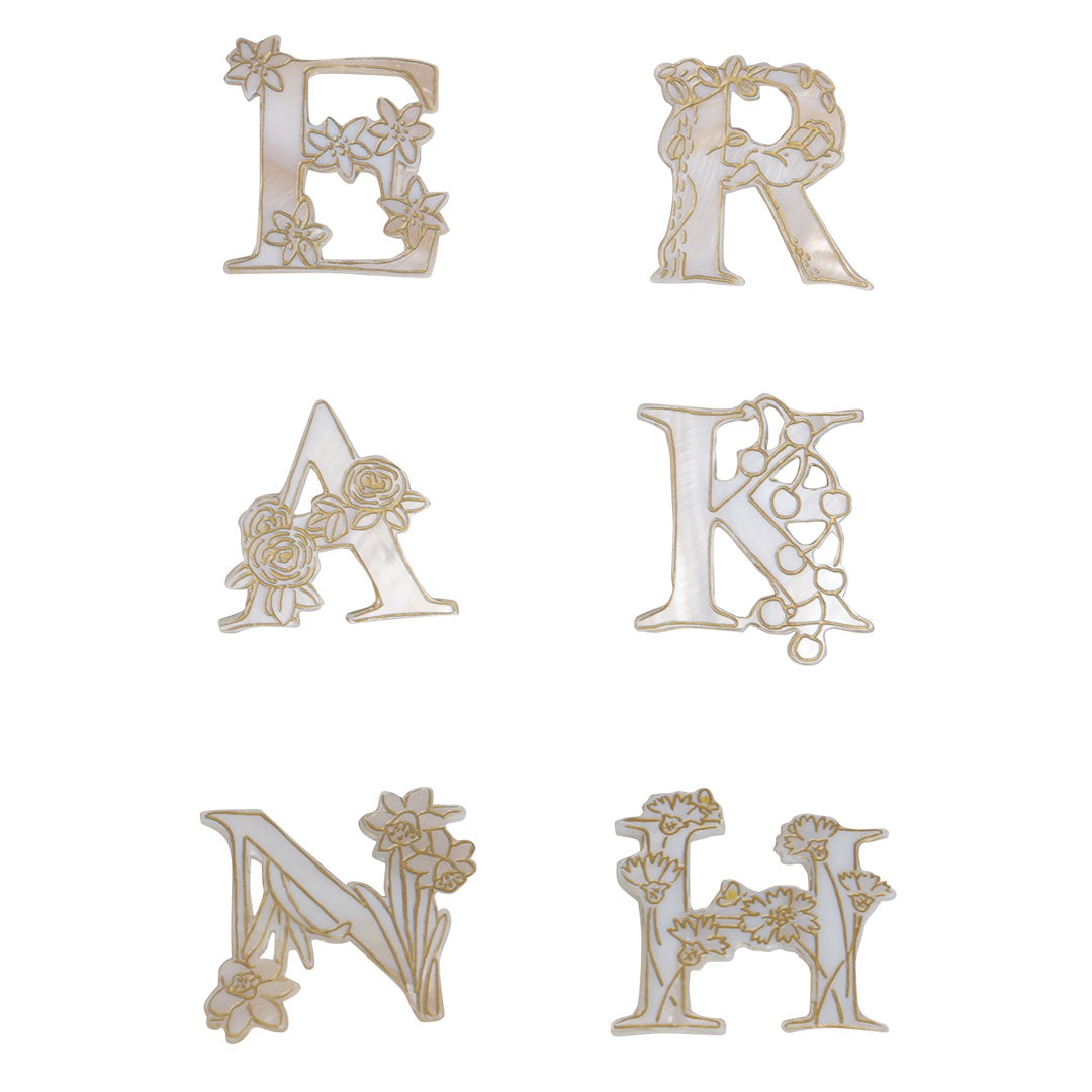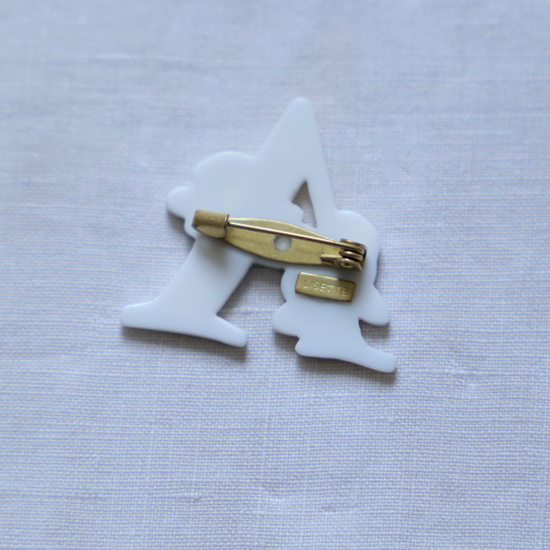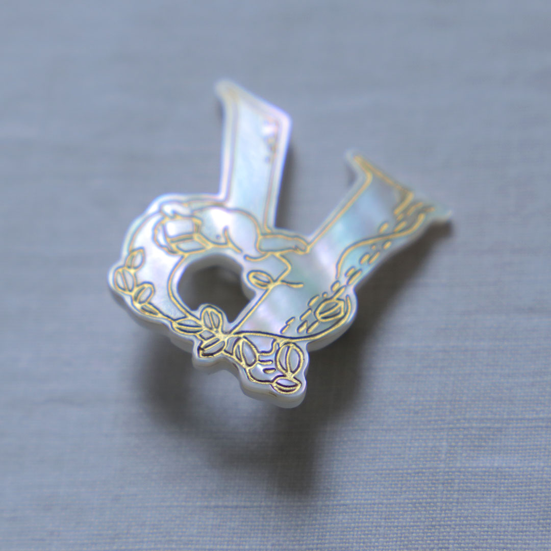 アルファベットをモチーフにしたブローチ。 貝のやわらかな光沢が胸元を飾ります。 天然素材を使用しているため、若干の個体差があります。
