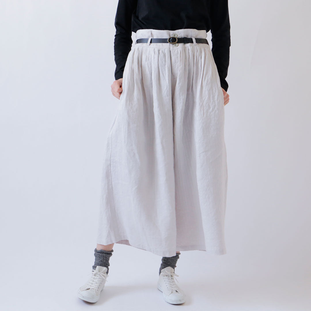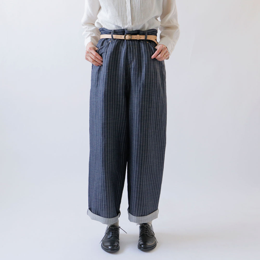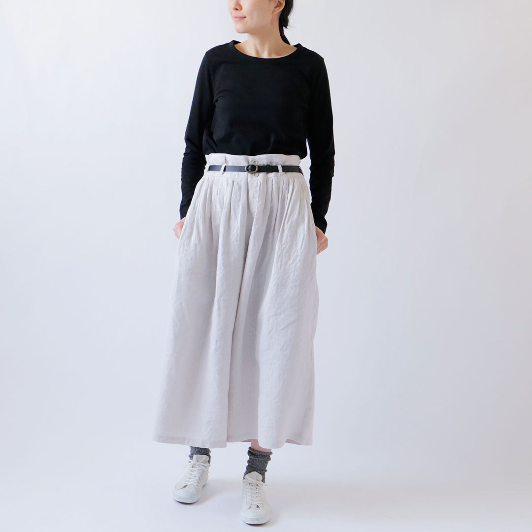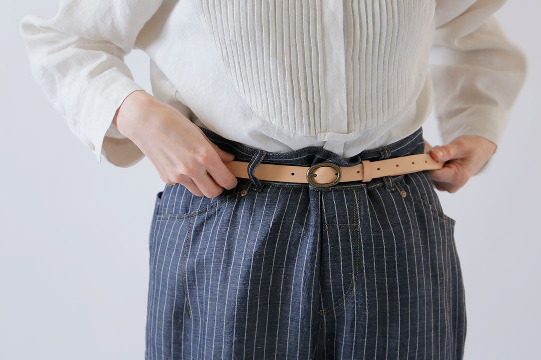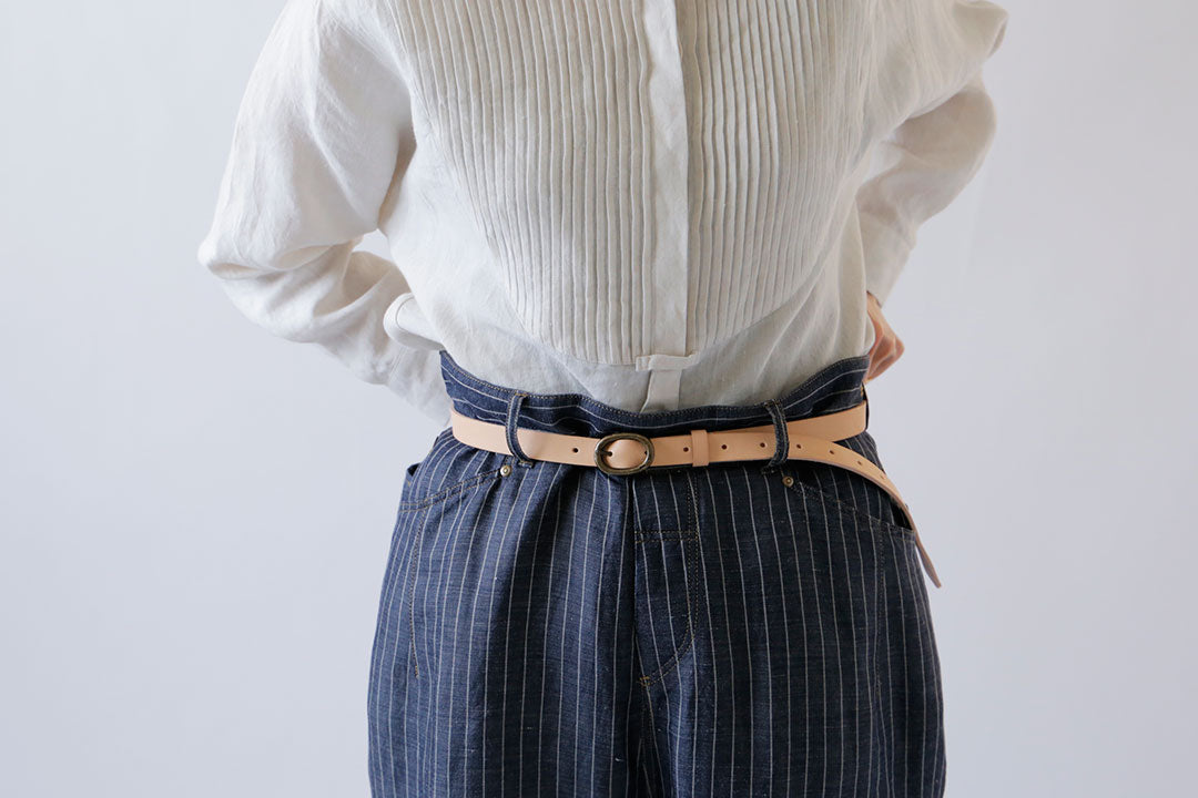 ウエストをきゅっと絞ってブラウジング。幅2センチと細めなので、ワンピースの着丈調節としても活躍します。▲ナチュラル トップス:エステル パンツ:パスカル (モデル身長166cm)