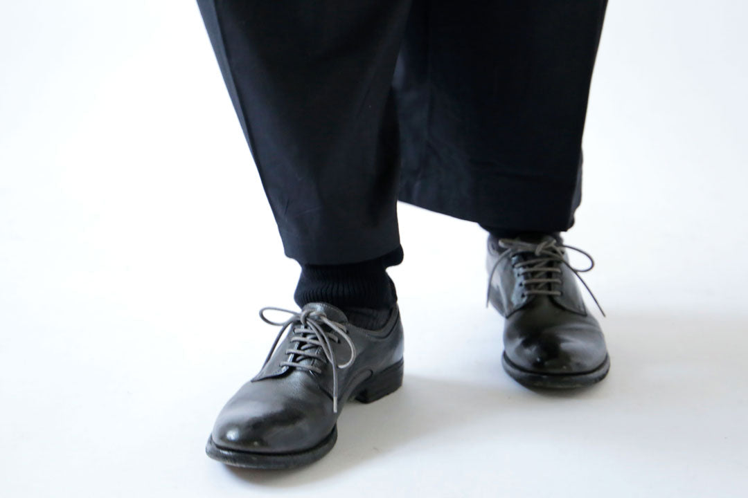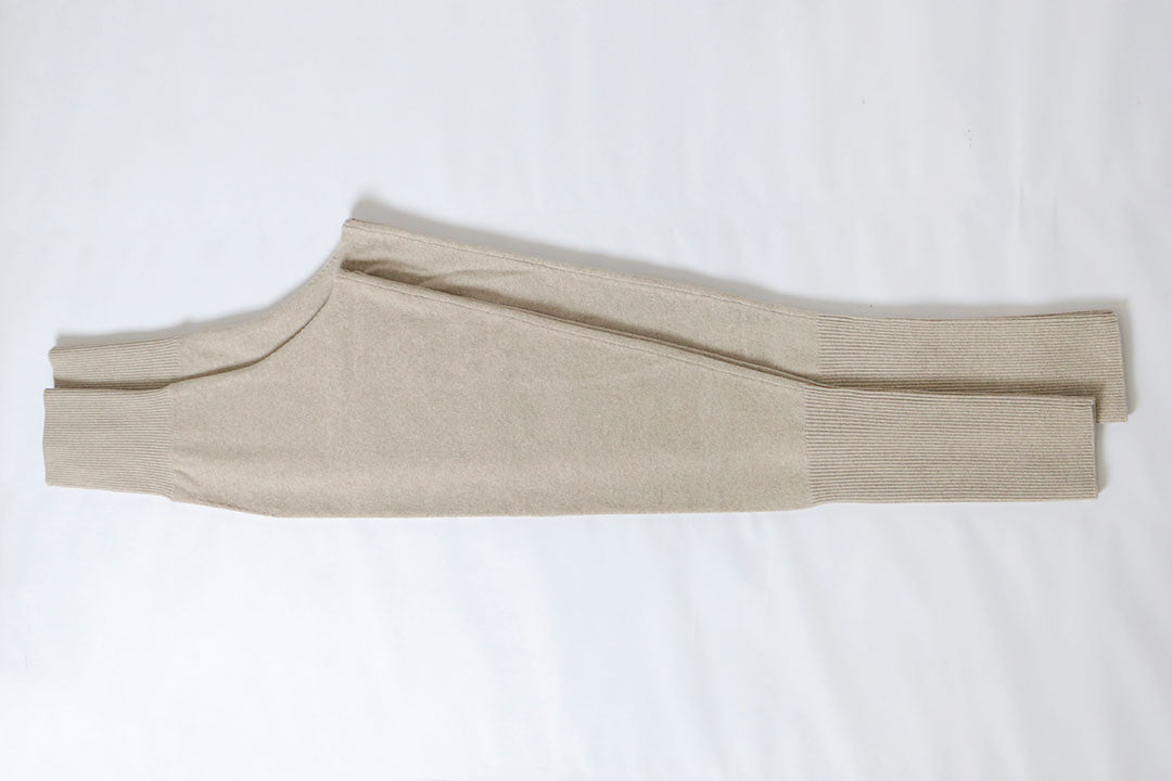 2024年に生産から、「アコーディオン・トリコ」は、HÉRNIの「No.23ラウンジパンツ」として生まれ変わりました。サイズ展開をなくし、ワンサイズに変更しました。2023年に生産した商品の36サイズをベースにしています。また、色展開はトップベージュとチャコールです。トップベージュは2023年に生産したテ・オレと同色で、色名だけ変更しました。2024年製は、ブラックの生産はありません。