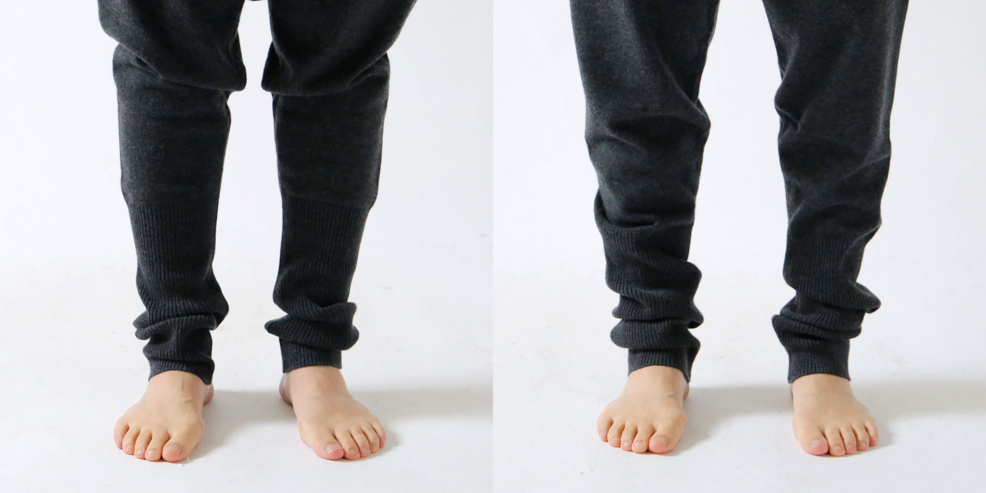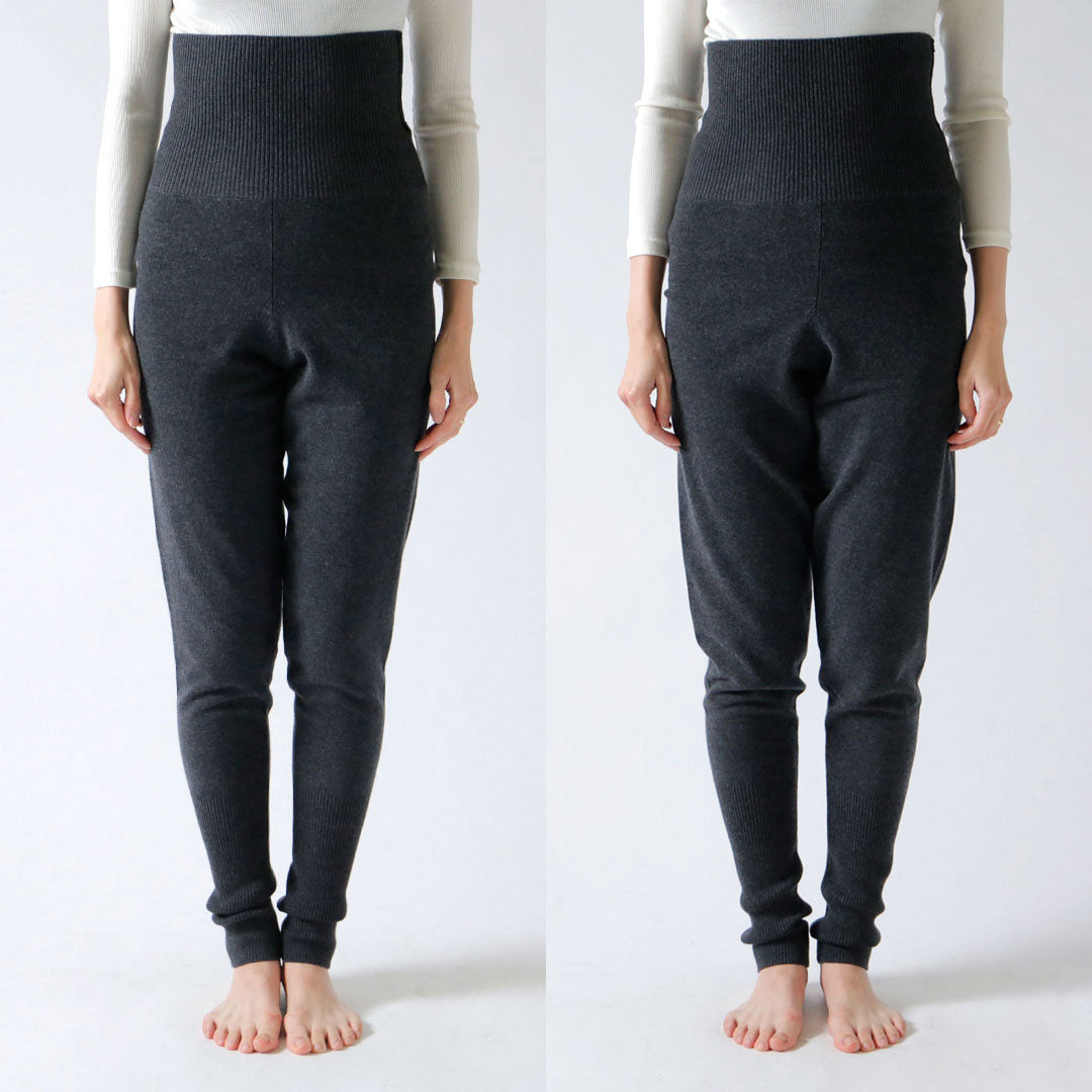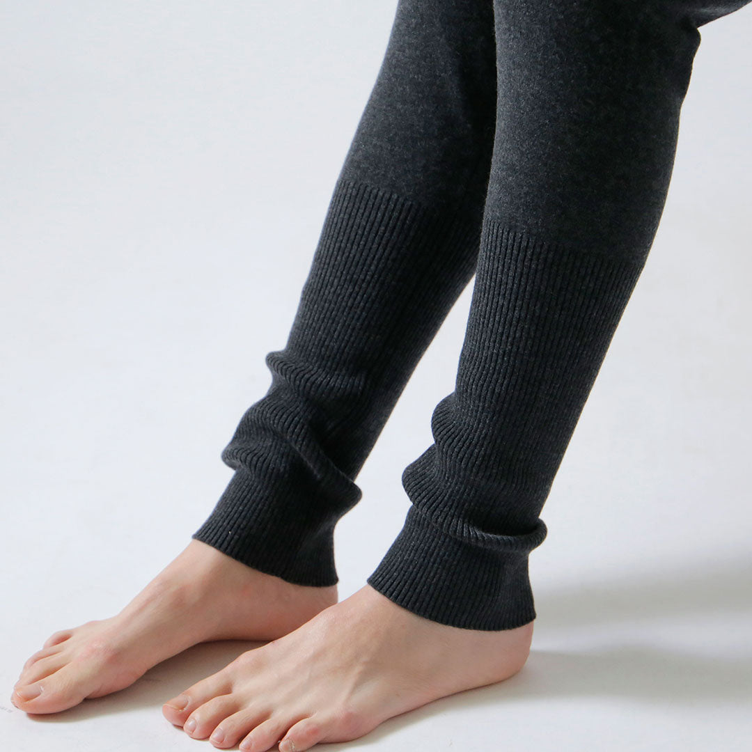 ウエストのリブ編みは腹巻のように広幅で程よく腰まわりを包みます。この部分には伸縮糸を入れているので、くり返し履いても動き続けてもずり落ちる心配はありません。