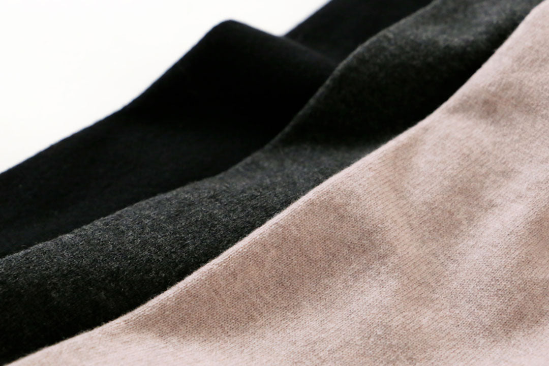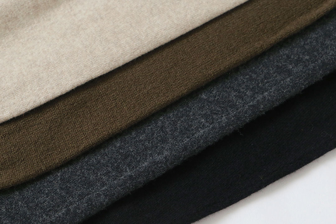 細い番手のウールで編んだ生地は、カシミヤのような肌ざわり。希少なウルグアイのメリノウールを使用しています。