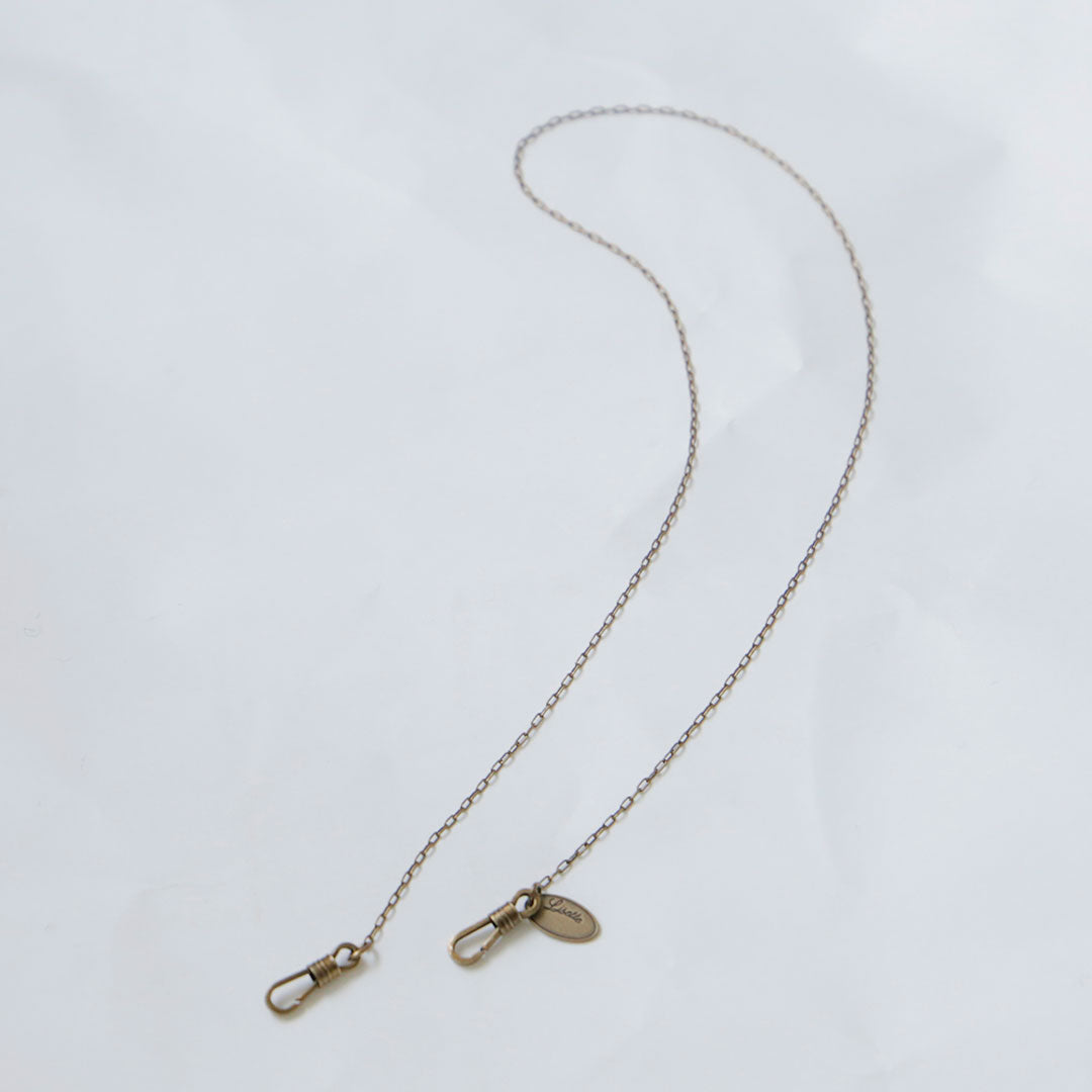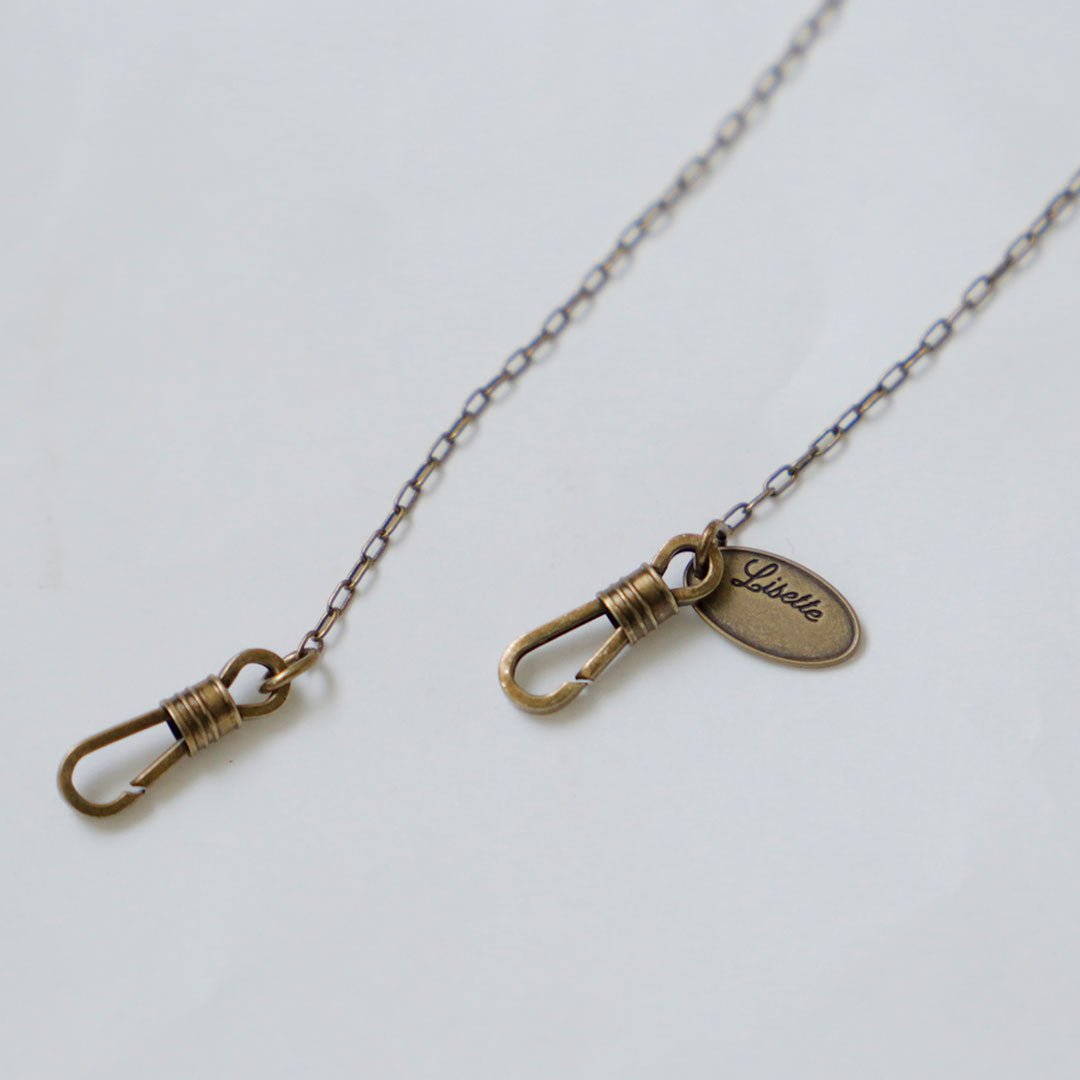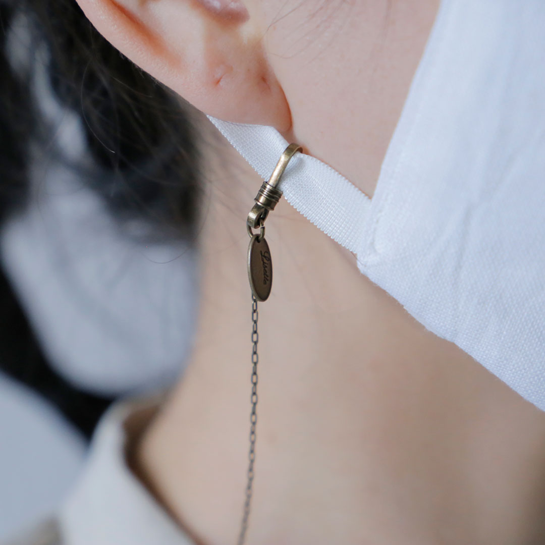 机やポケットにしまわず衛生的にマスクを外せます。あくまでもさりげない、シンプルなデザインに。リゼッタらしい雰囲気で。≪マスクの取り付け方≫1.線が入った筒状の金具を上に引き上げます。2.口が開いた金具にゴムをそっと引っ掛けます。3.首のうしろにまわして着用します。素材 真鍮サイズ 全長:45cm