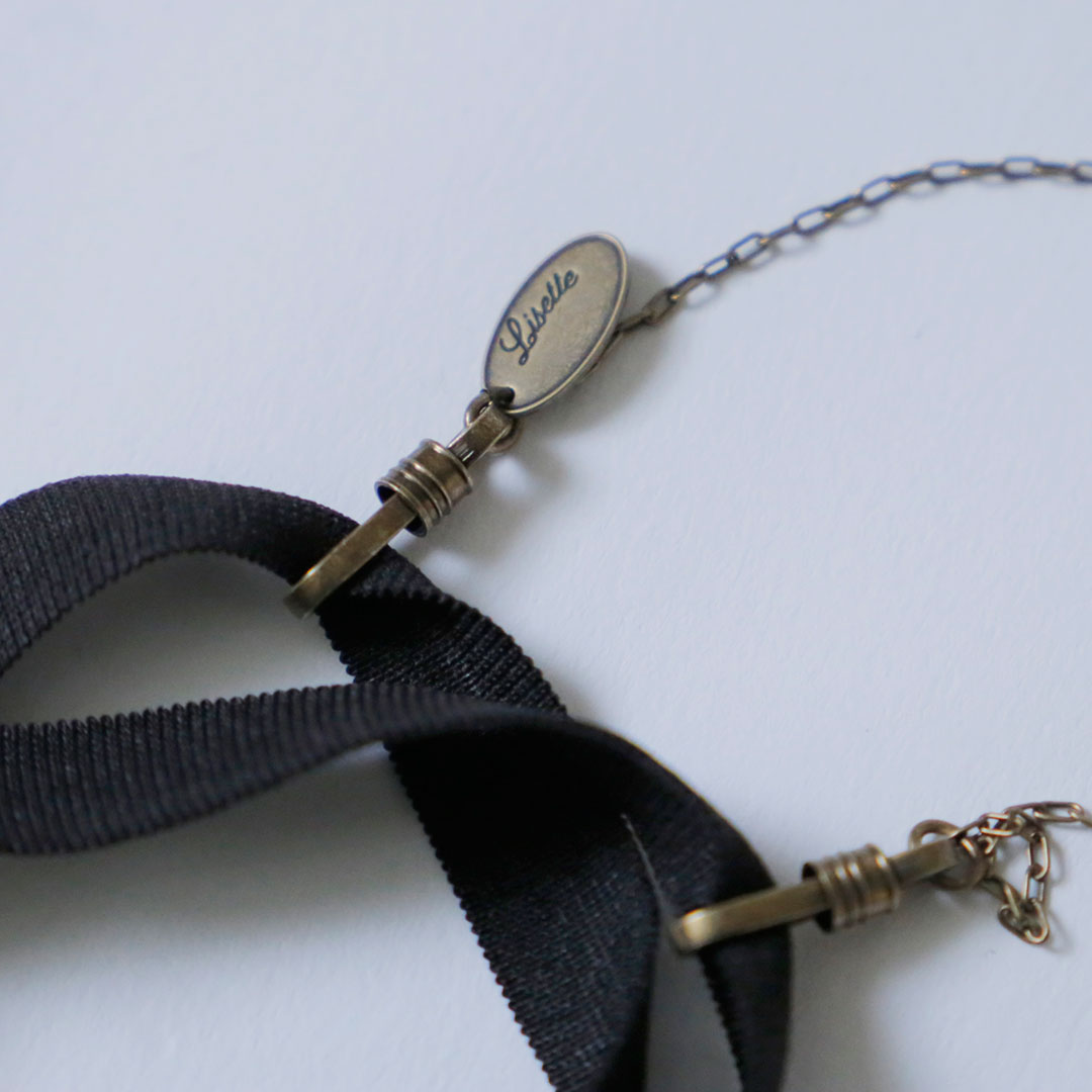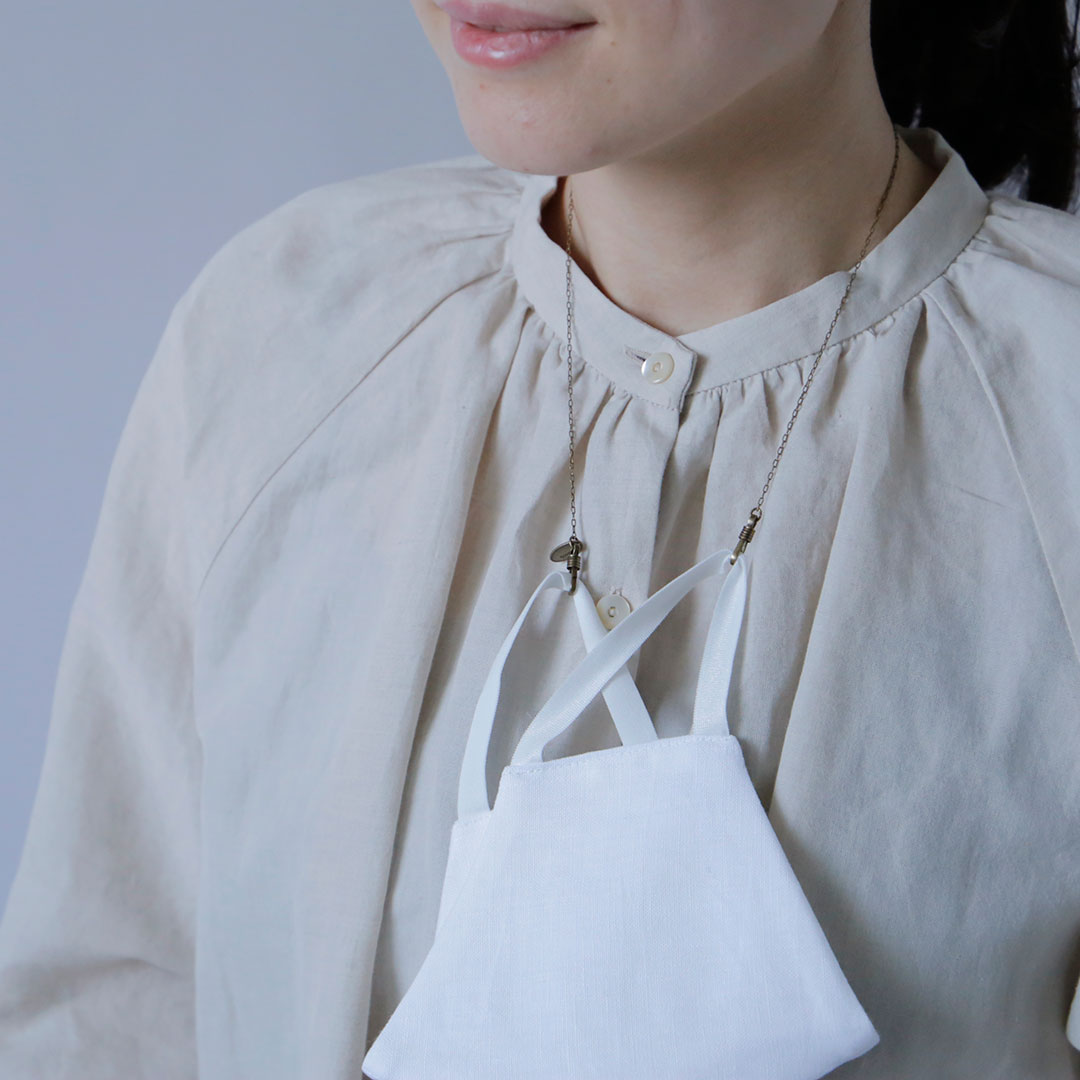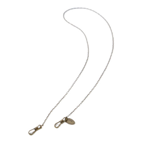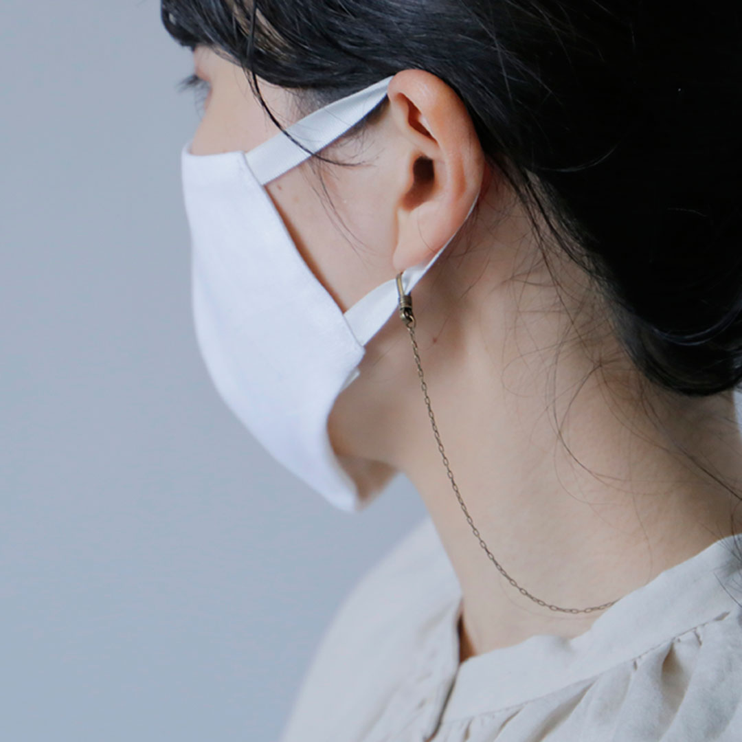 机やポケットにしまわず衛生的にマスクを外せます。あくまでもさりげない、シンプルなデザインに。リゼッタらしい雰囲気で。≪マスクの取り付け方≫1.線が入った筒状の金具を上に引き上げます。2.口が開いた金具にゴムをそっと引っ掛けます。3.首のうしろにまわして着用します。素材 真鍮サイズ 全長:45cm