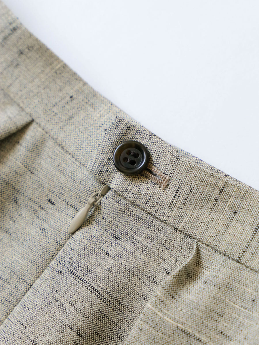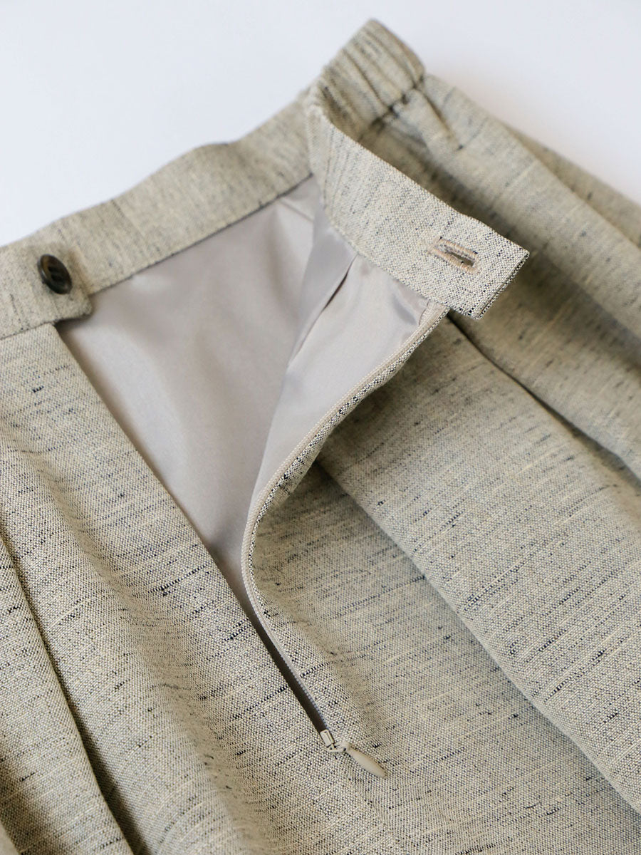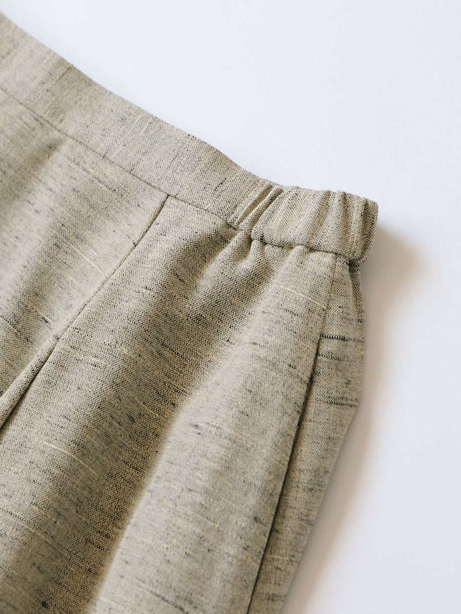 リネンレーヨンという異素材の織りなす生地は、緯糸にリネンレーヨンのスラブ糸を使い、生地の濃淡とテクスチャーを生み出しています。