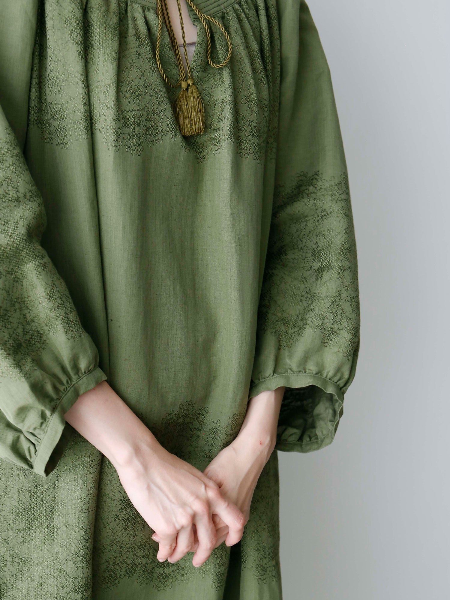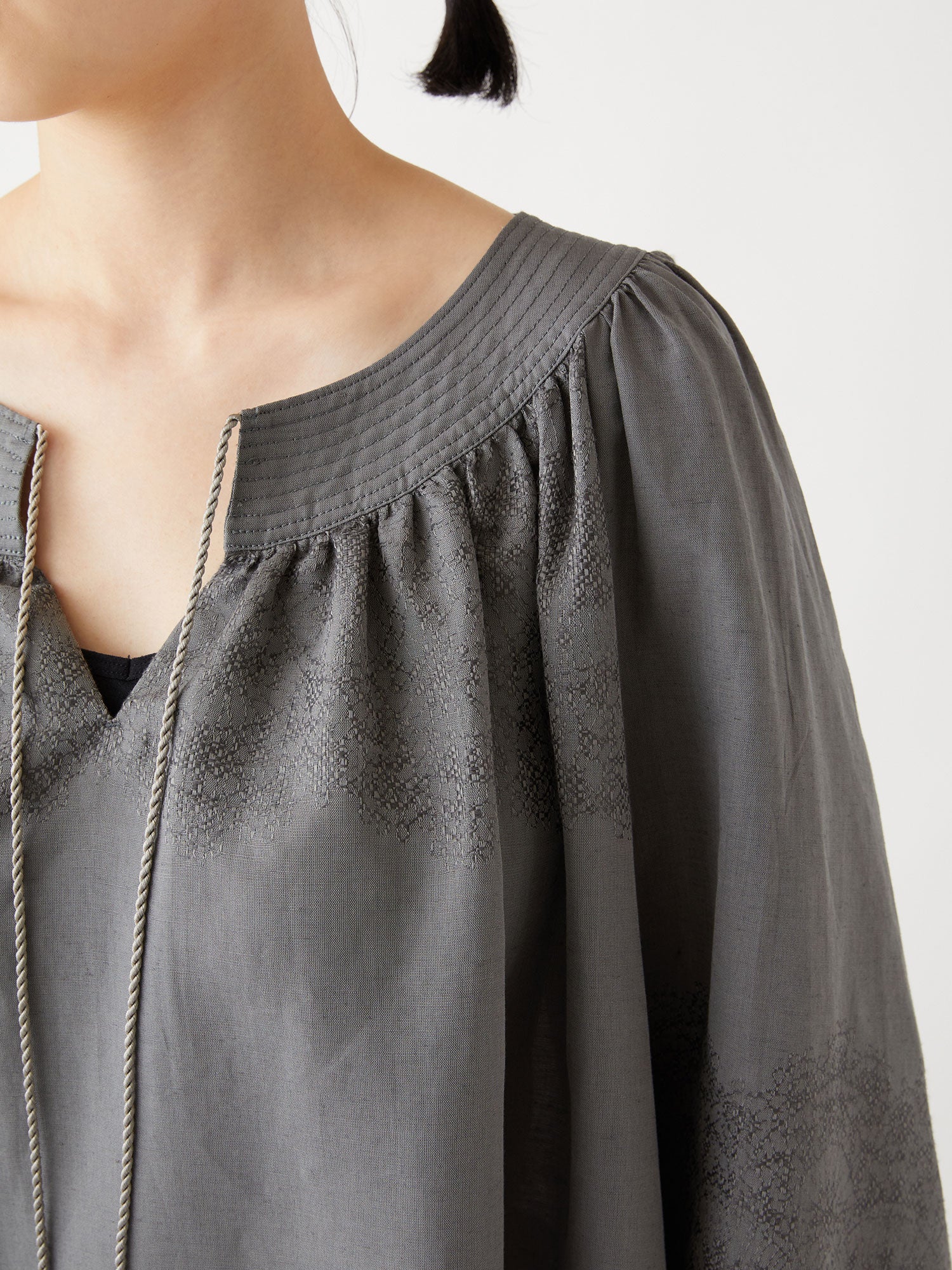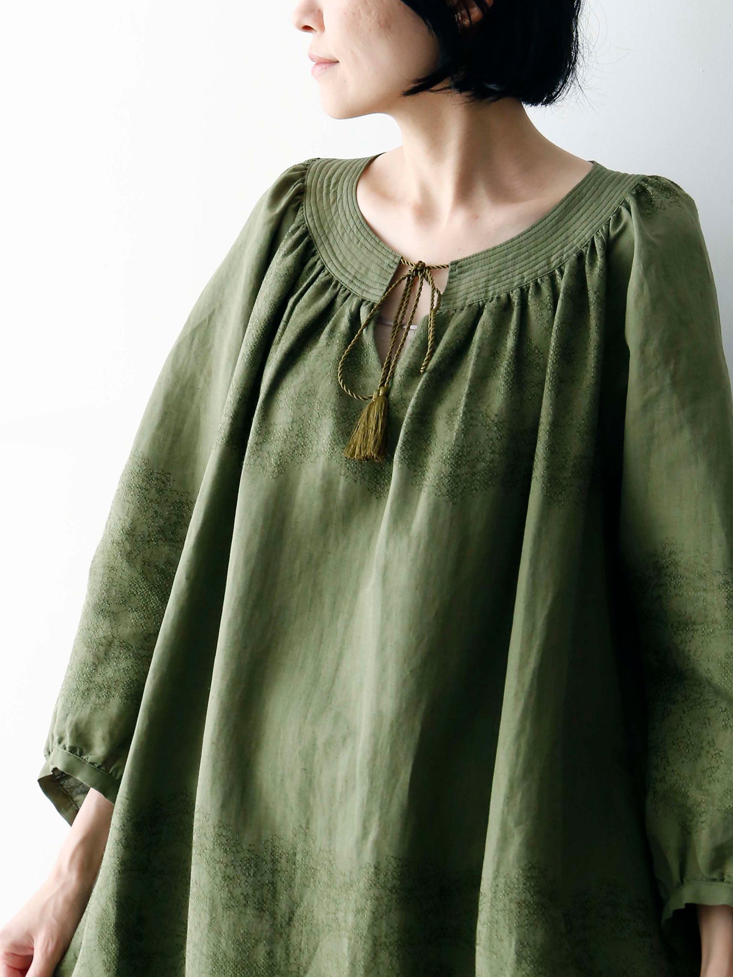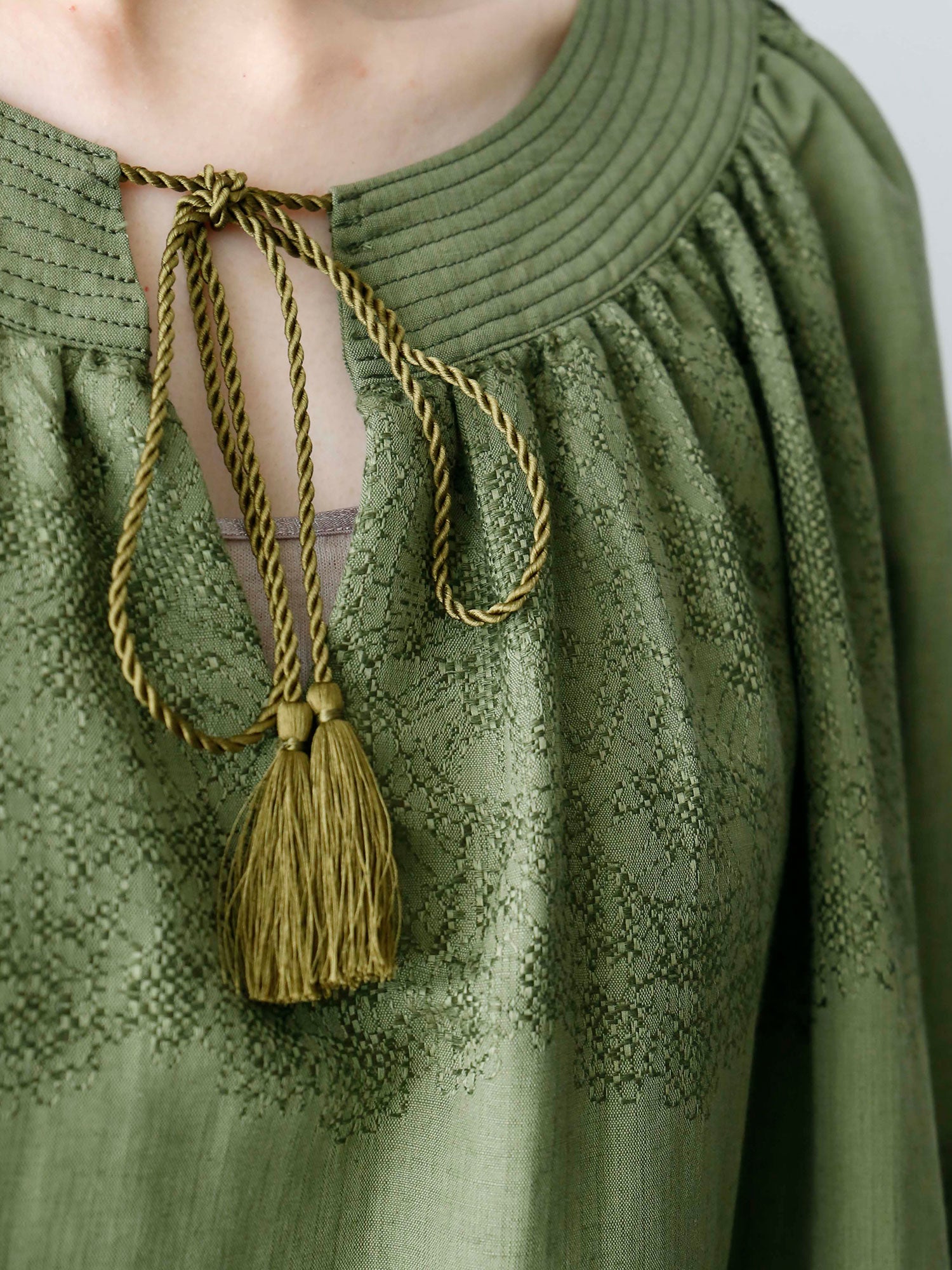身頃、裾、袖に生地と同色の刺繍。襟元にはギャザーを寄せました。タッセルは結んでリボンにしても、そのまま垂らしてインナーをのぞかせても。