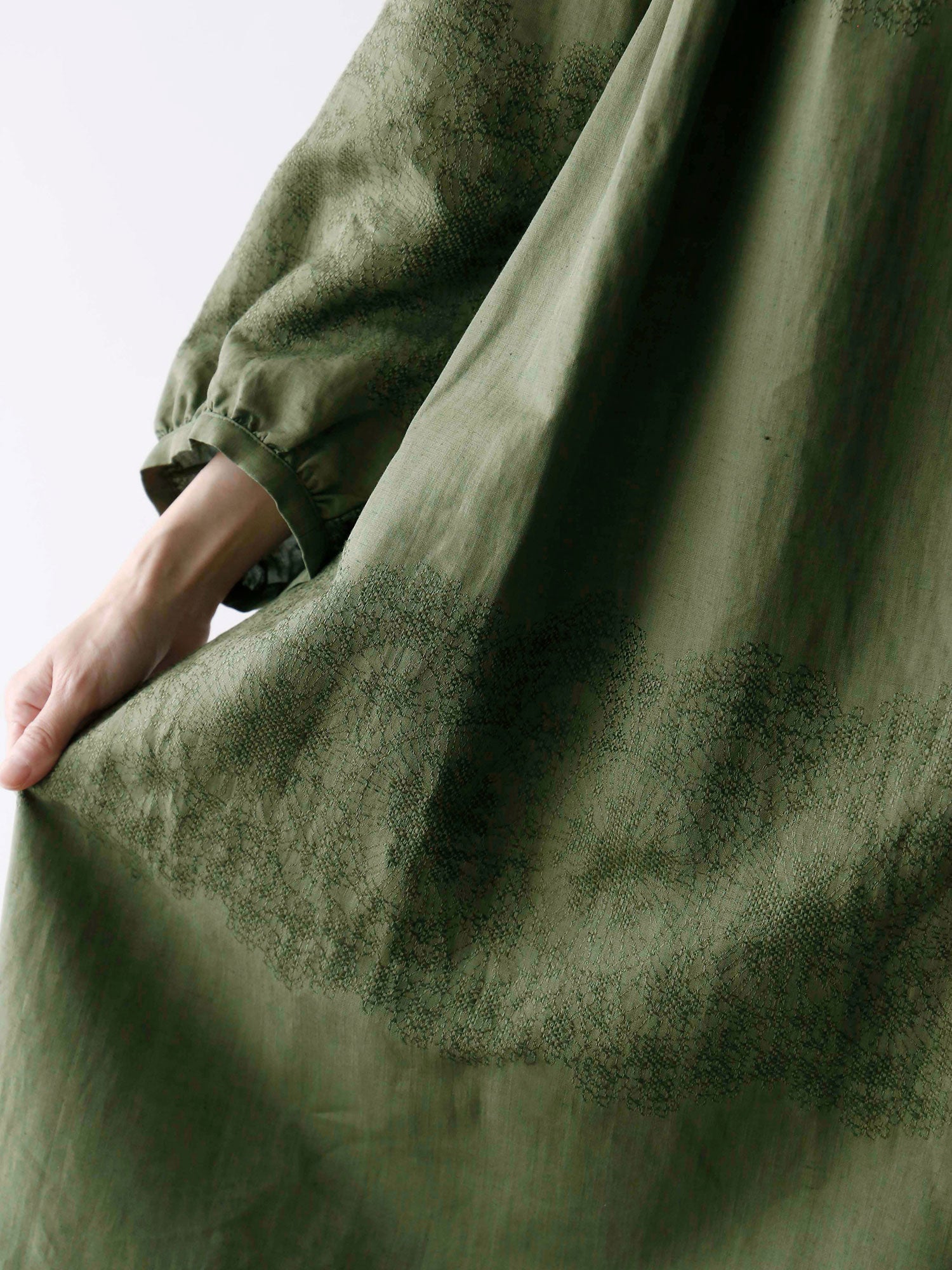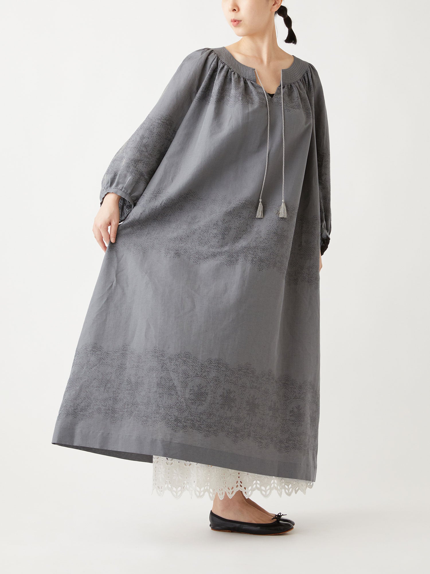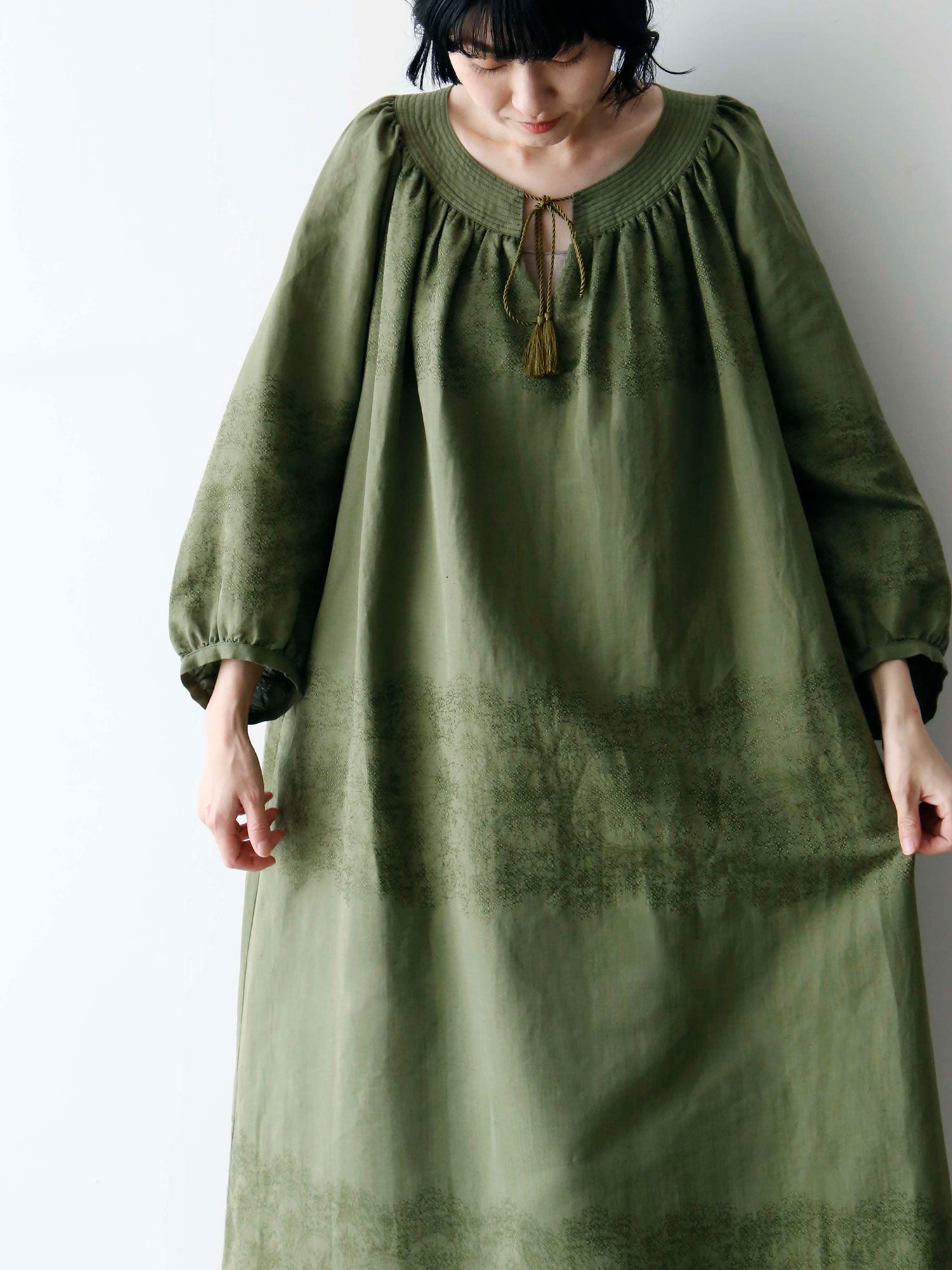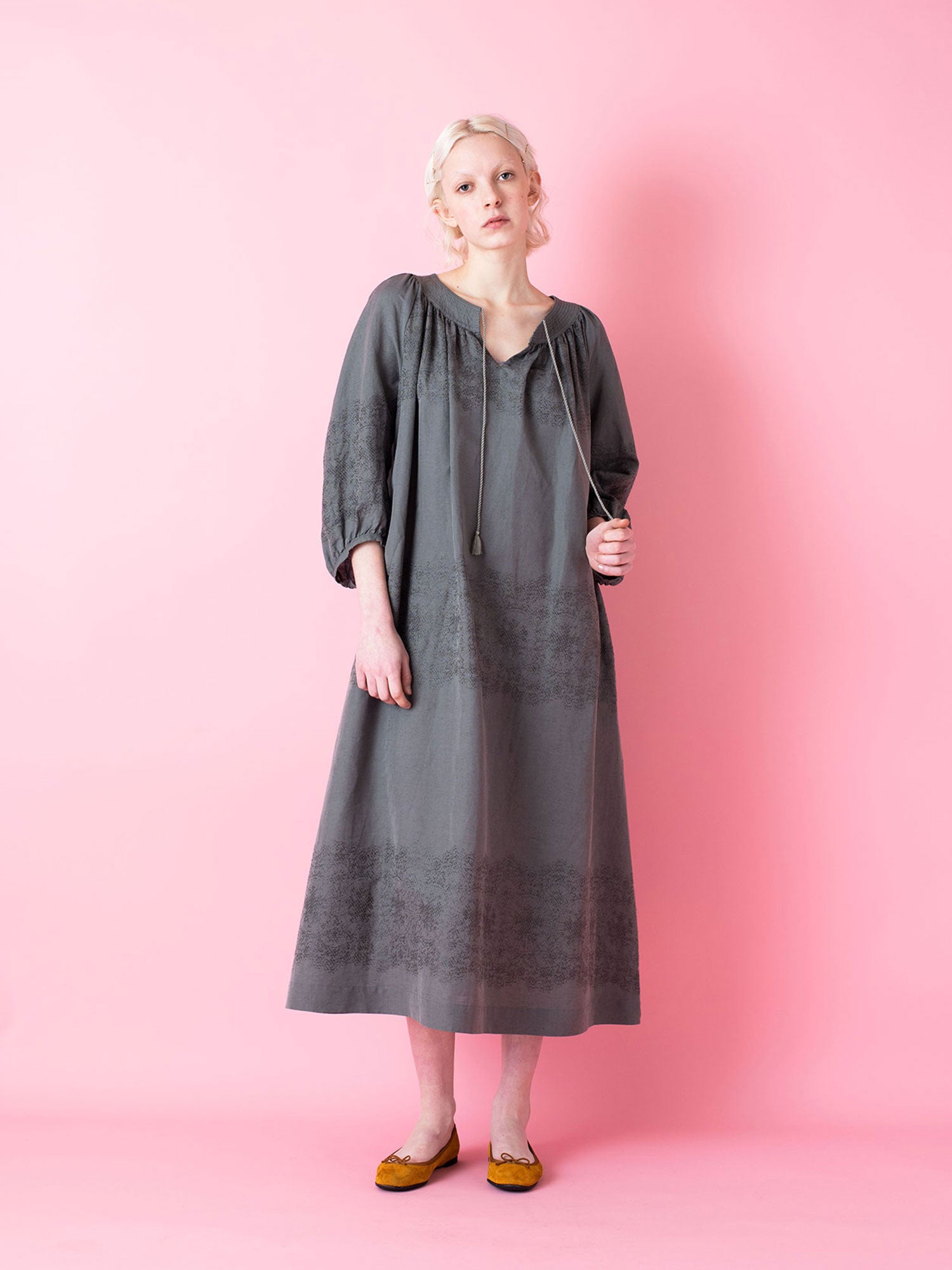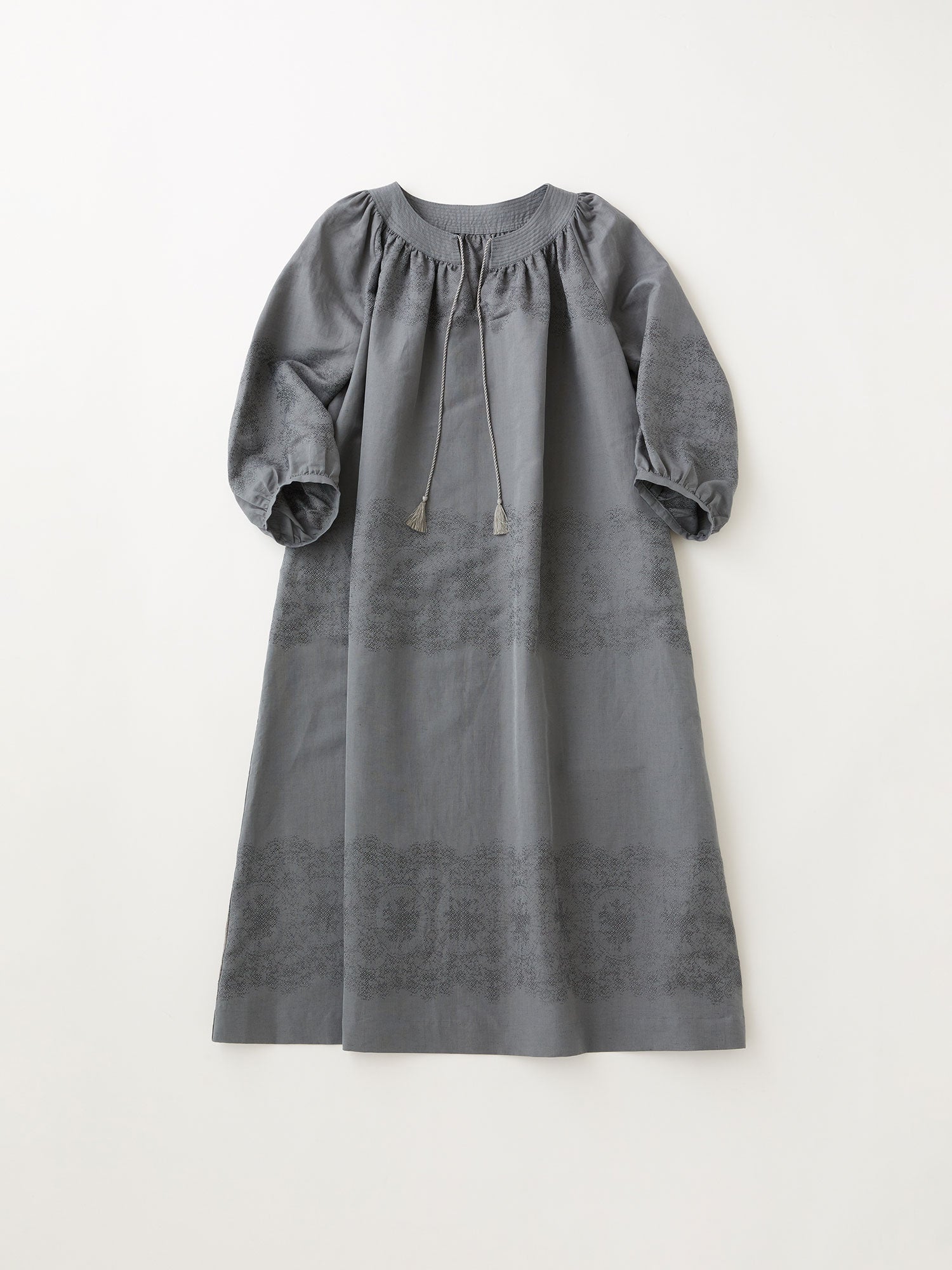 身頃、裾、袖に生地と同色の刺繍。襟元にはギャザーを寄せました。タッセルは結んでリボンにしても、そのまま垂らしてインナーをのぞかせても。