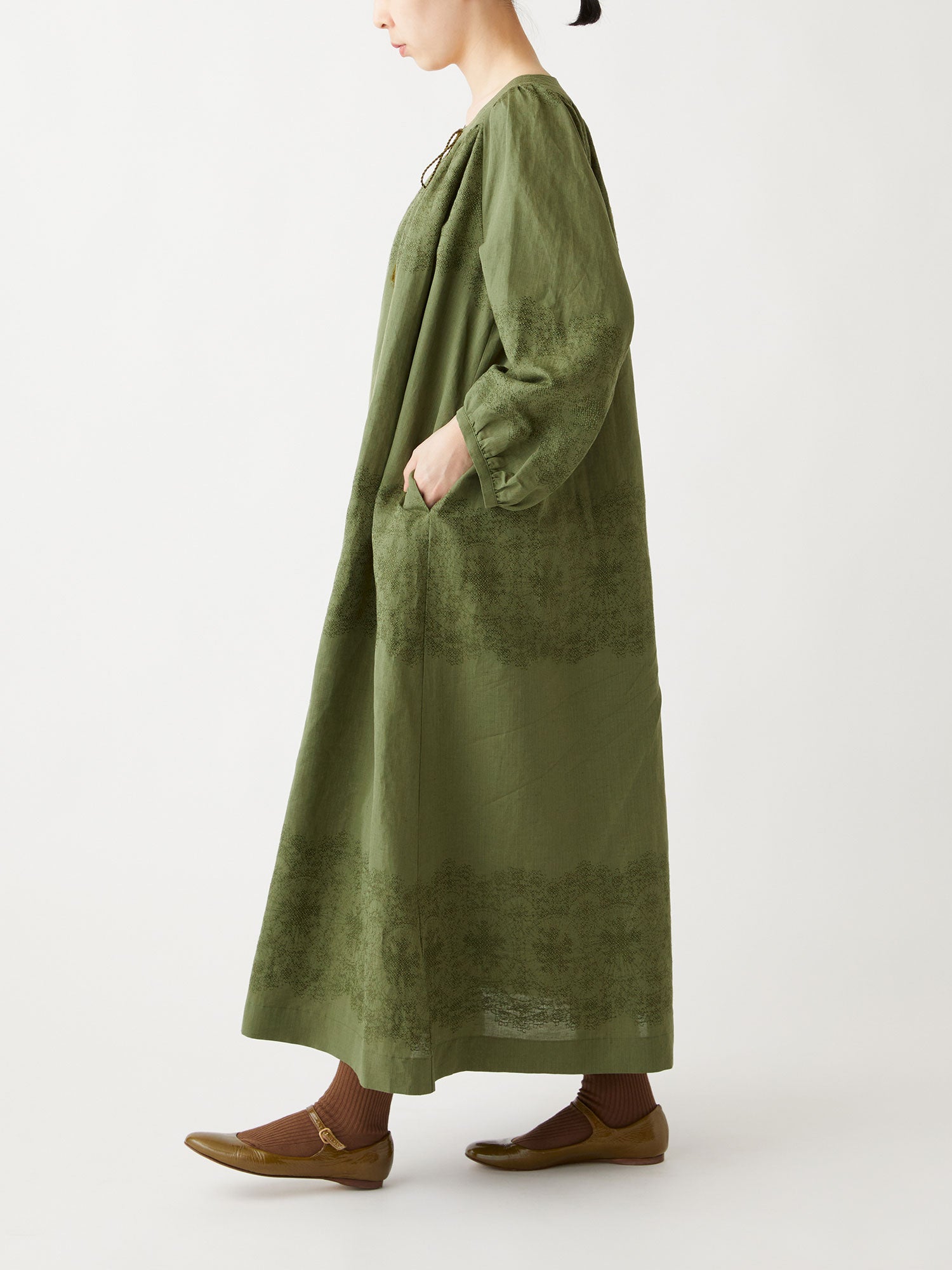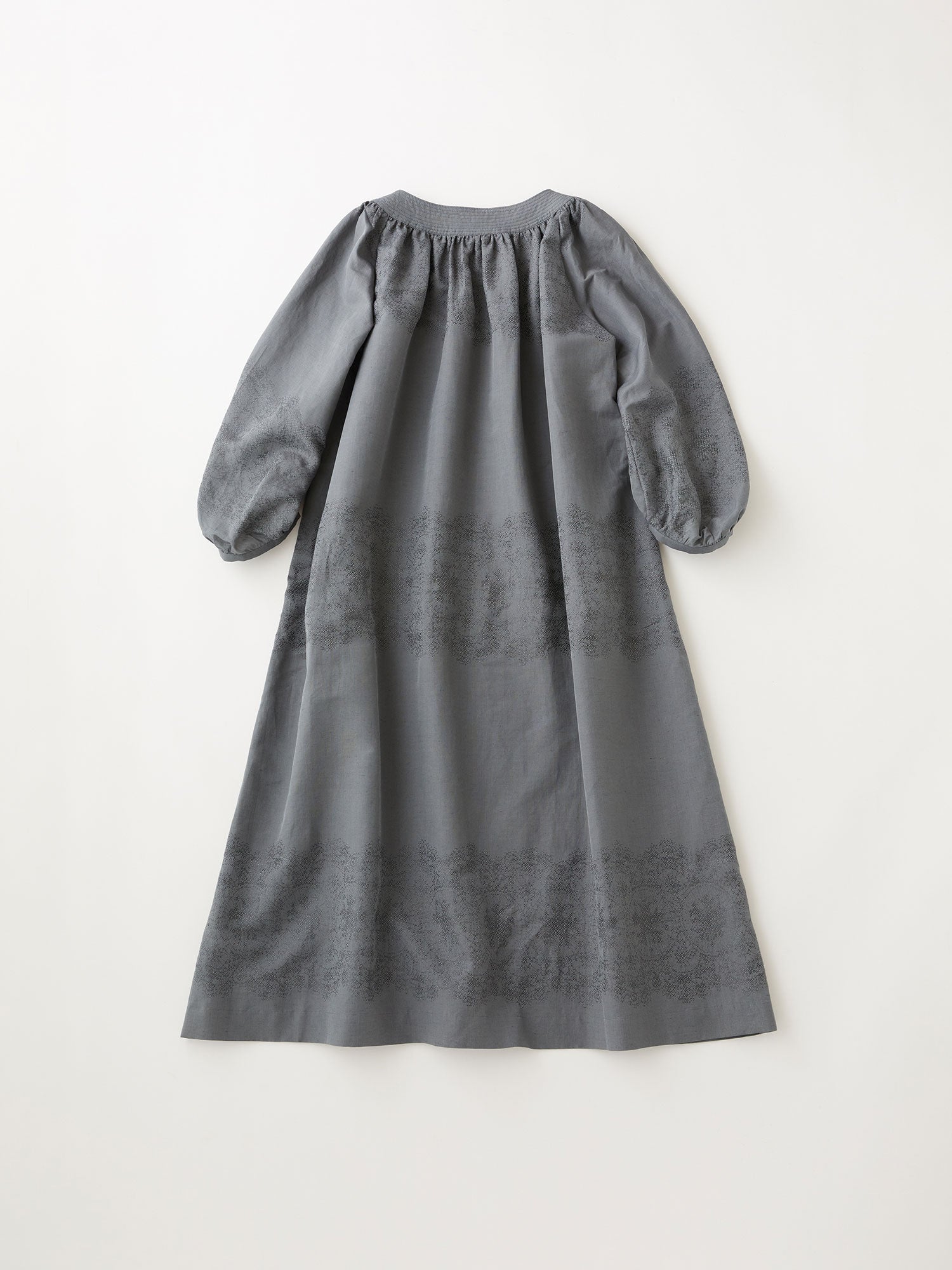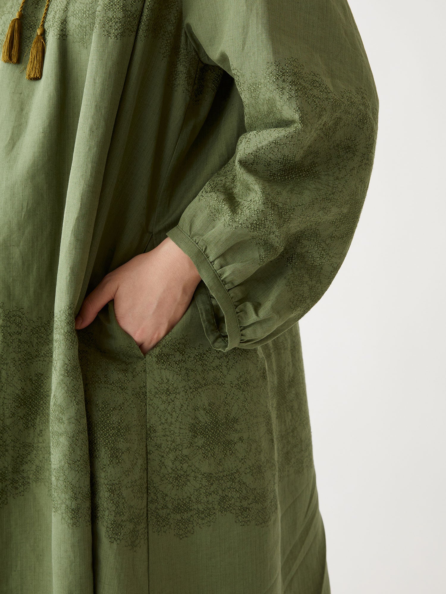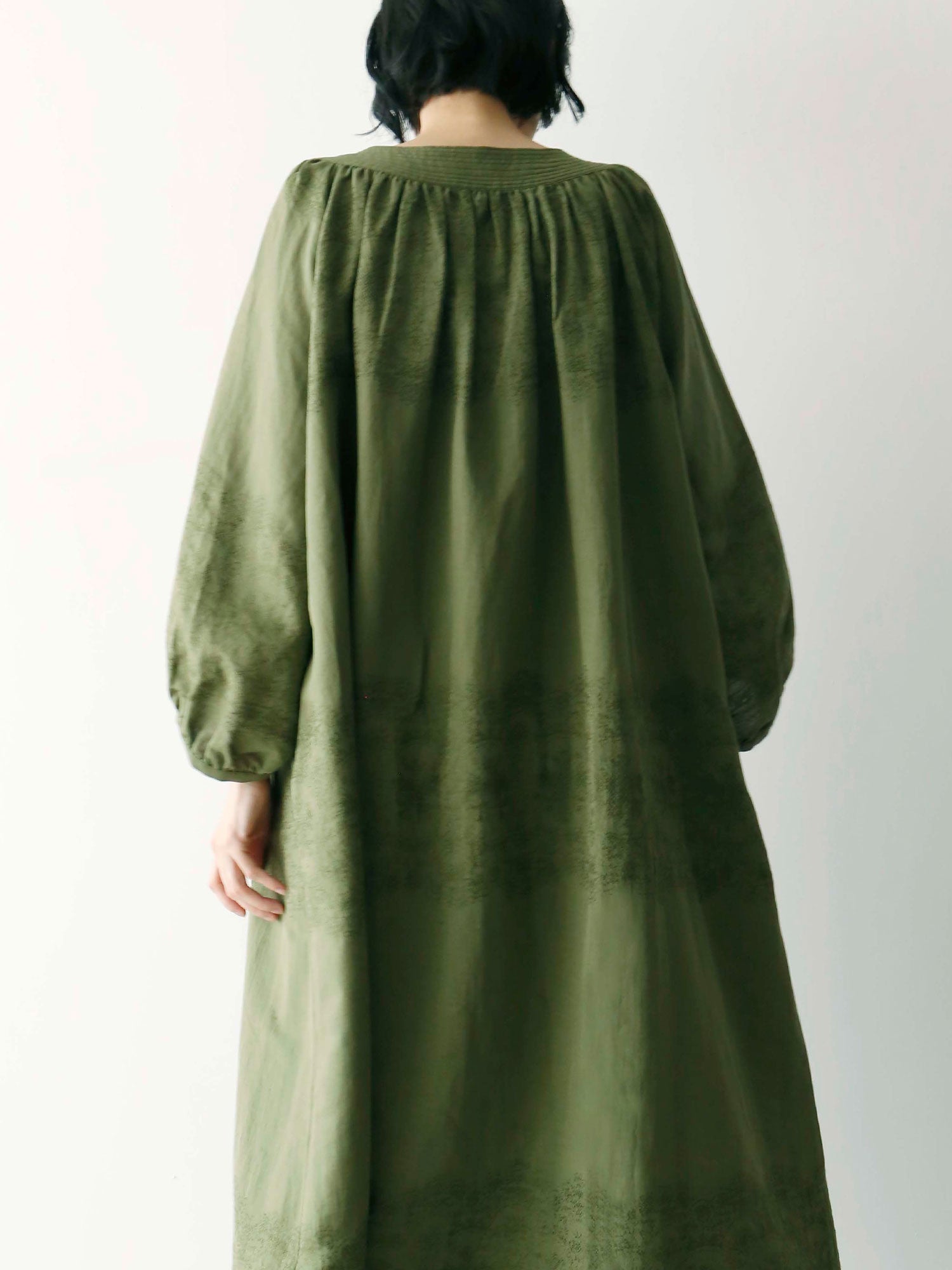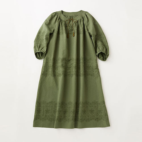 身頃、裾、袖に生地と同色の刺繍。襟元にはギャザーを寄せました。タッセルは結んでリボンにしても、そのまま垂らしてインナーをのぞかせても。