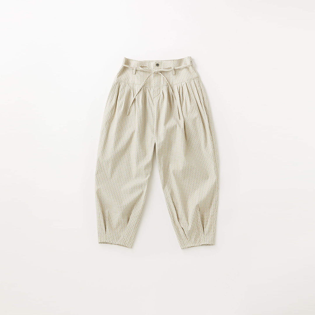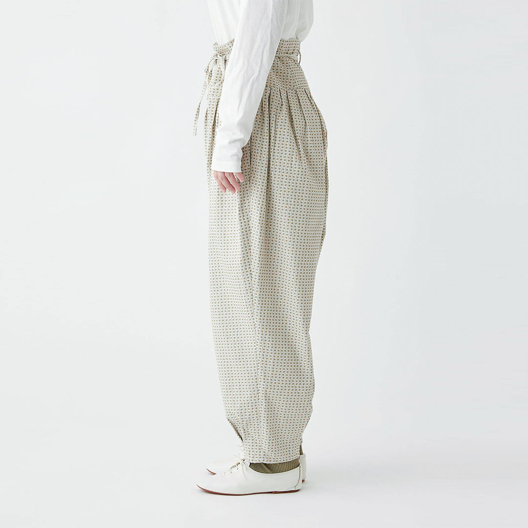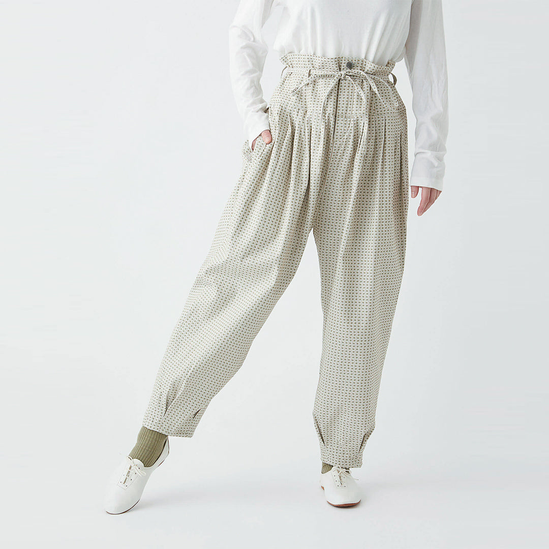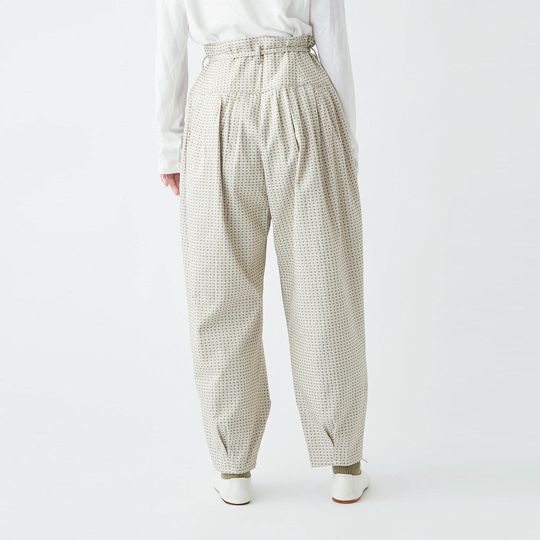 小さな花柄のジャガード生地で仕立てた、どこかクラシカルな雰囲気の漂うパンツ。ウエストにタックを取ったバルーンシルエットは、ボトムスにかけてスッキリとしたライン。コーディネートの主役になる一着です。