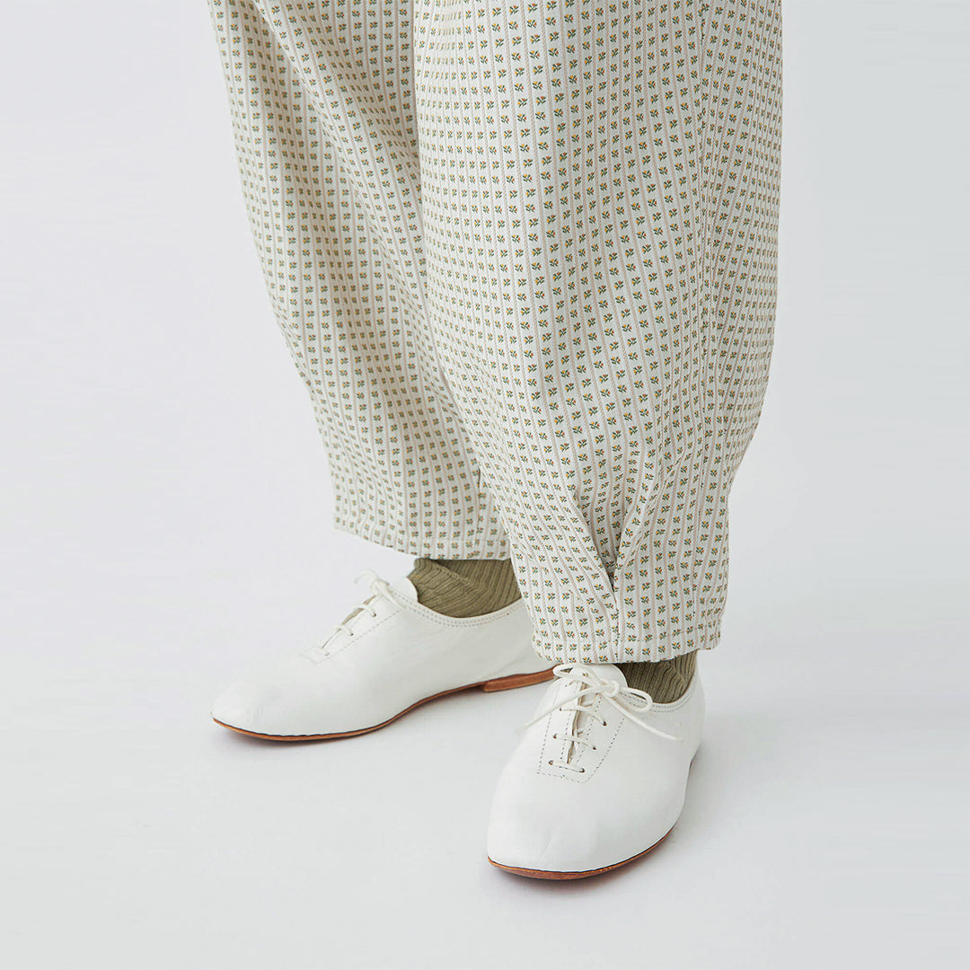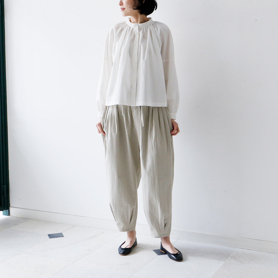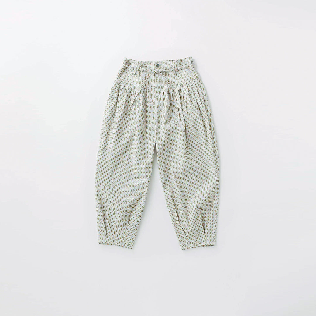 小さな花柄のジャガード生地で仕立てた、どこかクラシカルな雰囲気の漂うパンツ。ウエストにタックを取ったバルーンシルエットは、ボトムスにかけてスッキリとしたライン。コーディネートの主役になる一着です。