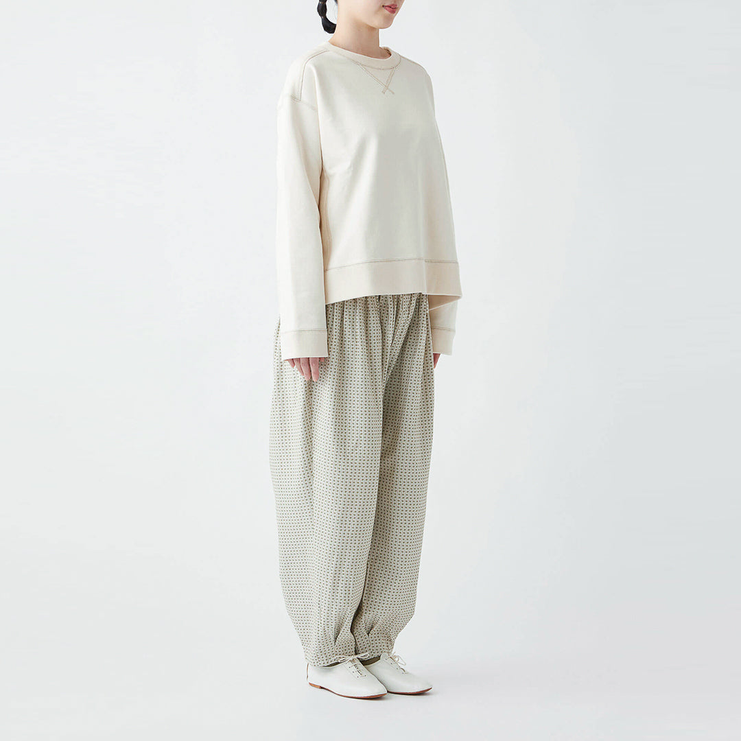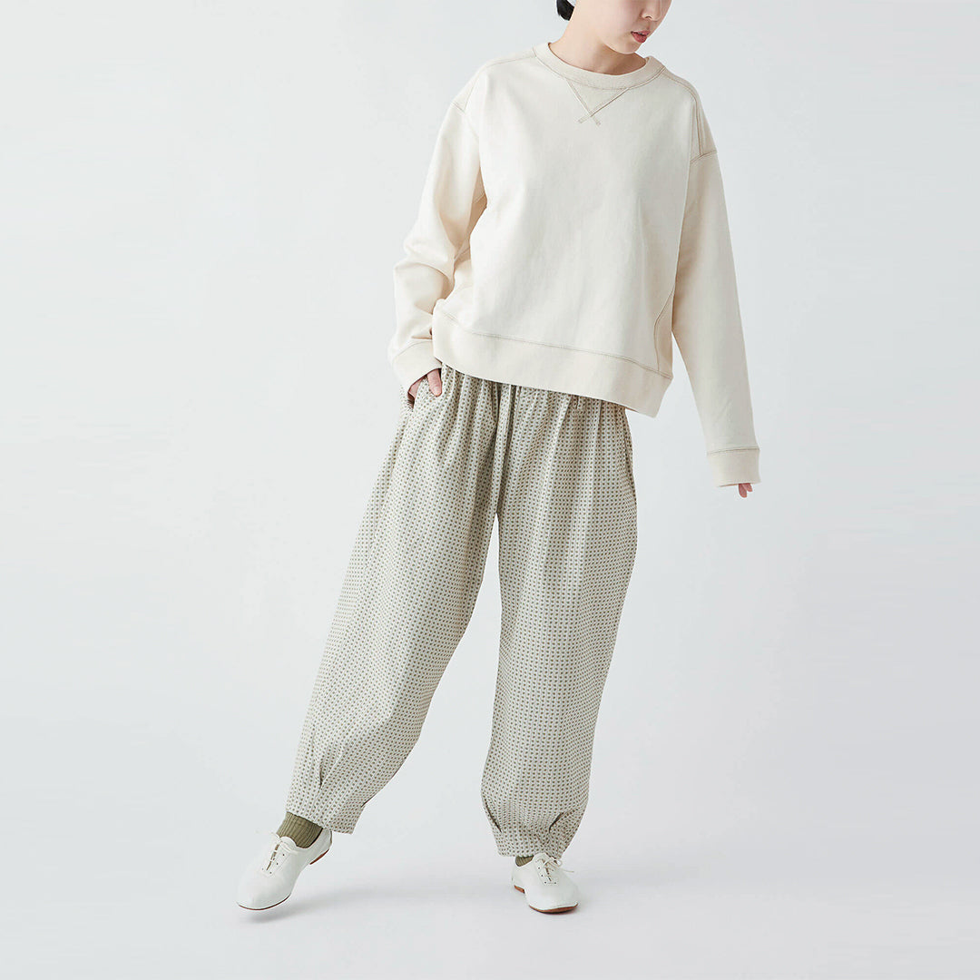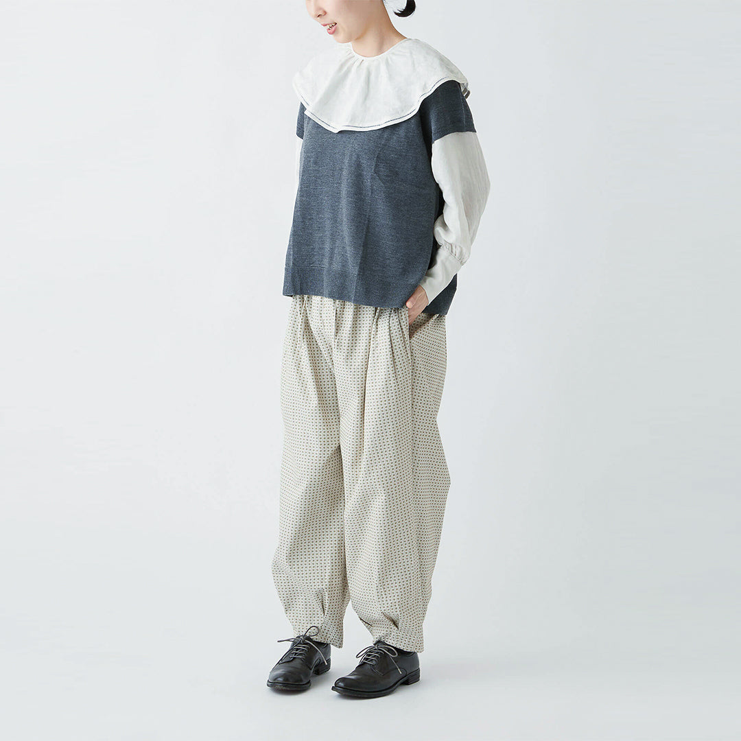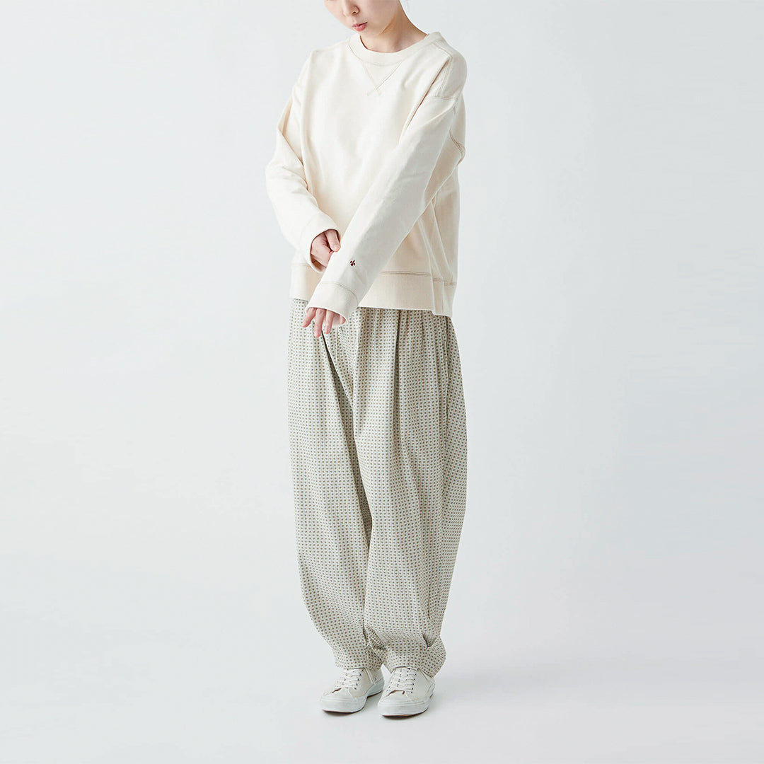 小さな花柄のジャガード生地で仕立てた、どこかクラシカルな雰囲気の漂うパンツ。ウエストにタックを取ったバルーンシルエットは、ボトムスにかけてスッキリとしたライン。コーディネートの主役になる一着です。